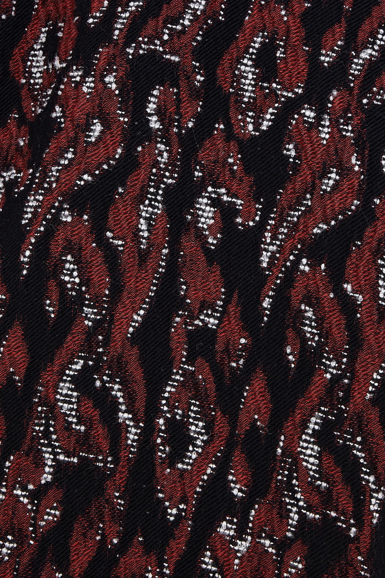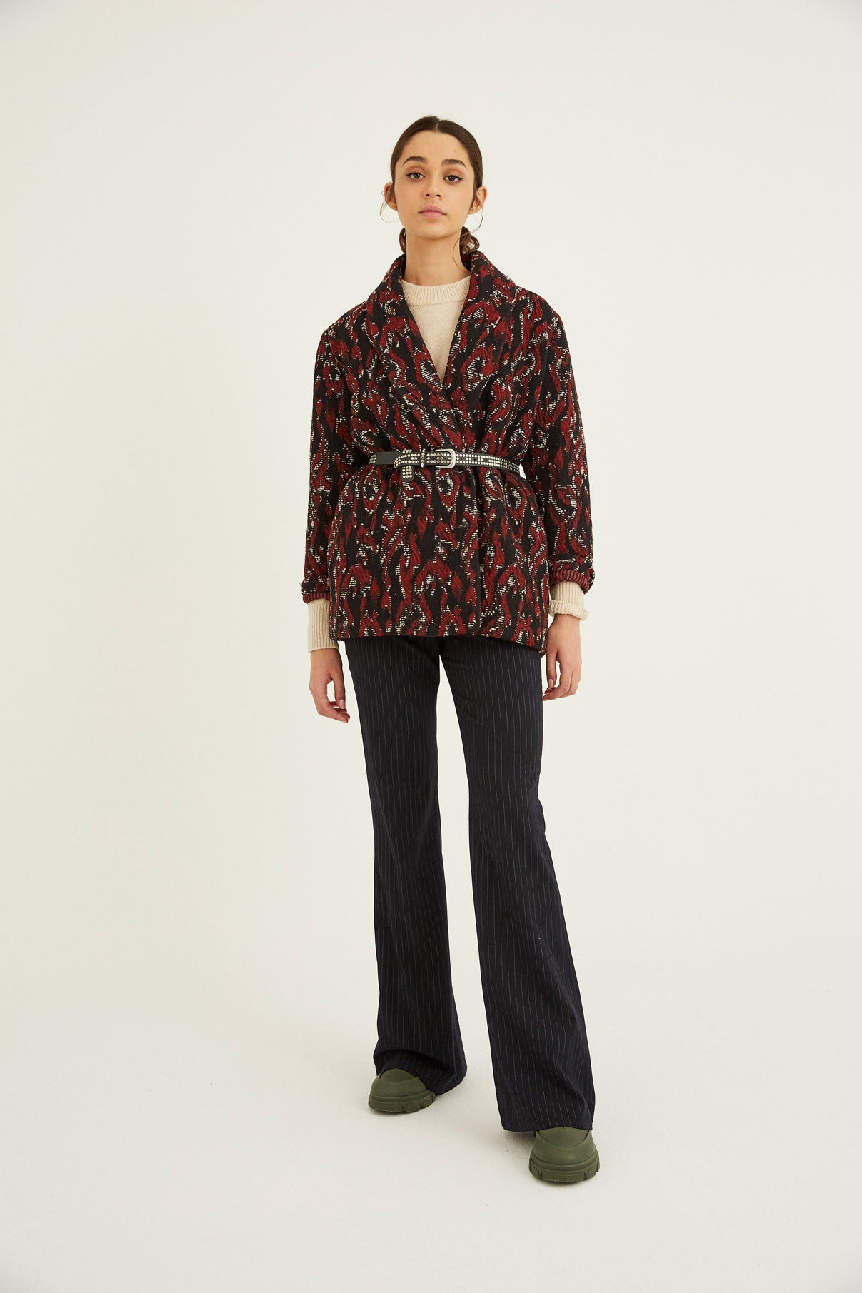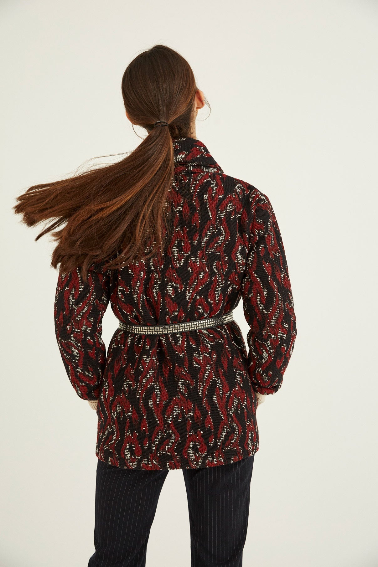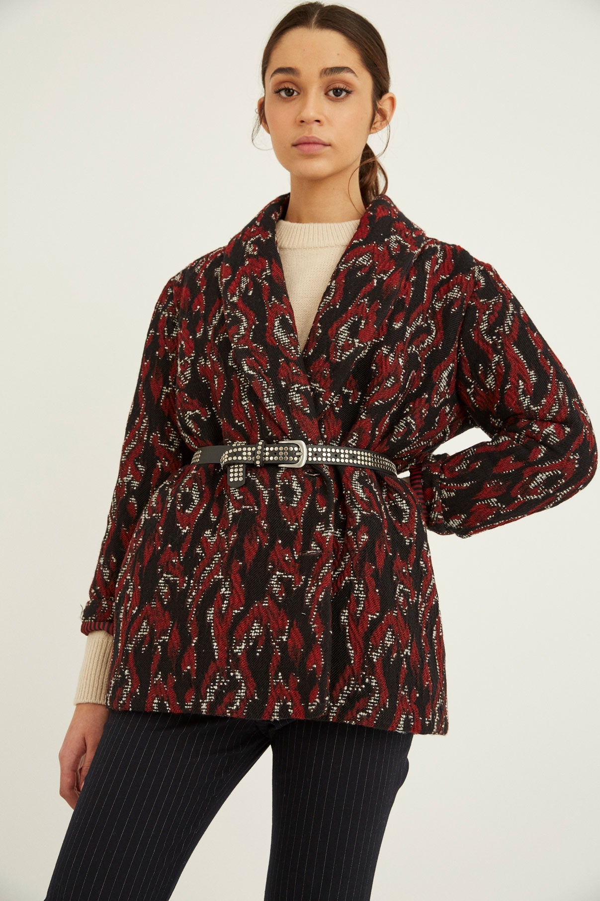 Chaqueta de manga larga confeccionada en tejido de lana estampado con cuello de solapa, cierre frontal con botones y bolsillos laterales.