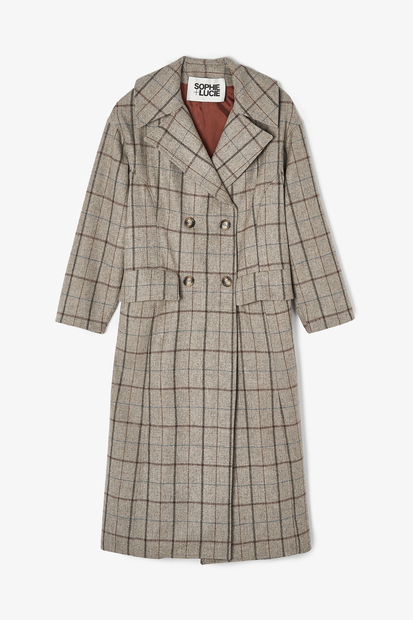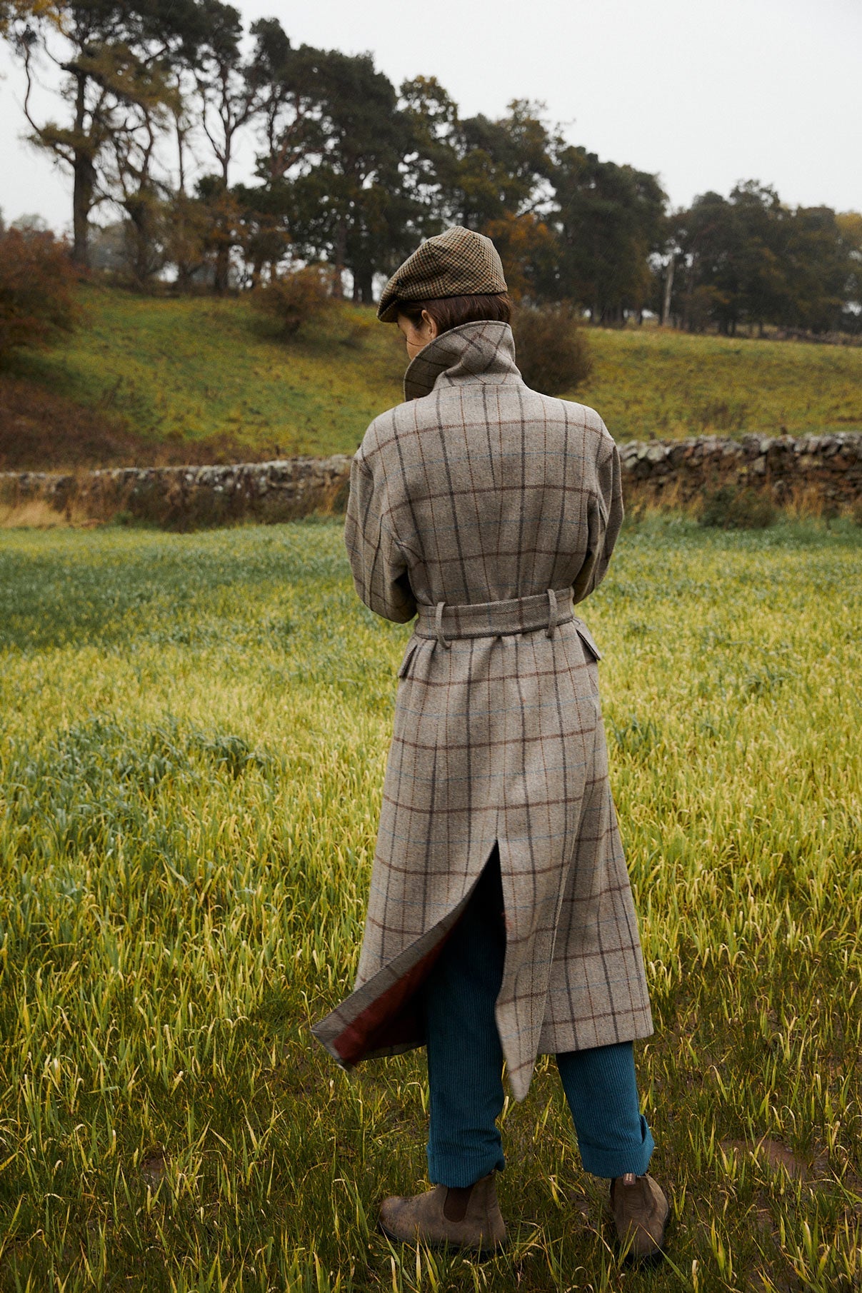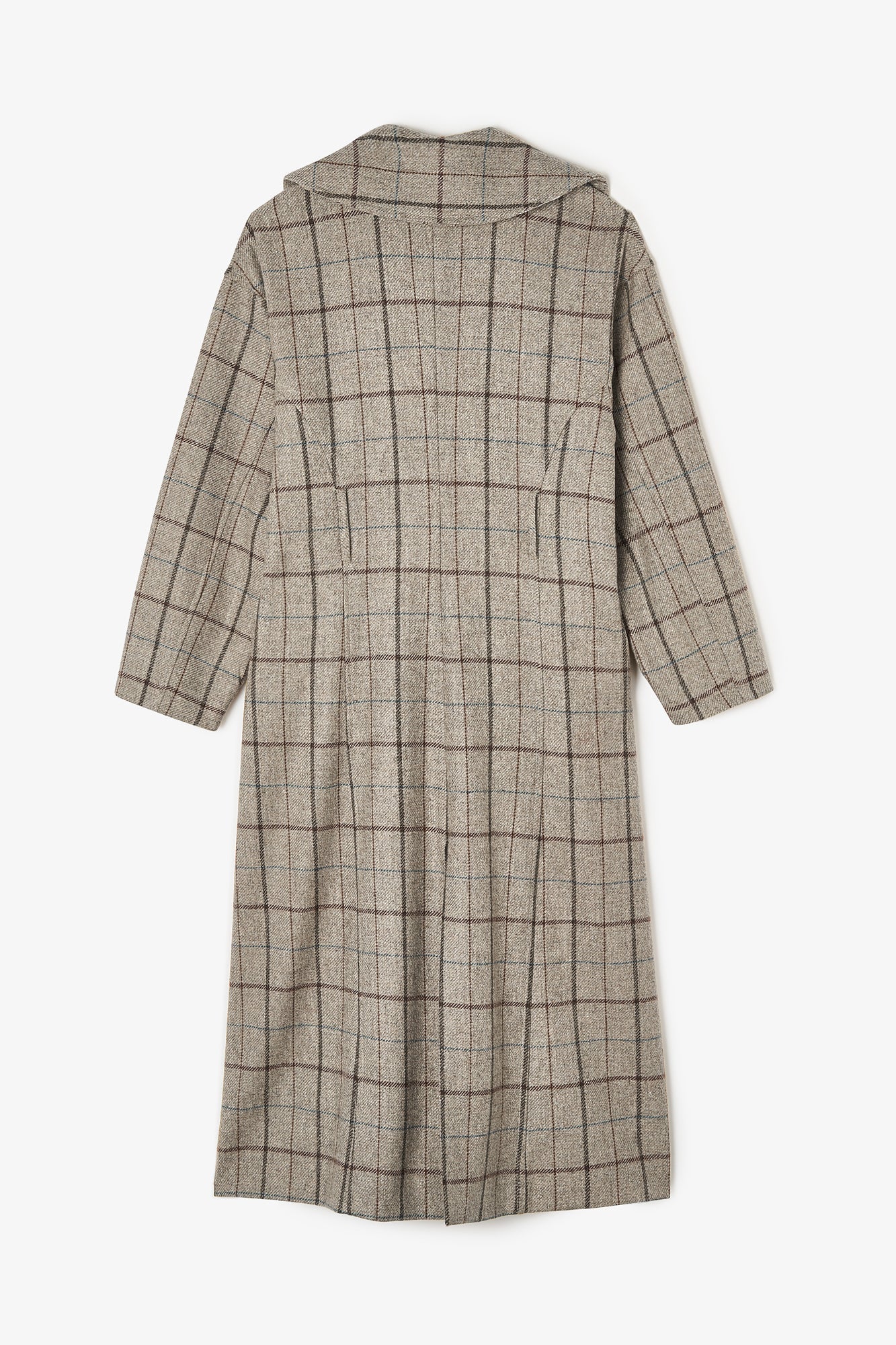 Abrigo oversize en tejido estampado de cuadros. Cierre cruzado con cuatro botones en el frontal y cinturón en el mismo tejido. Bolsillos de solapa en el mismo tejido.