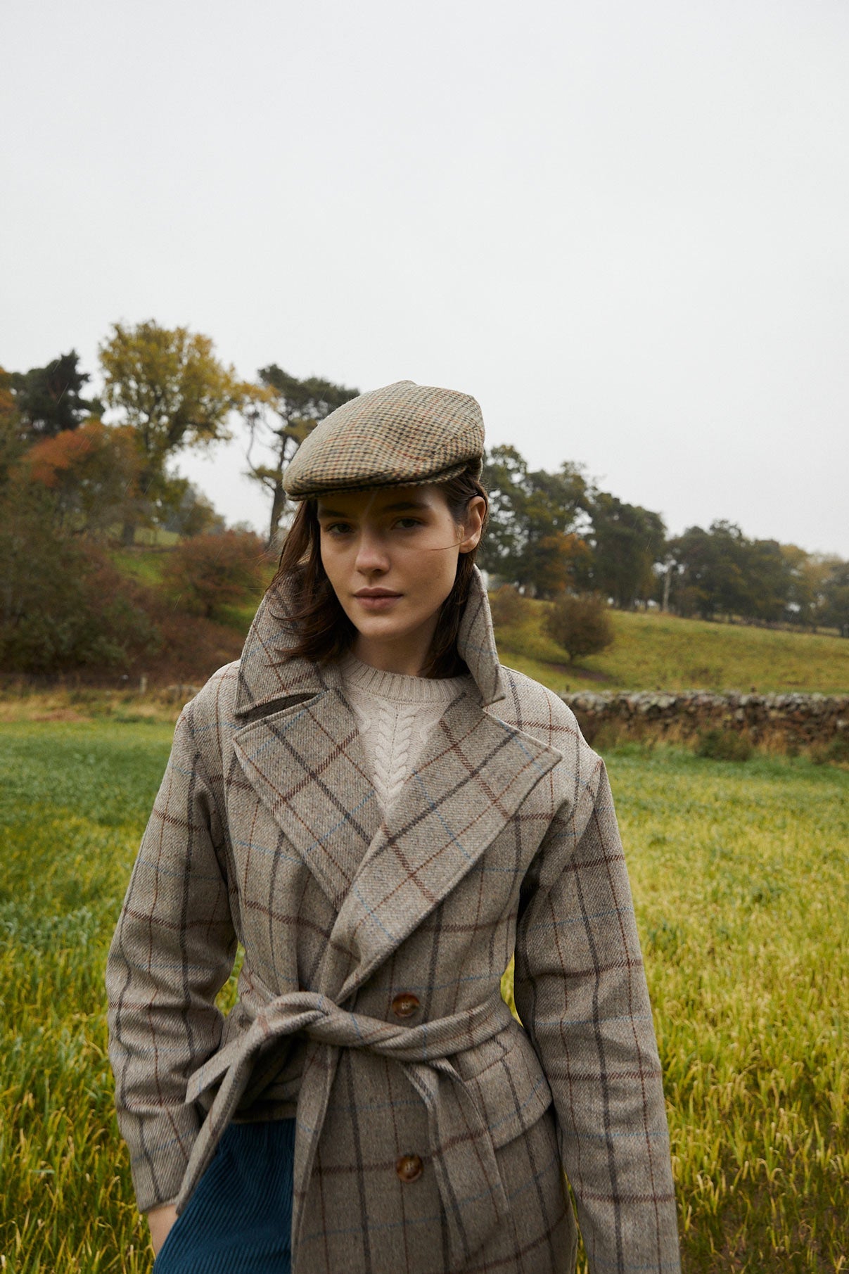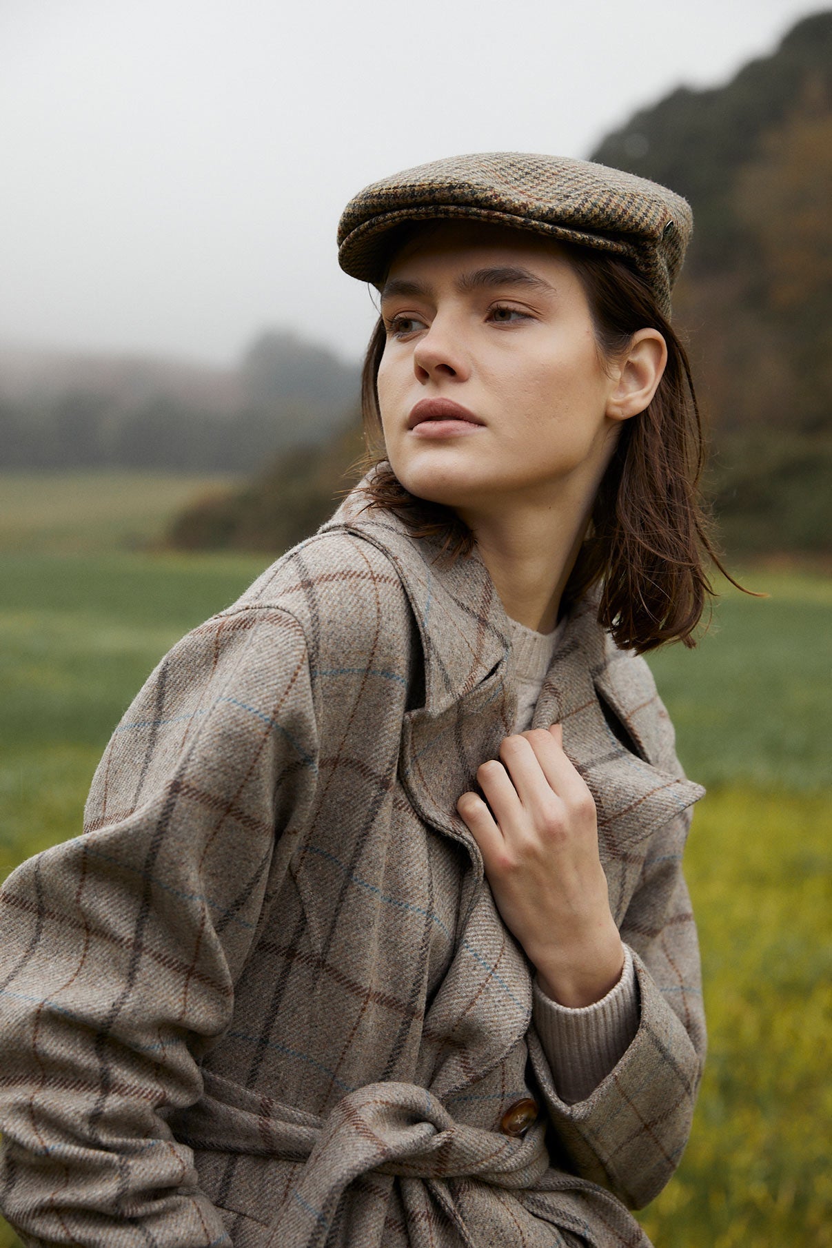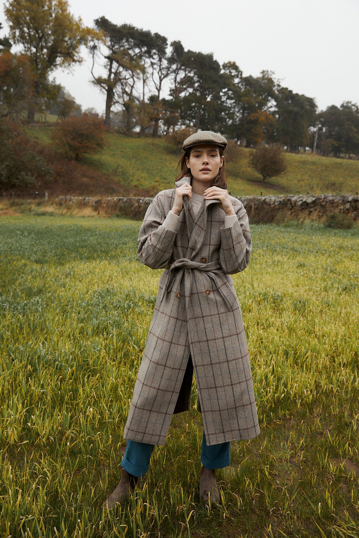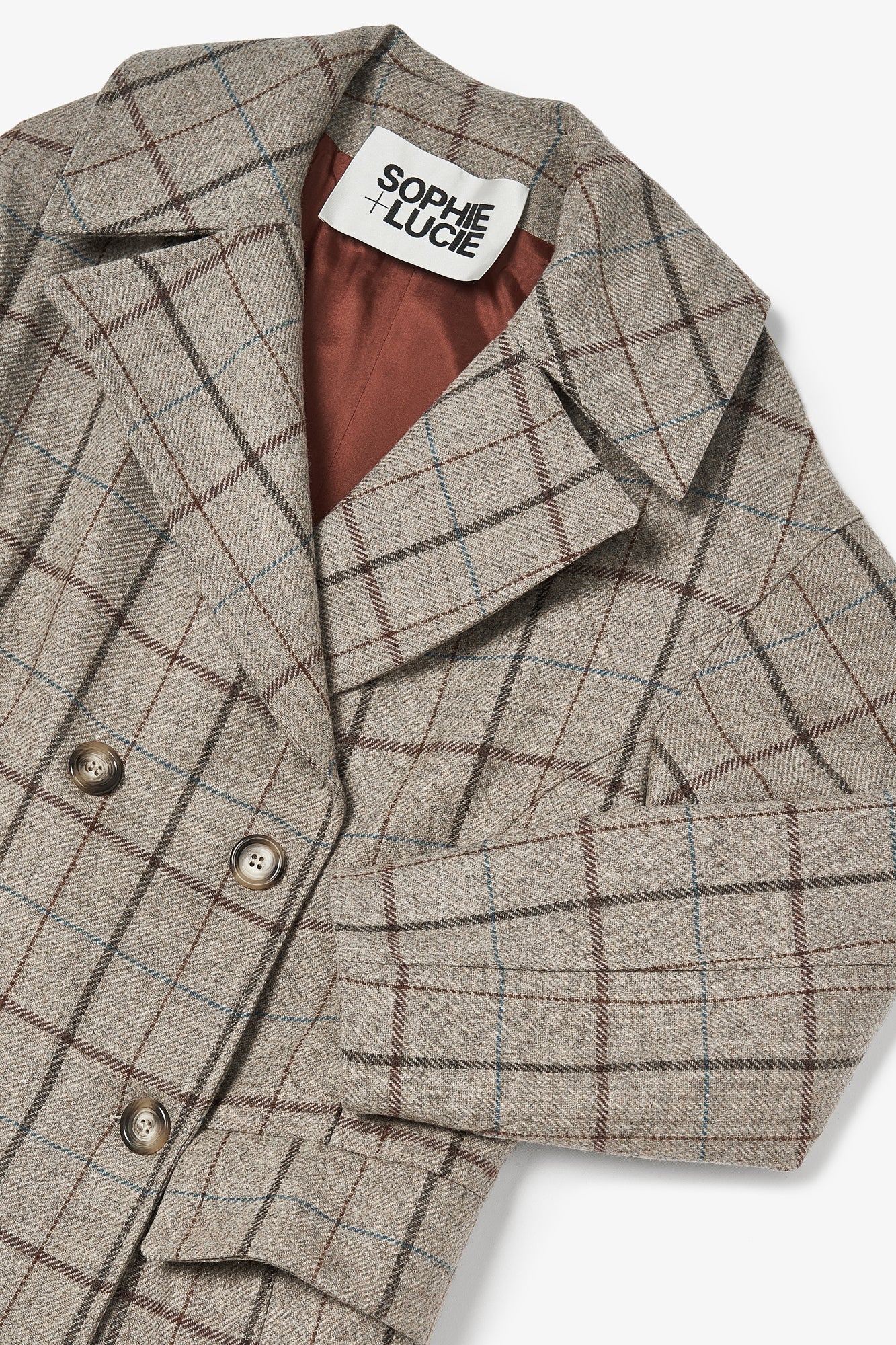 Abrigo oversize en tejido estampado de cuadros. Cierre cruzado con cuatro botones en el frontal y cinturón en el mismo tejido. Bolsillos de solapa en el mismo tejido.