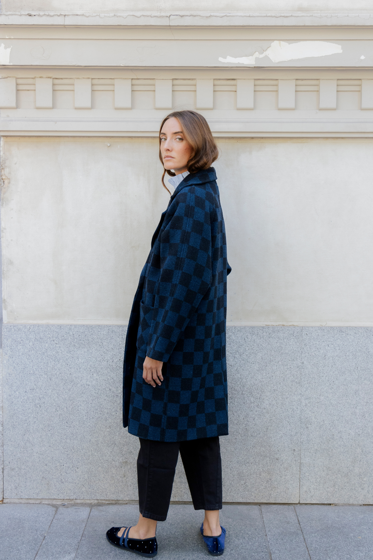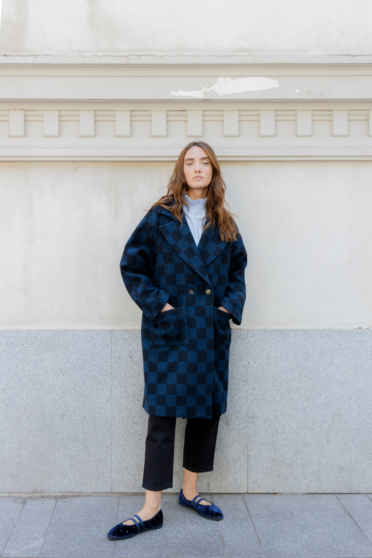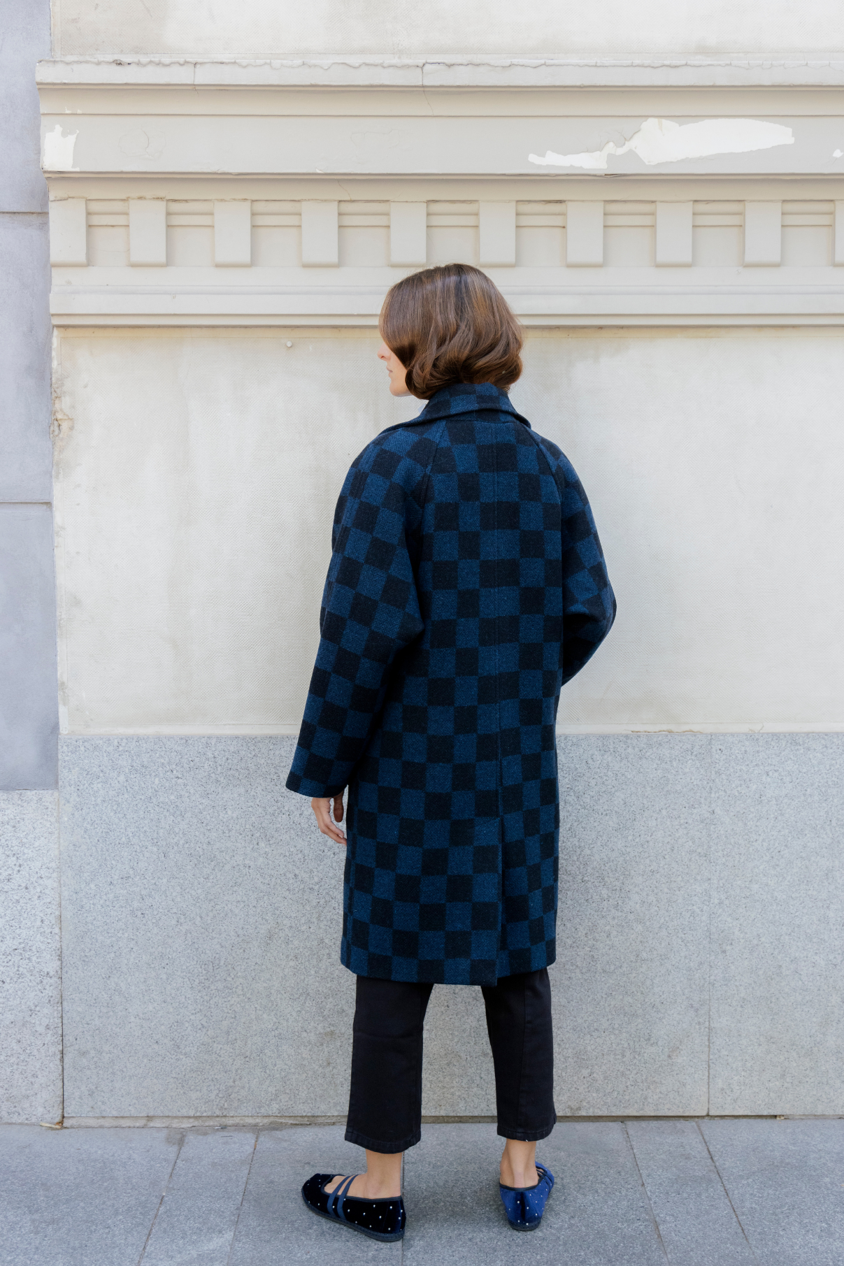Abrigo oversize en tejido estampado de cuadros. Bolsillos en los laterales. Cierre cruzado con dos botones carey en el frontal.