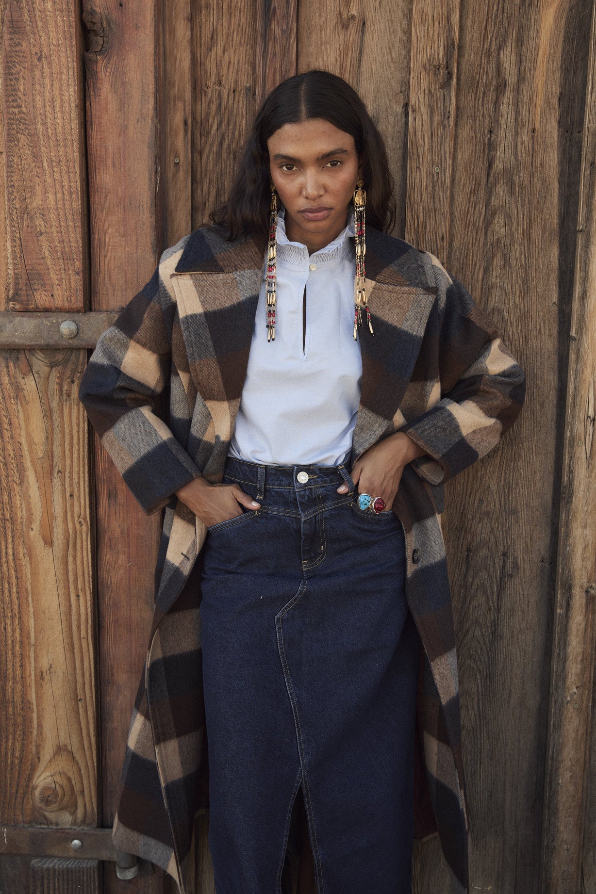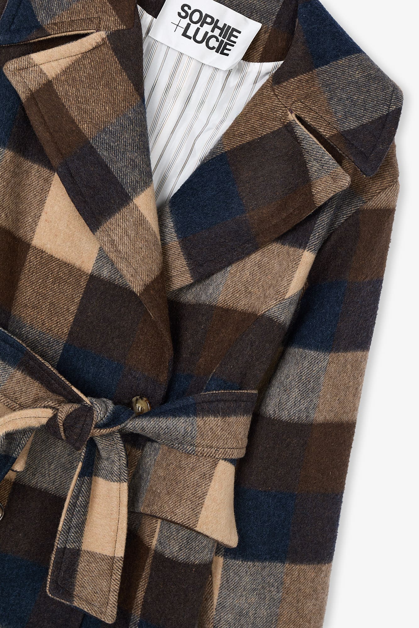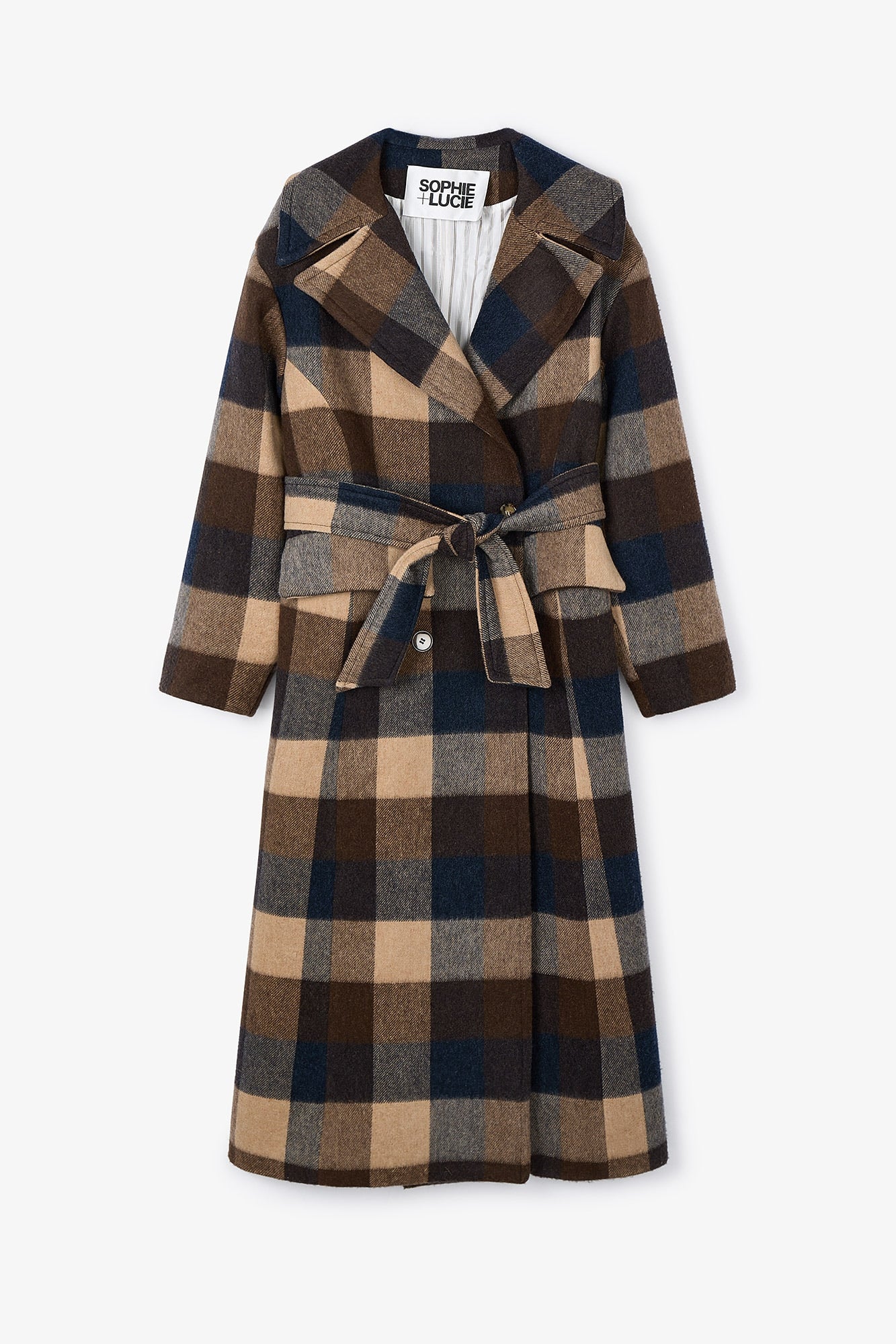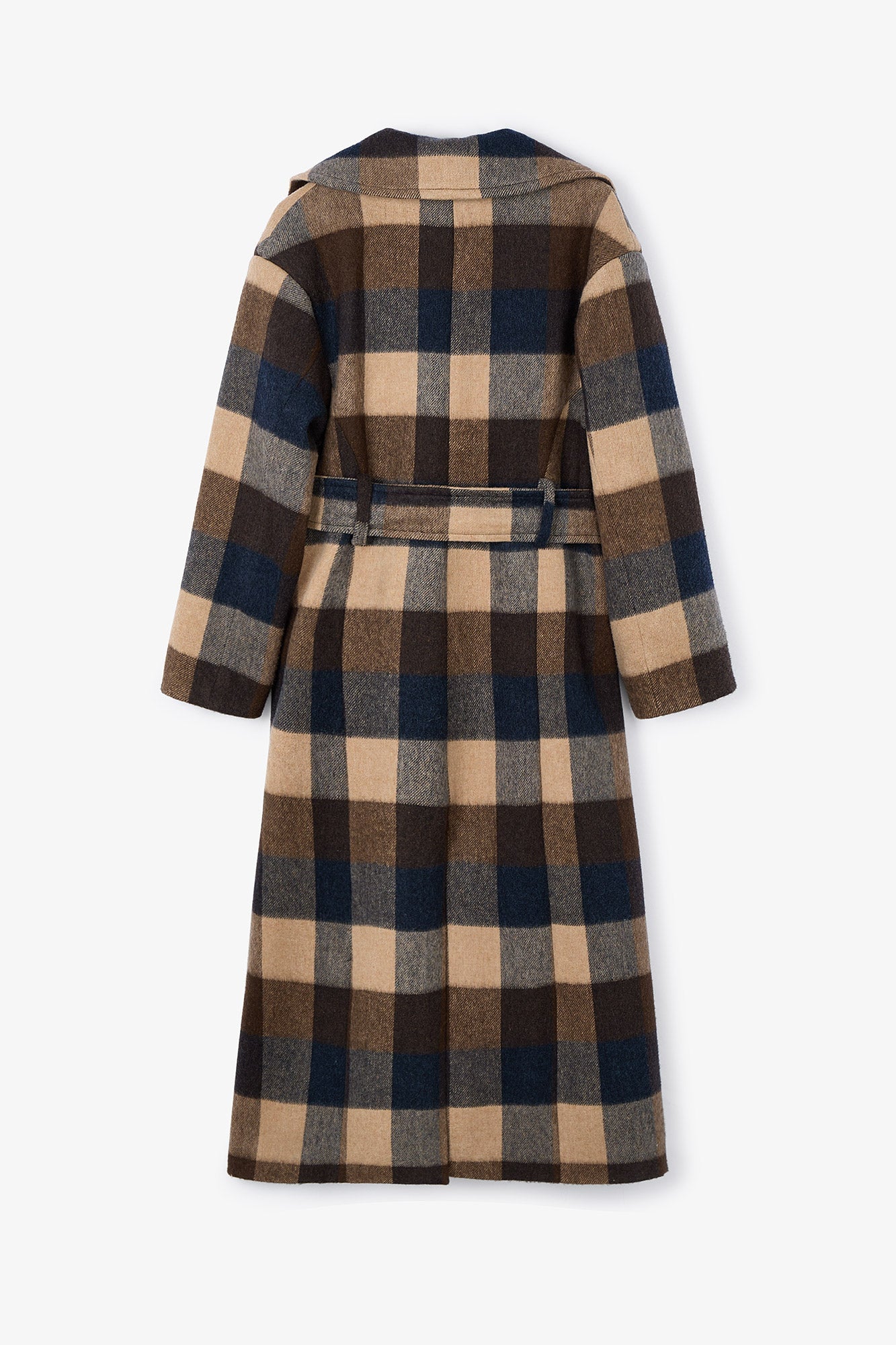 Abrigo oversize en tejido estampado de cuadros. Bolsillos de solapa. Cierre cruzado con cuatro botones en el frontal y cinturón en el mismo tejido.