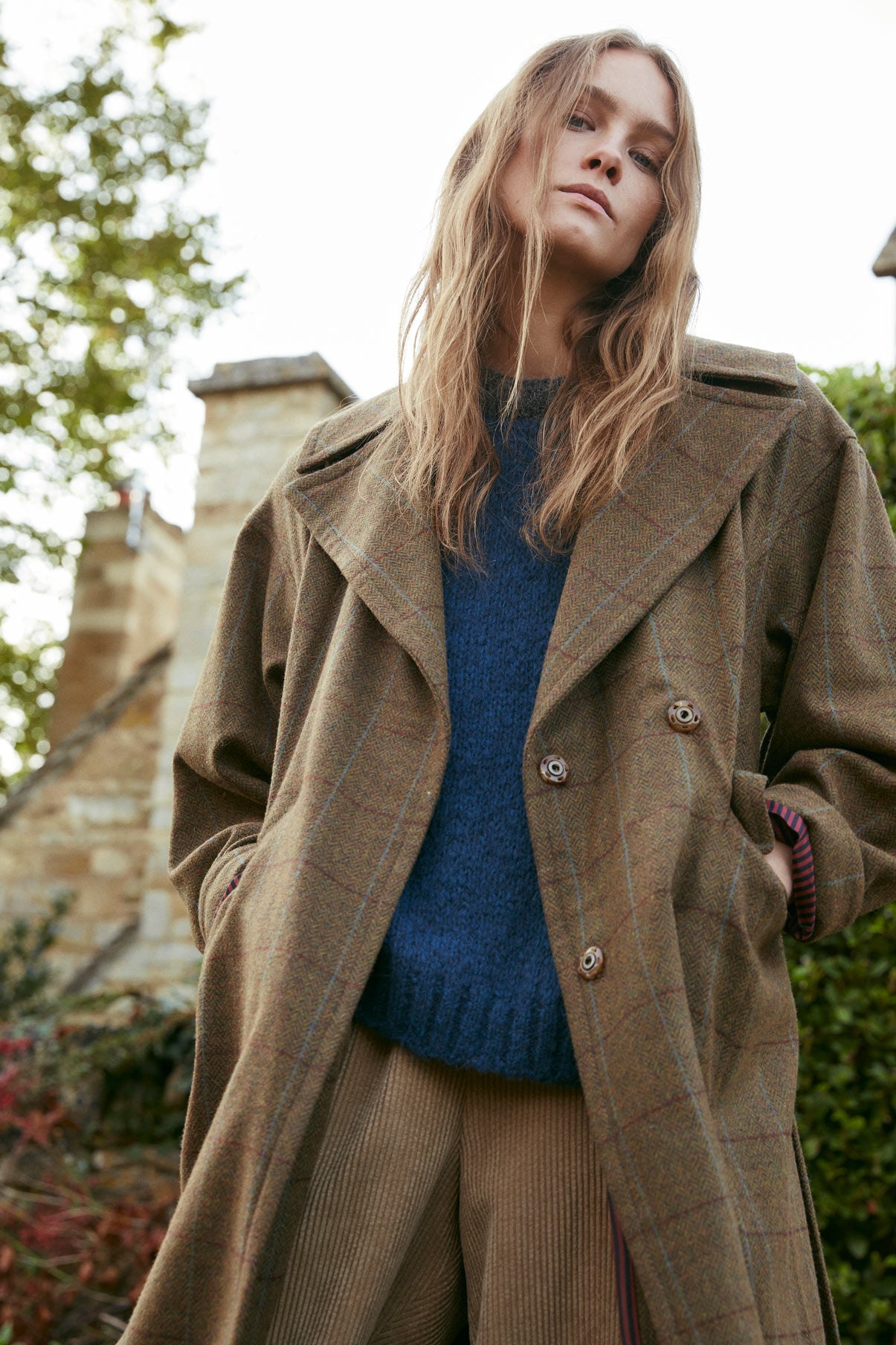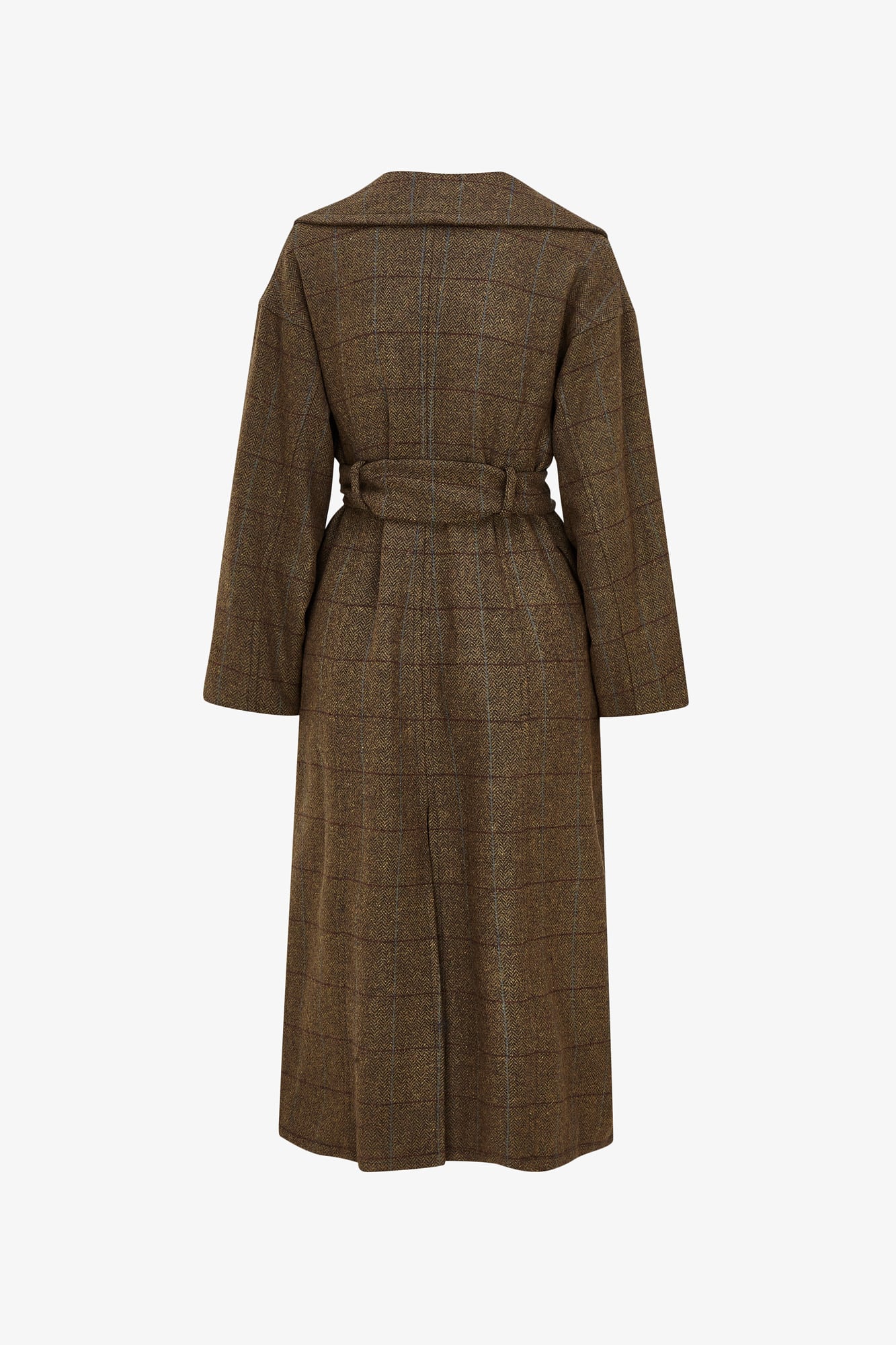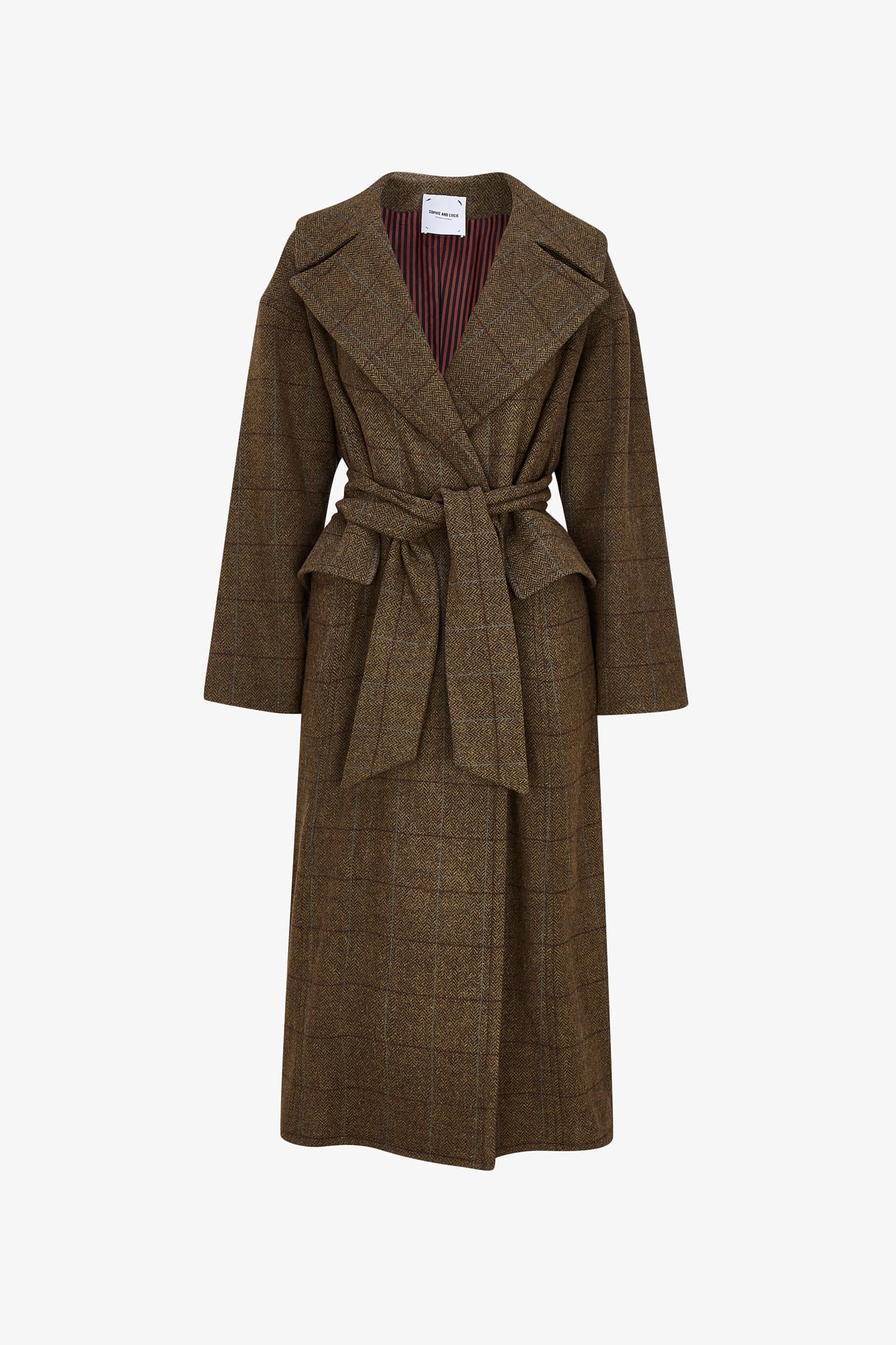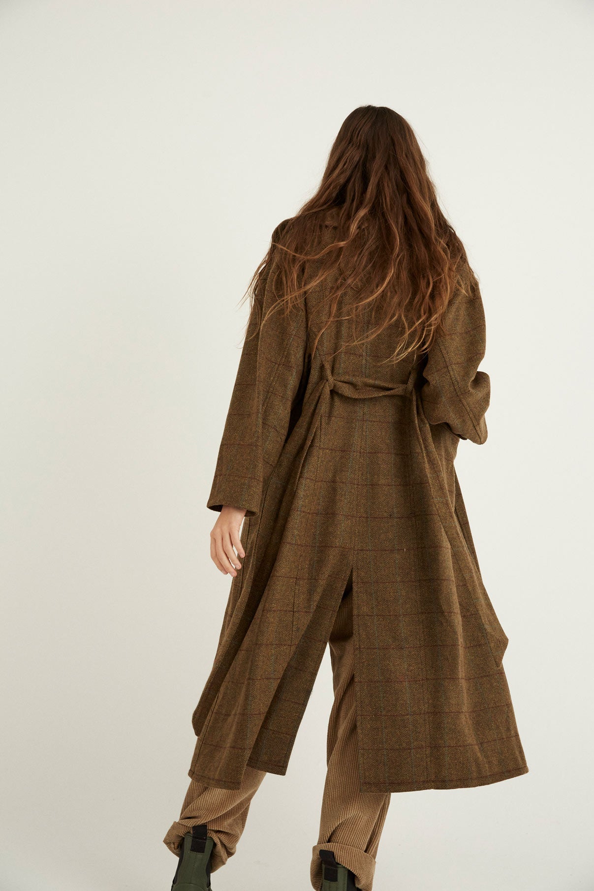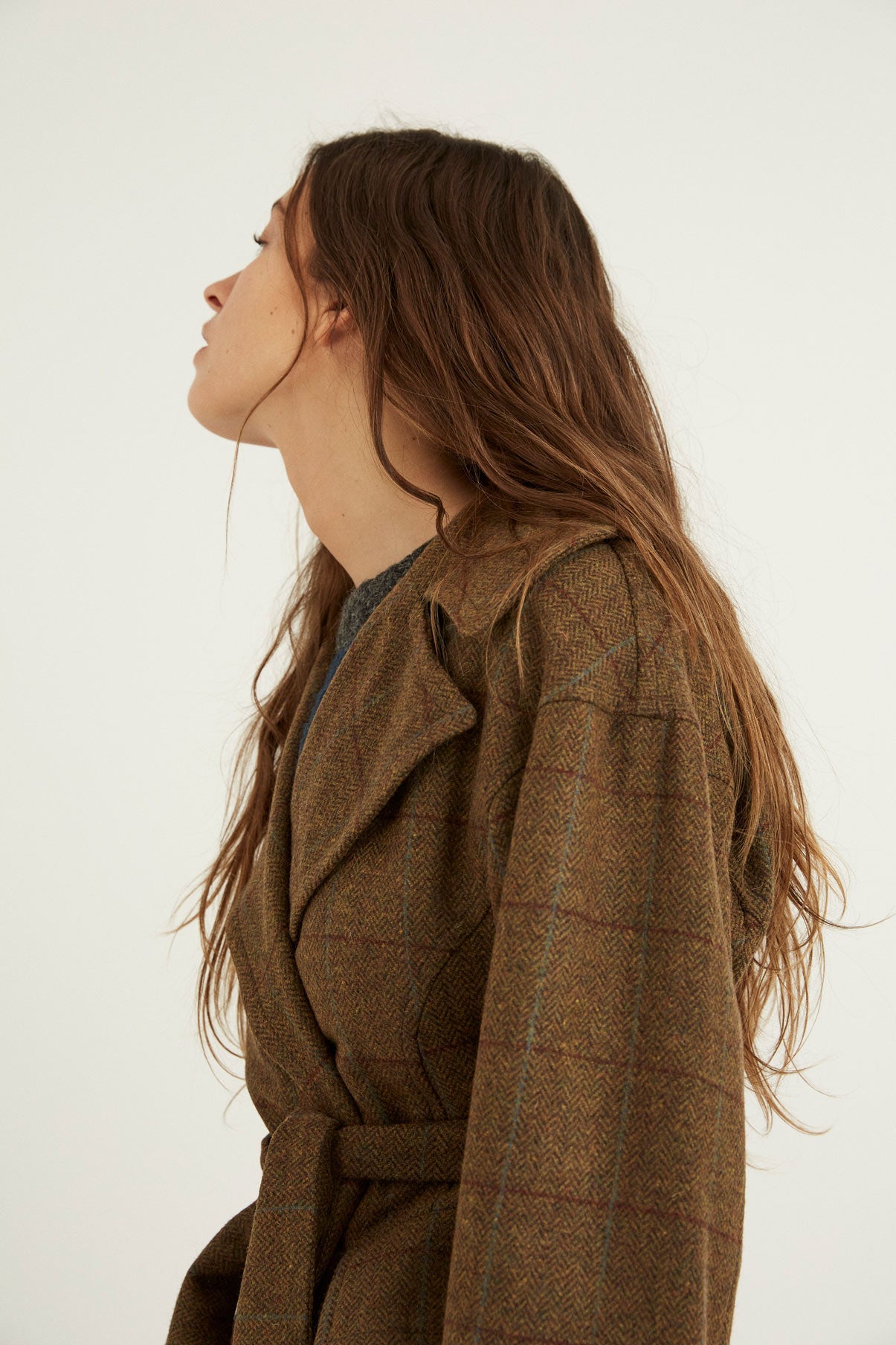 Abrigo largo con fit oversize confeccionado en tejido mezcla de lana. Cuello de solapa, bolsillos en el frontal y cinturón a modo de lazada.