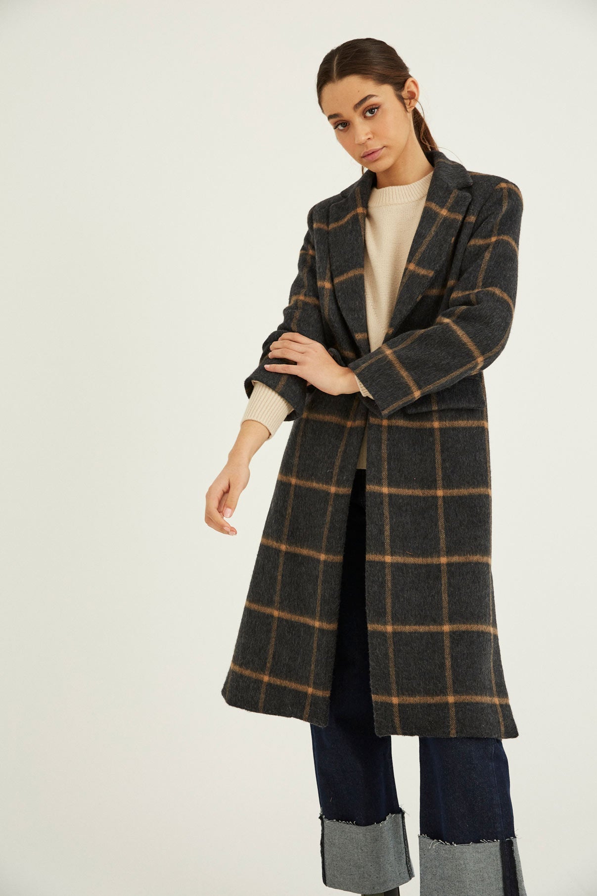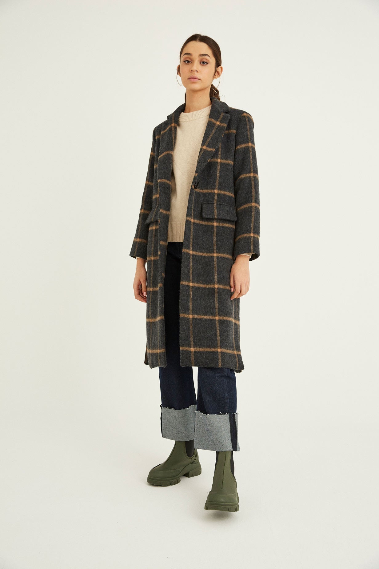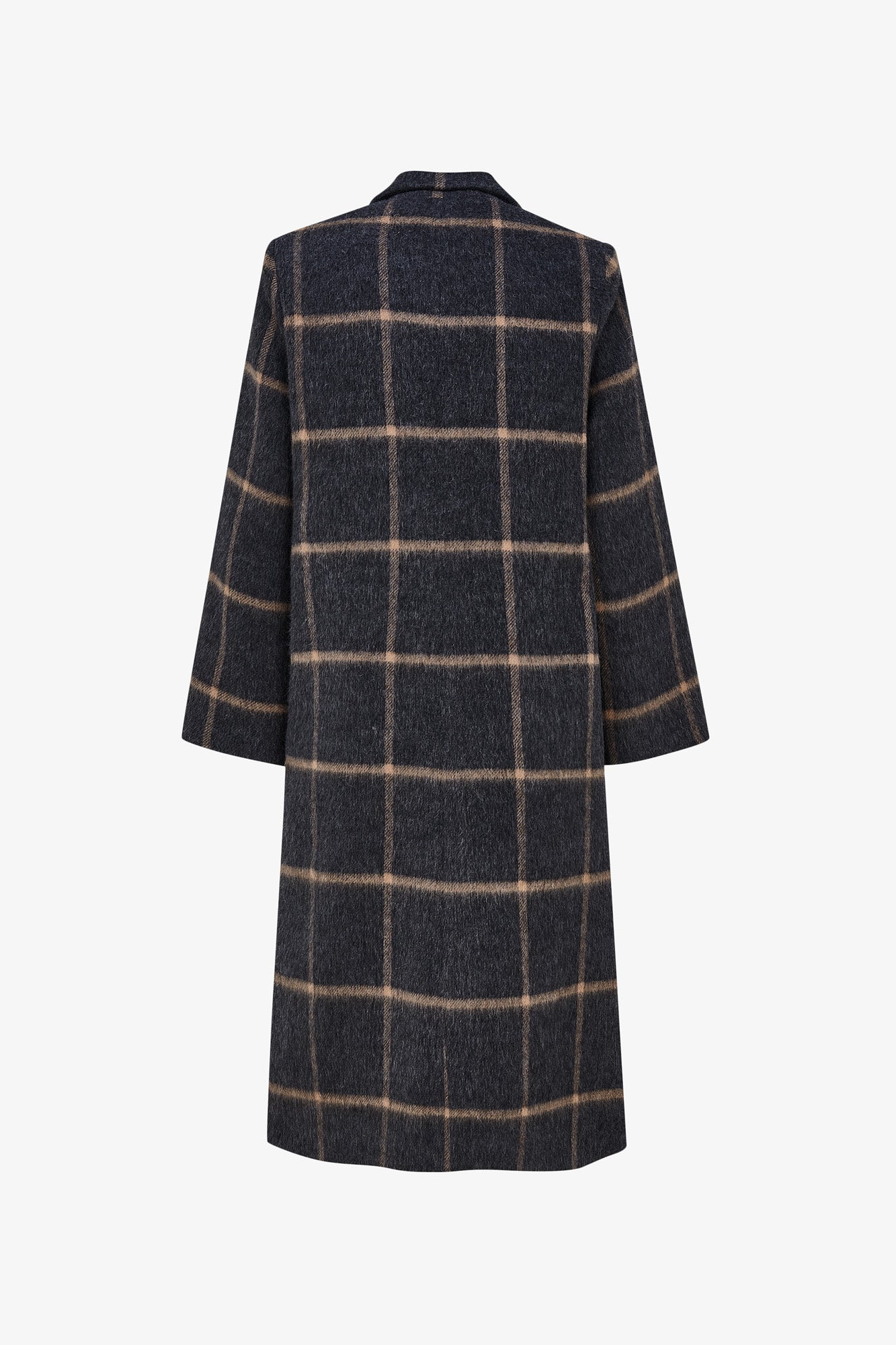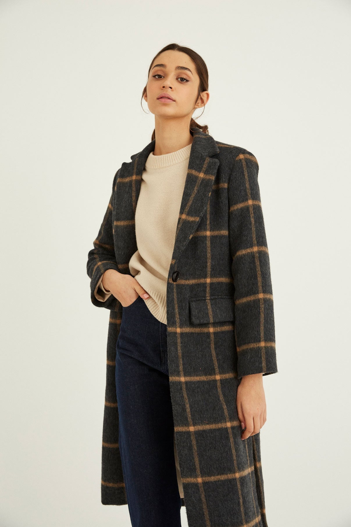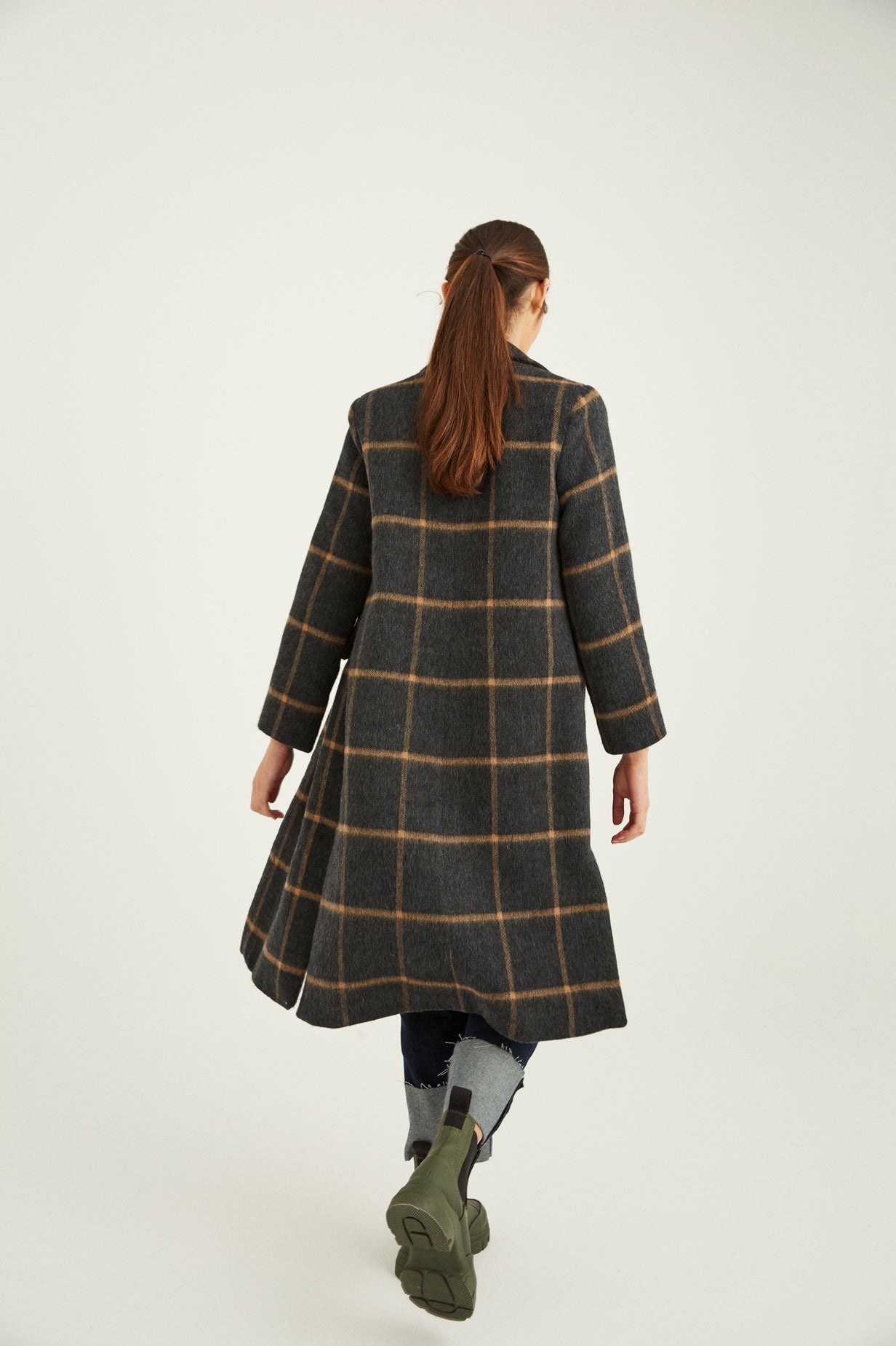 Abrigo con manga larga, hombro marcado y solapa larga. Cierre con botón central. Para darle mas movimiento a la prenda le hemos añadido dos aberturas laterales.