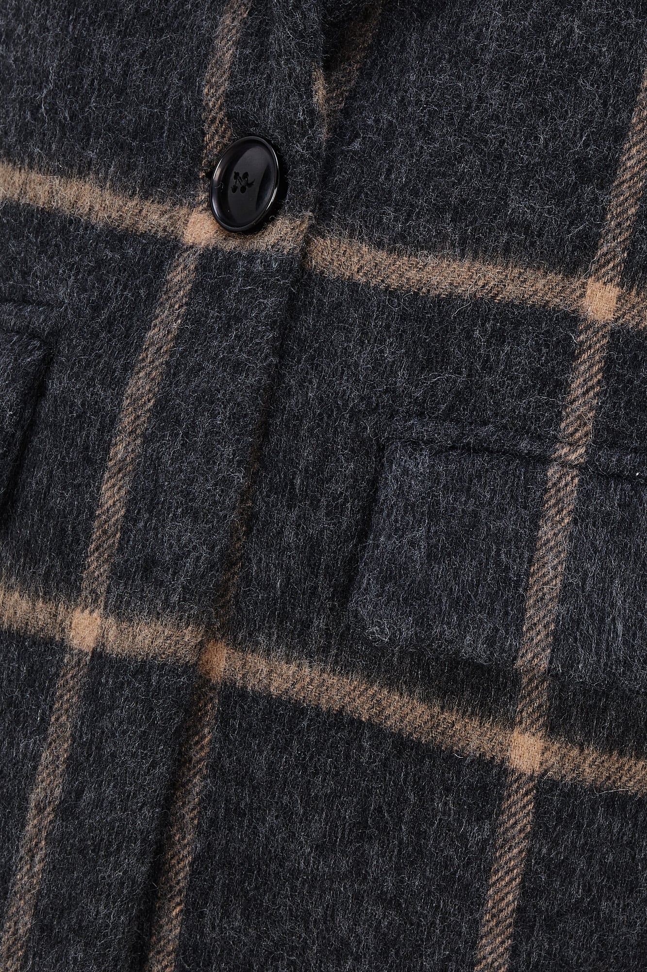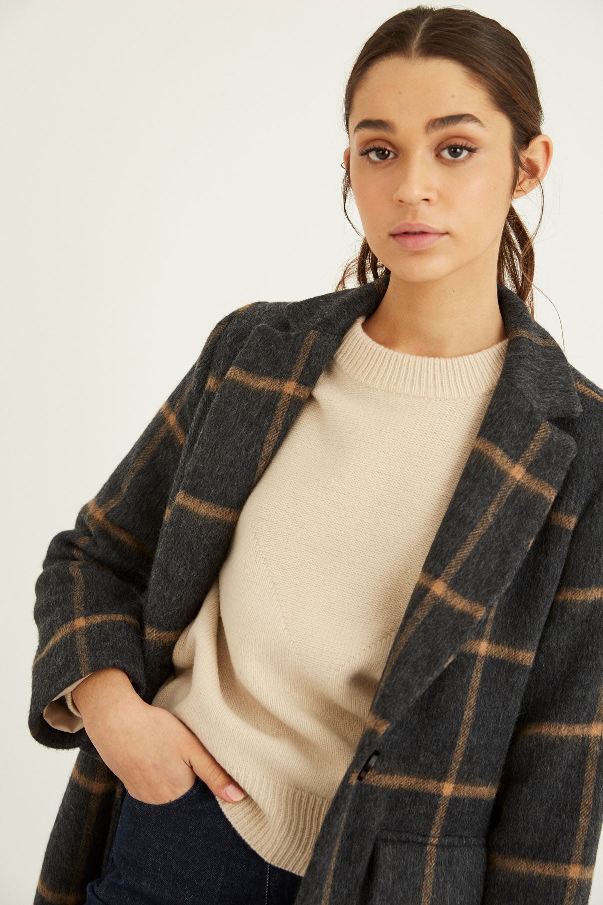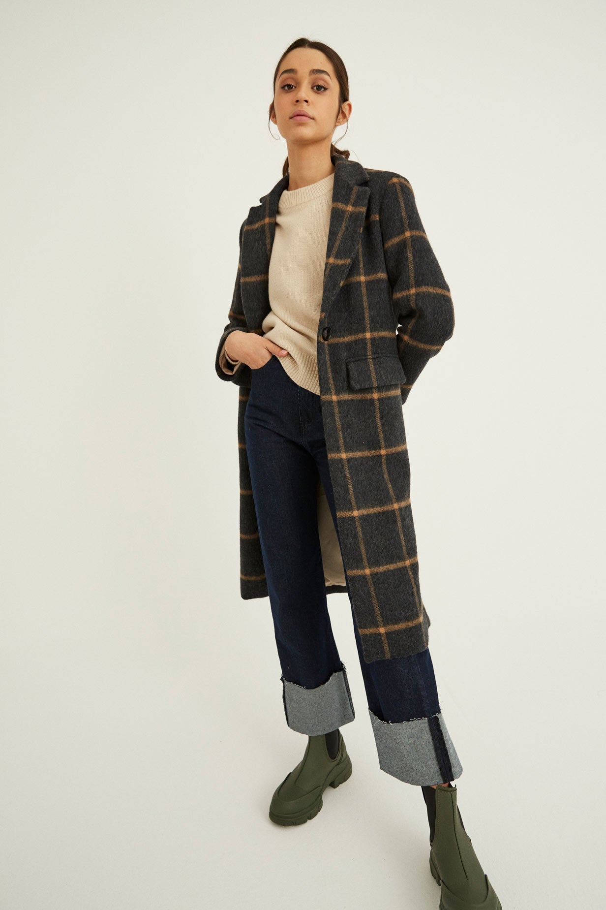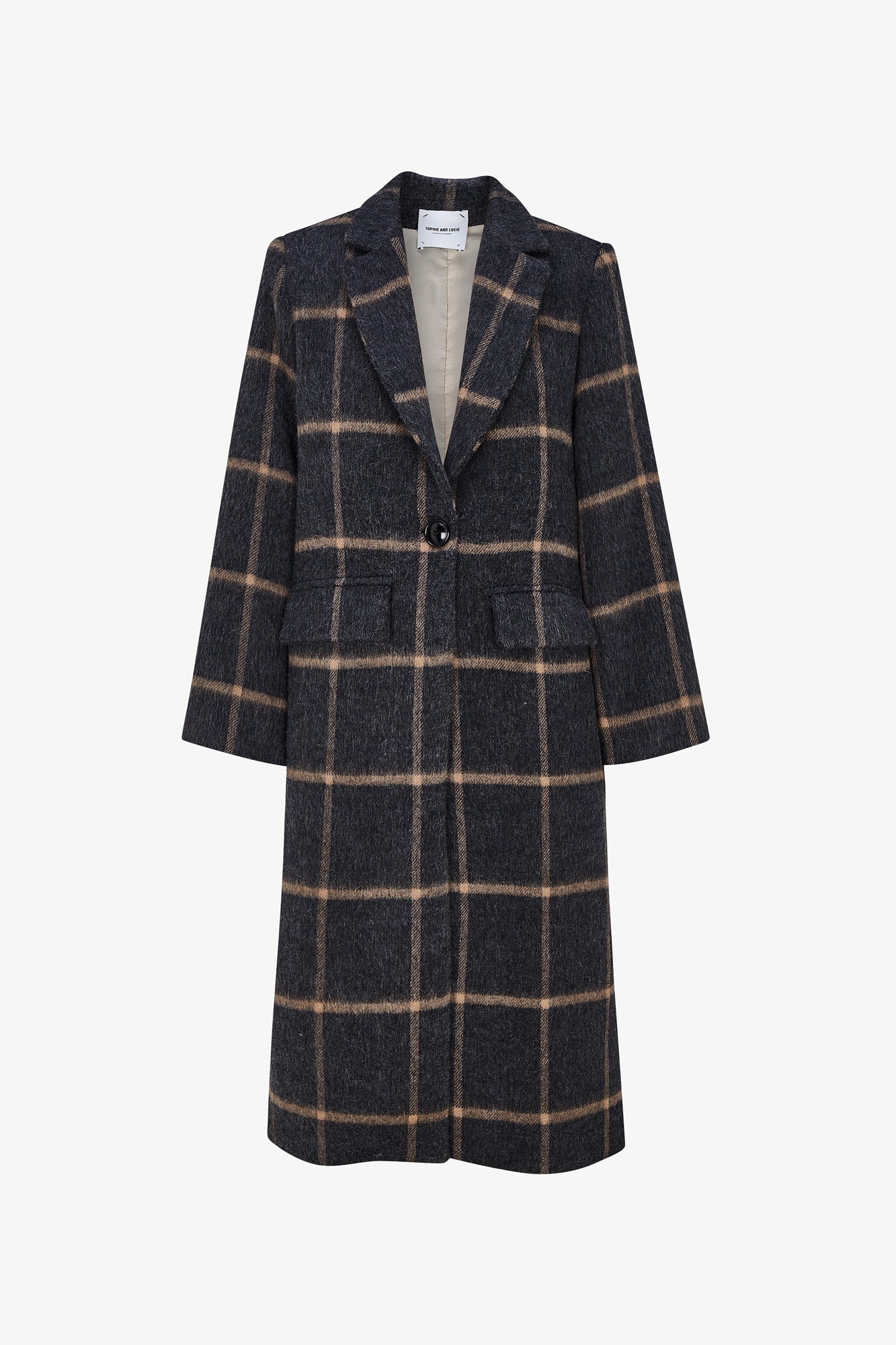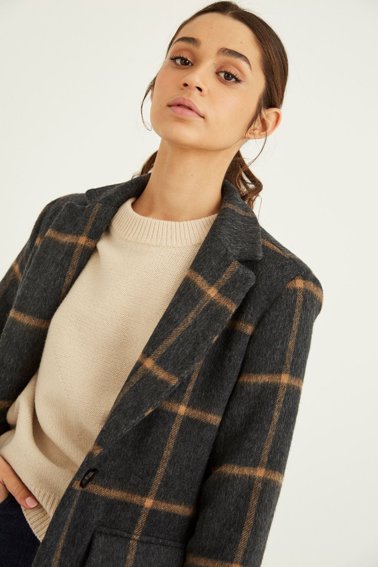 Abrigo con manga larga, hombro marcado y solapa larga. Cierre con botón central. Para darle mas movimiento a la prenda le hemos añadido dos aberturas laterales.