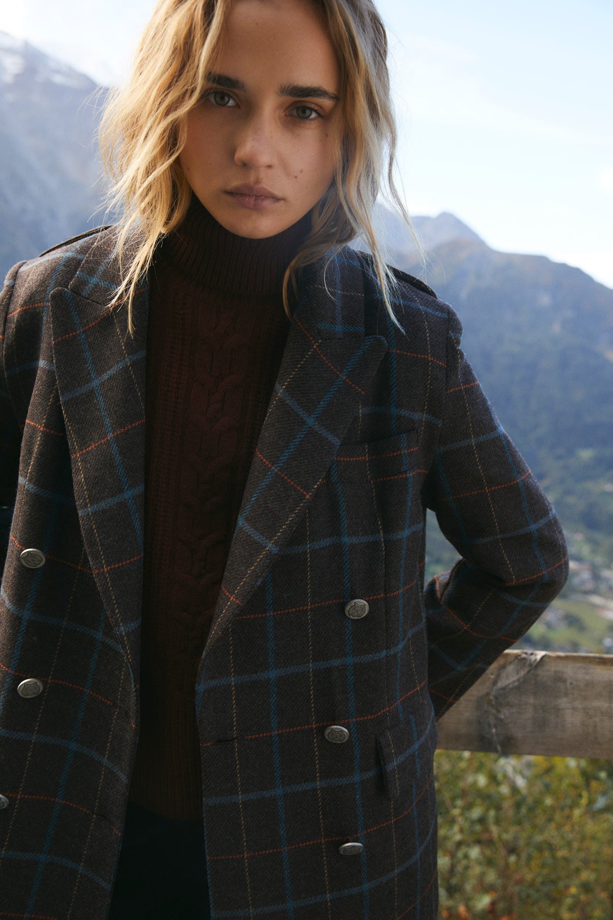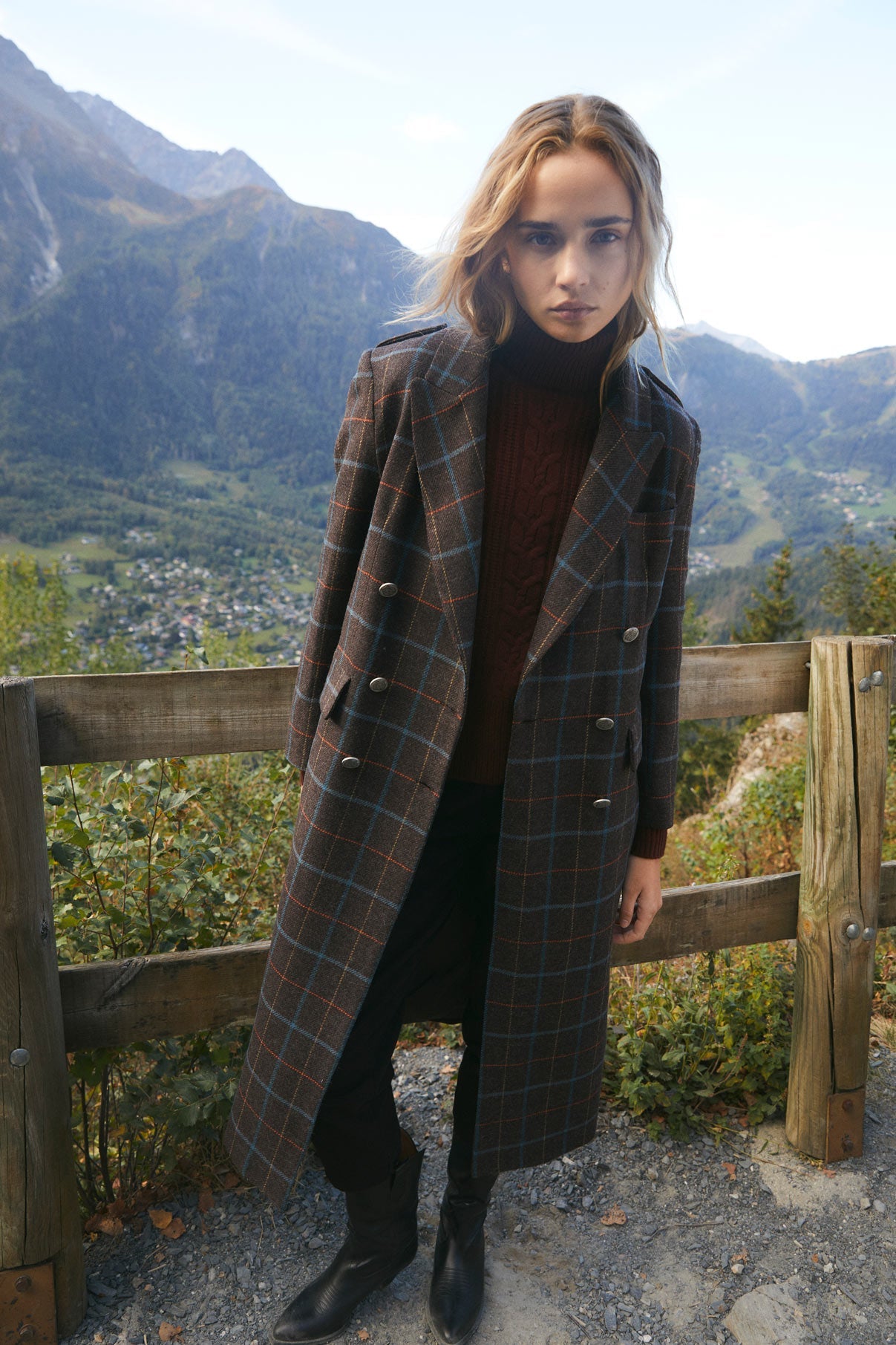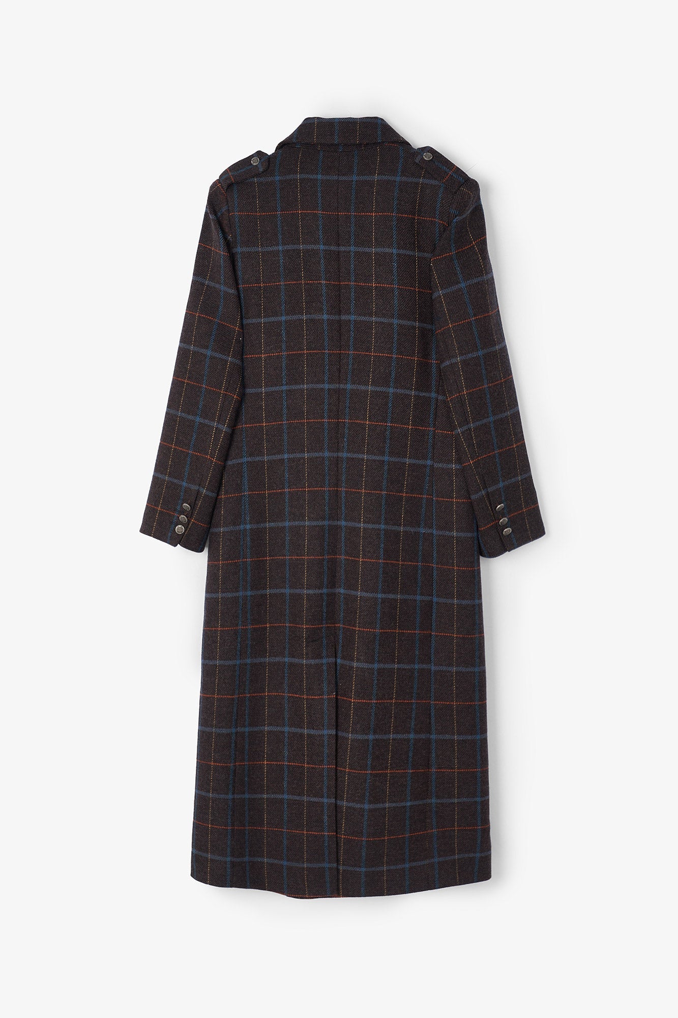 Abrigo midi confeccionado con un tejido estampado de cuadros con lana. Cuello pico con solapa y hombros marcados. Bolsillos de solapa en la parte delantera y bolsillo de ribete en el pecho. Cierre cruzado con doble botonadura.