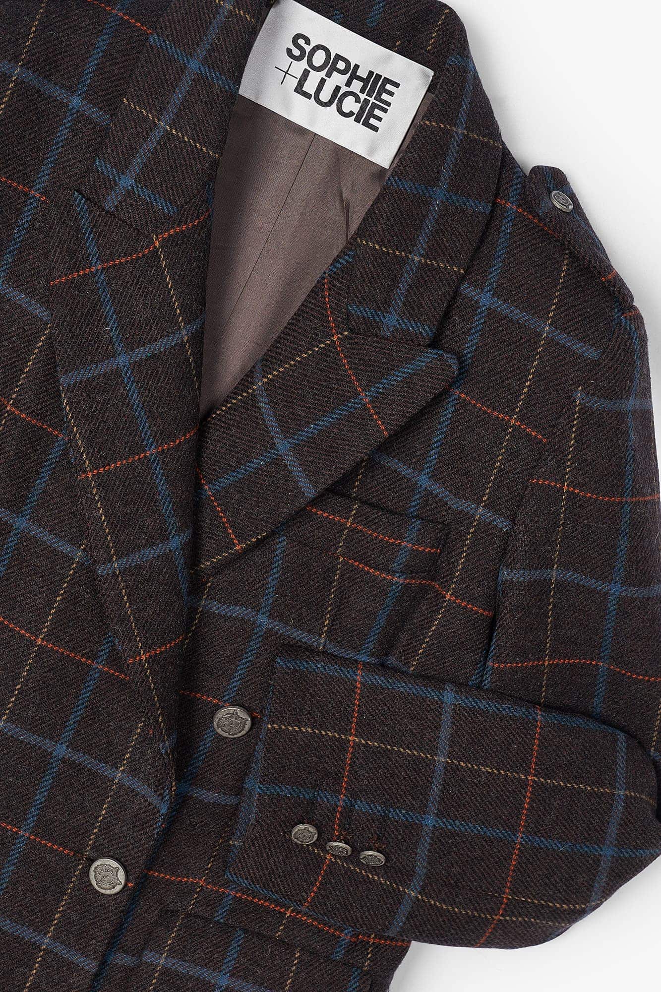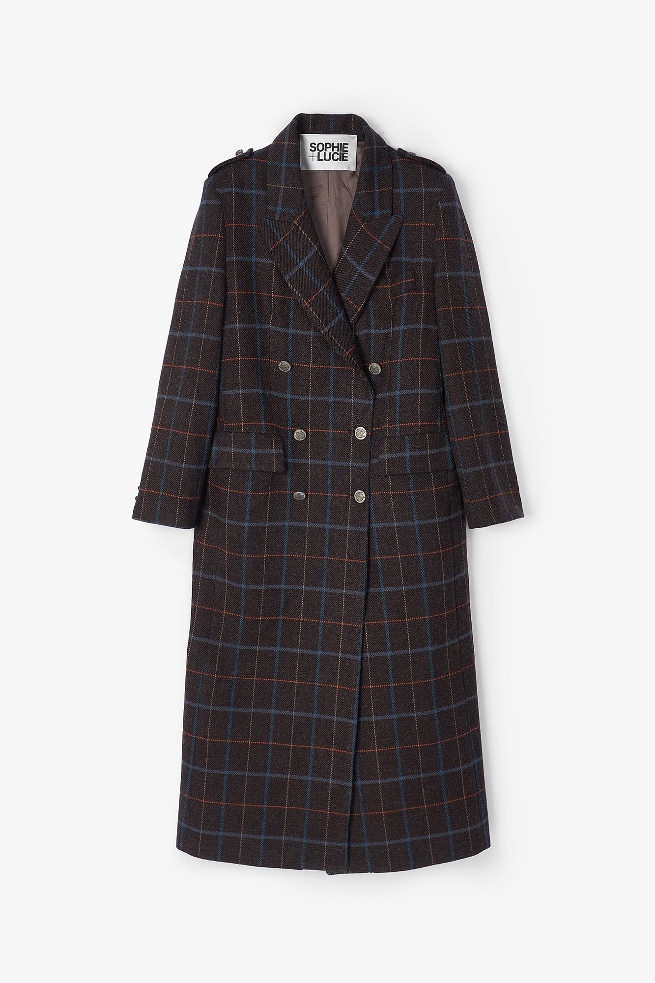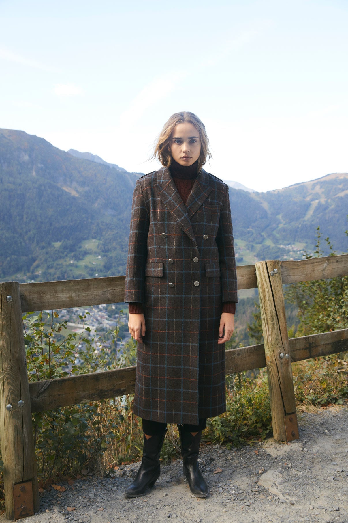 Abrigo midi confeccionado con un tejido estampado de cuadros con lana. Cuello pico con solapa y hombros marcados. Bolsillos de solapa en la parte delantera y bolsillo de ribete en el pecho. Cierre cruzado con doble botonadura.