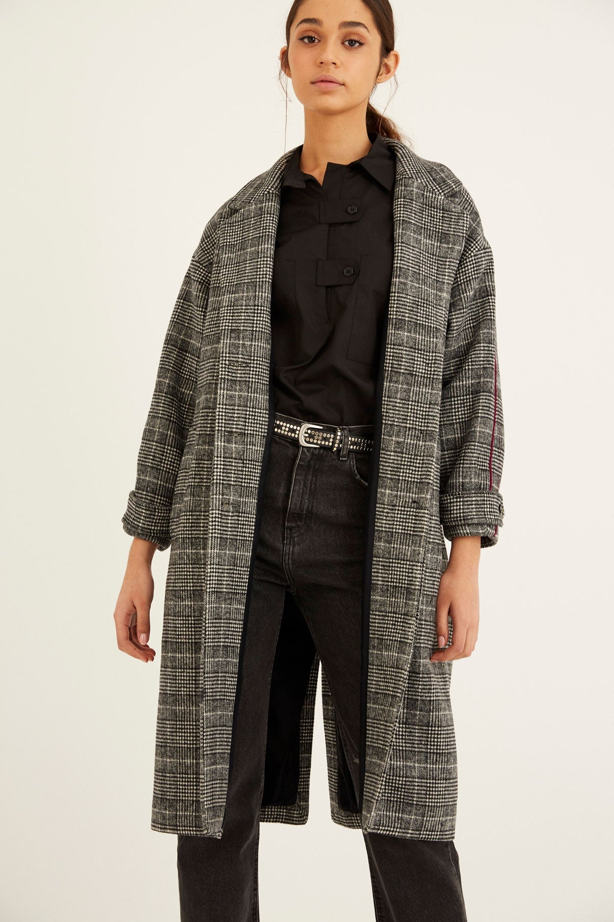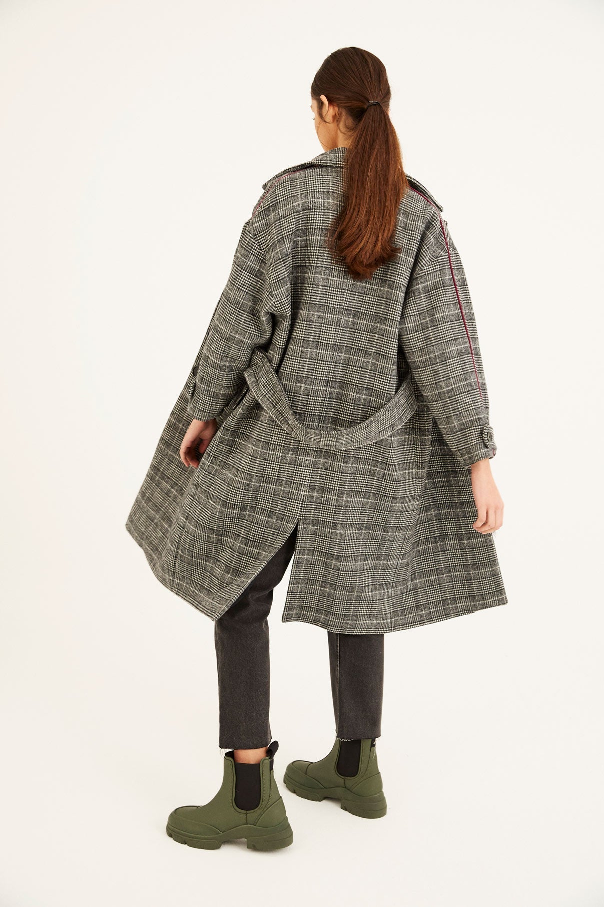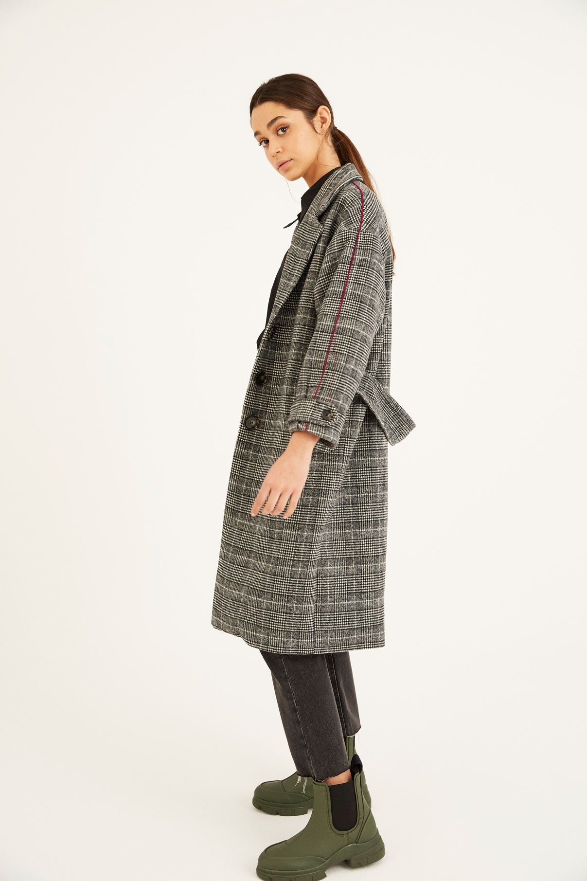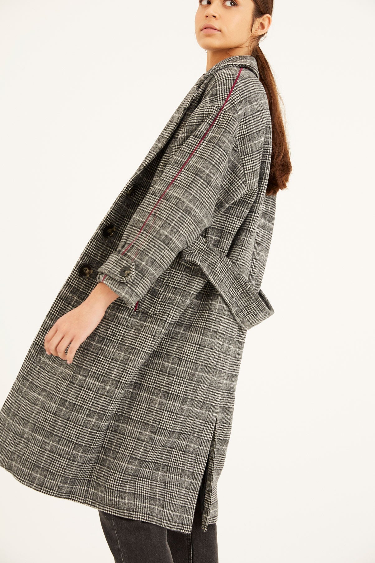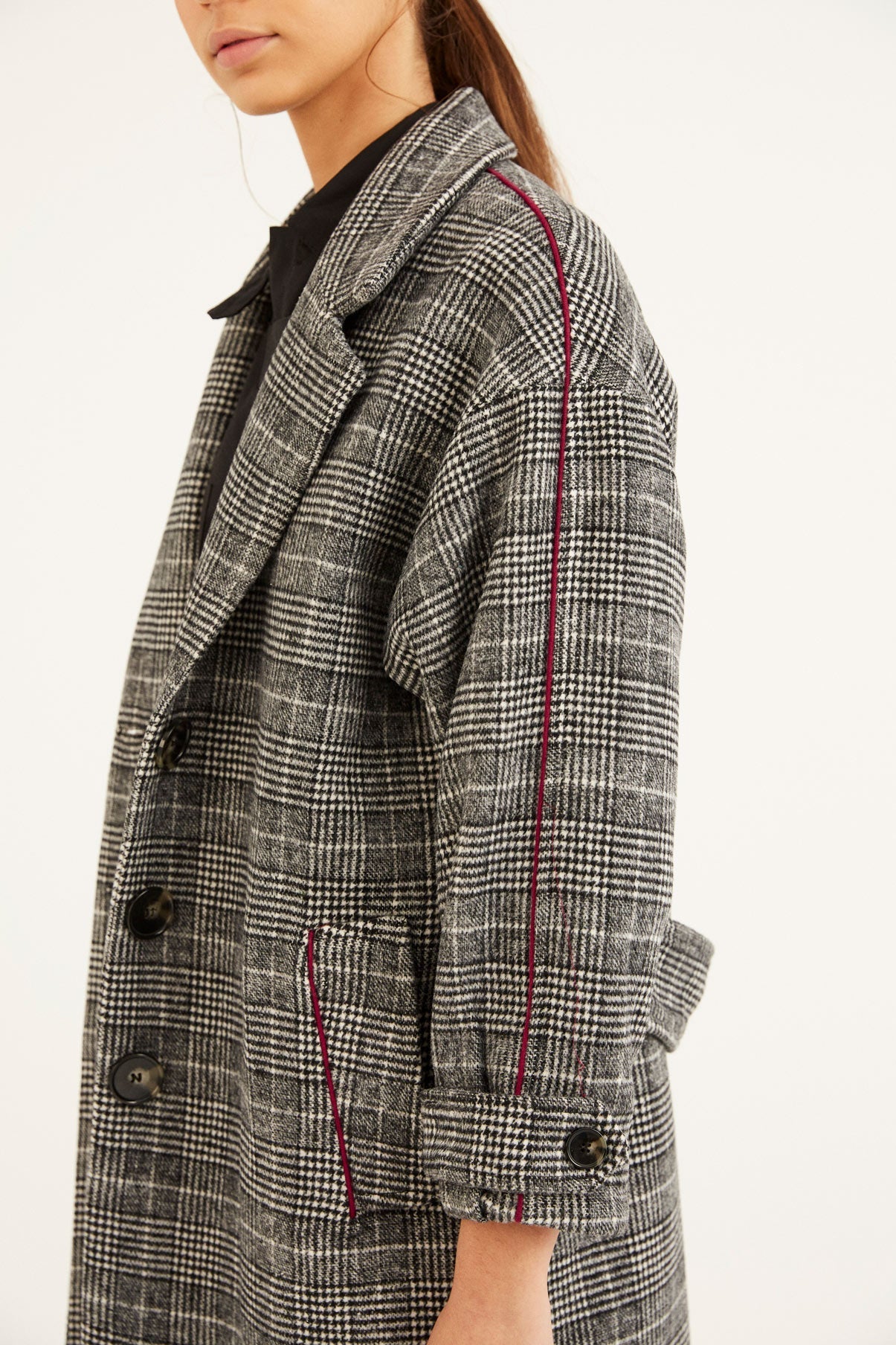Abrigo confeccionado en lana con fit oversize cuello de solapa y hombro caído. Botones en el delantero y bolsillos laterales. Detalle de botones en los puños y ribete a contraste en burdeos.
