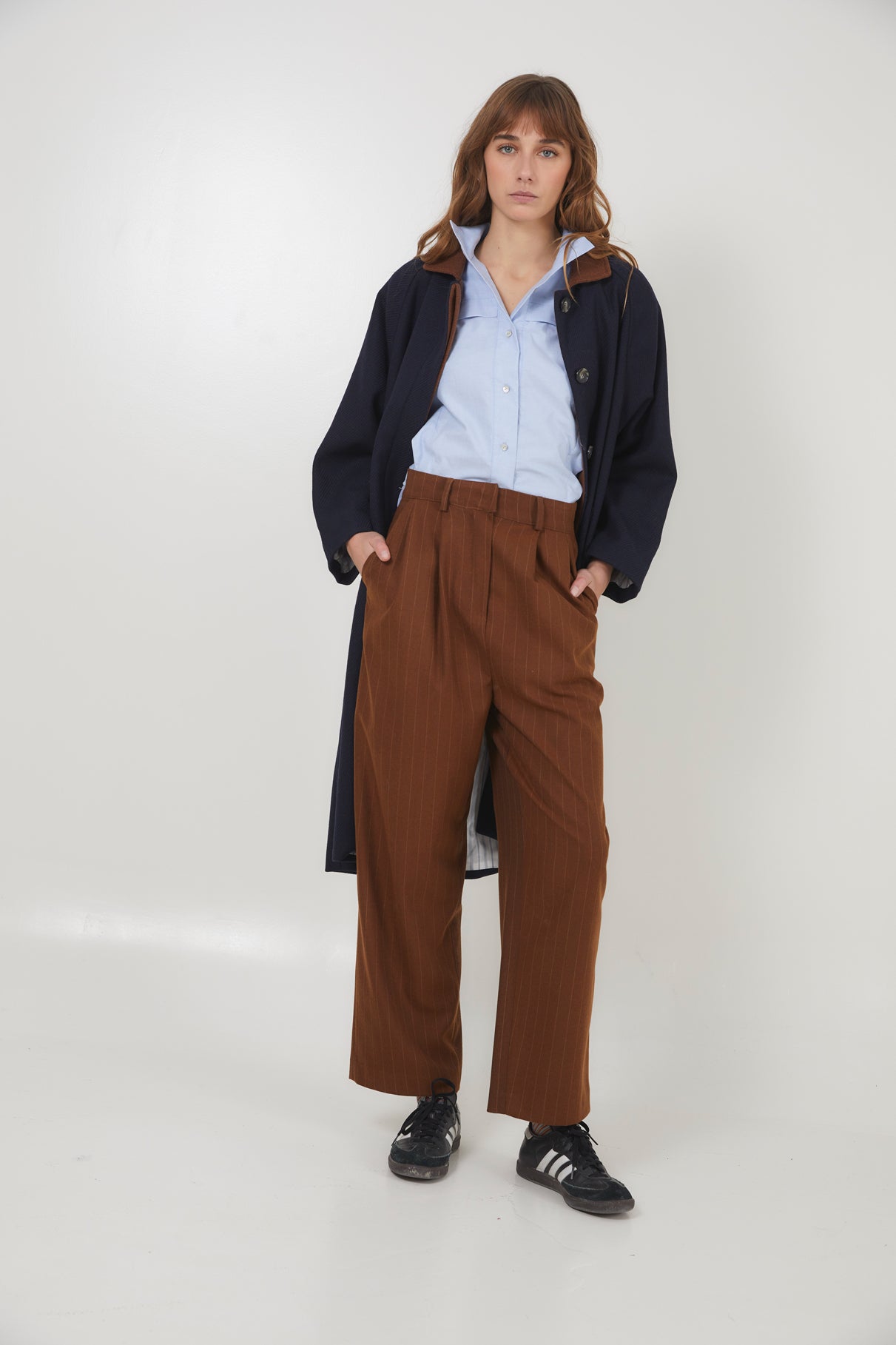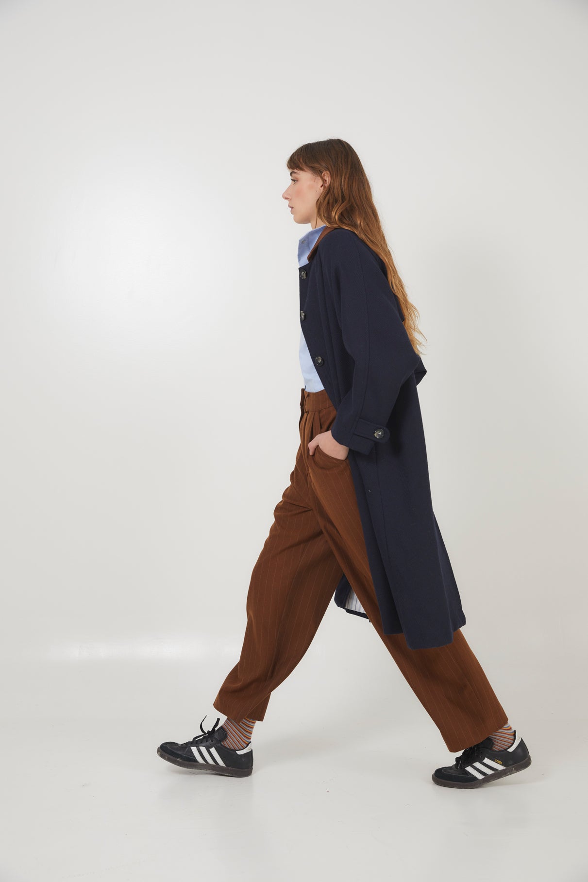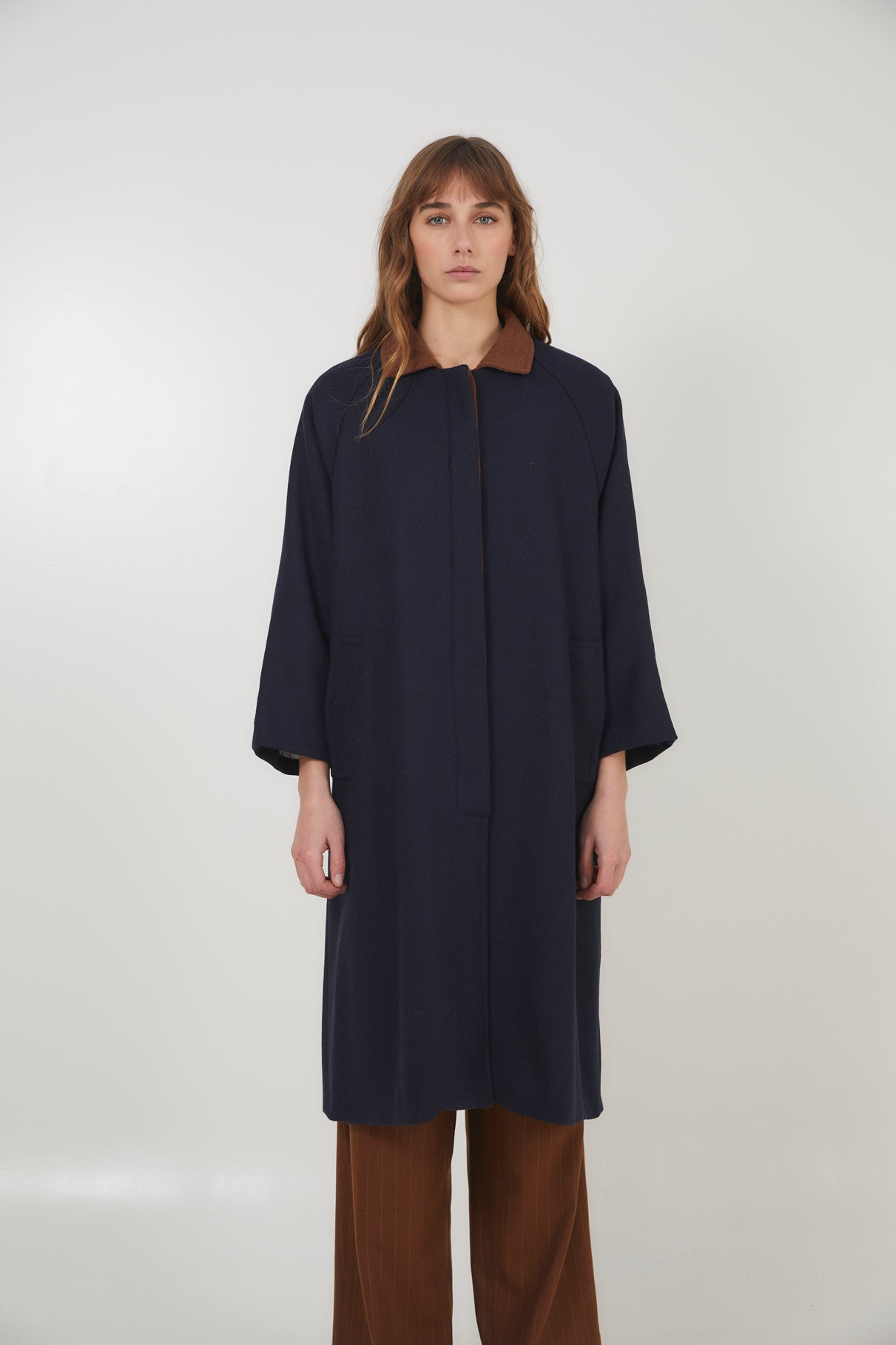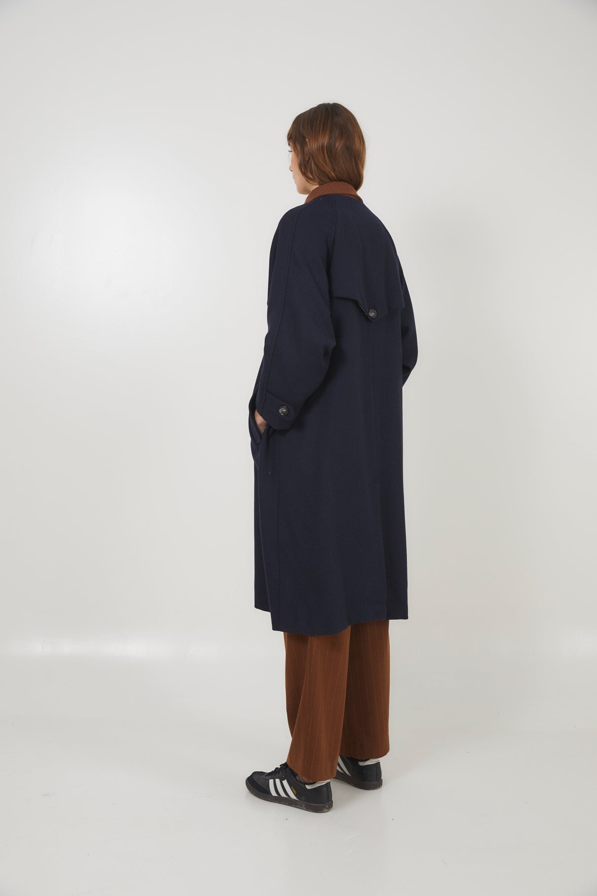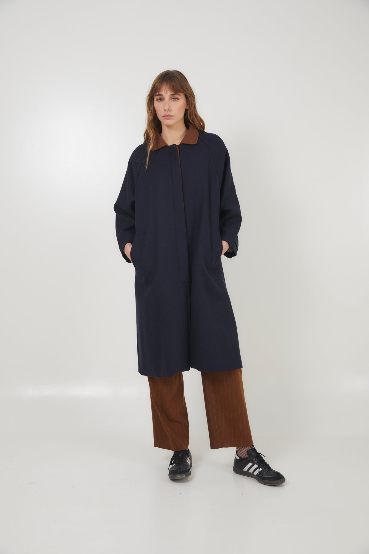Gabardina oversize color azul marino. Dos bolsillos laterales. Forro interior. Cierre en la parte delantera con botones ocultos.