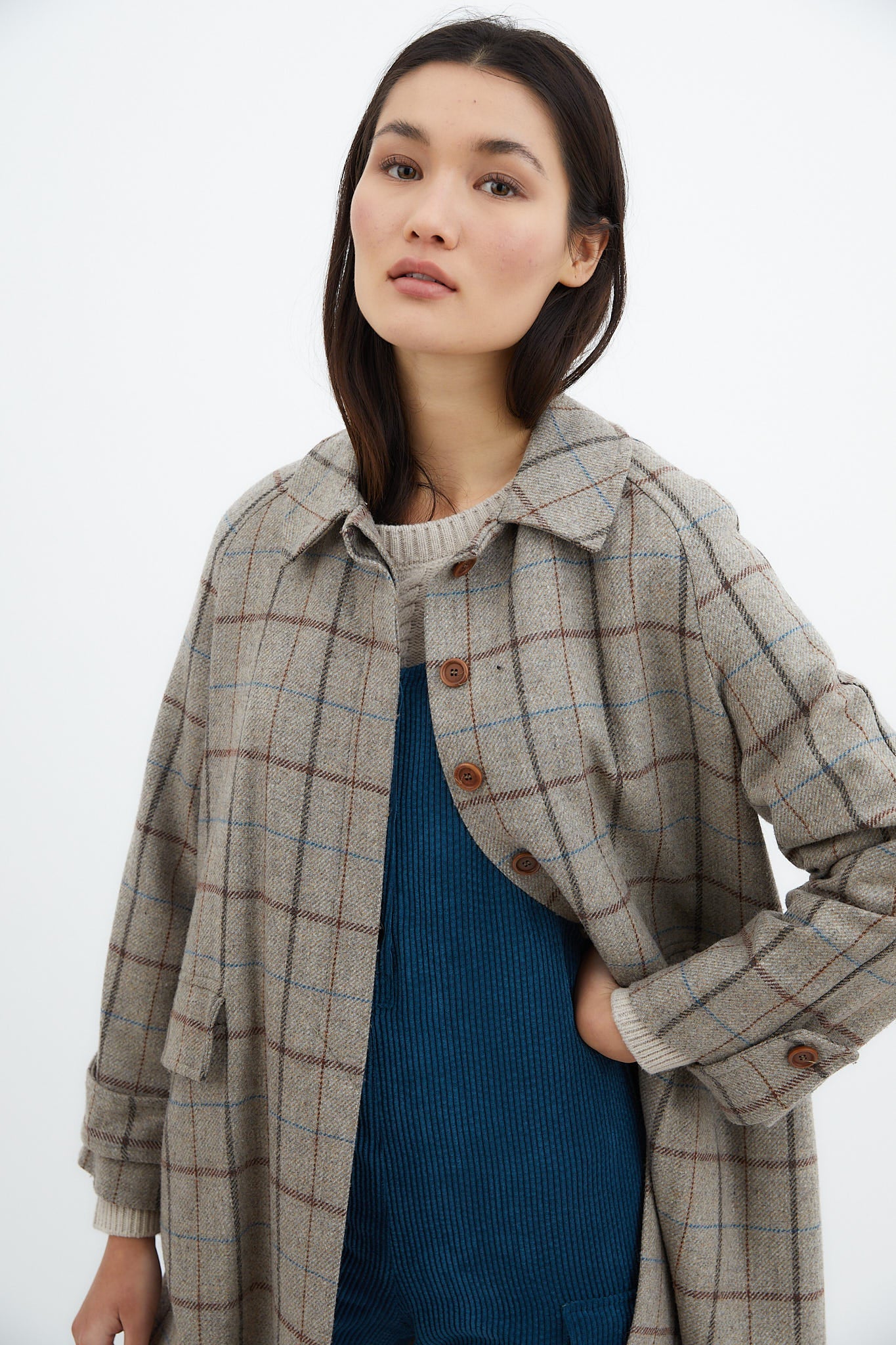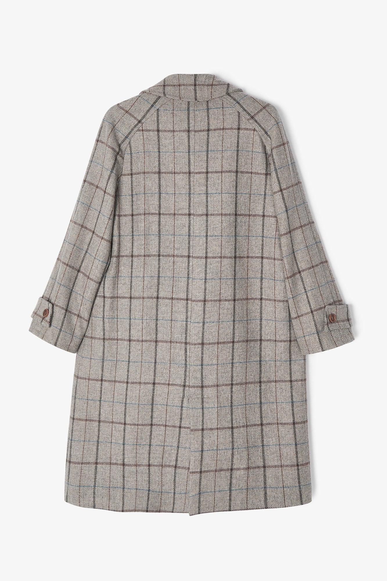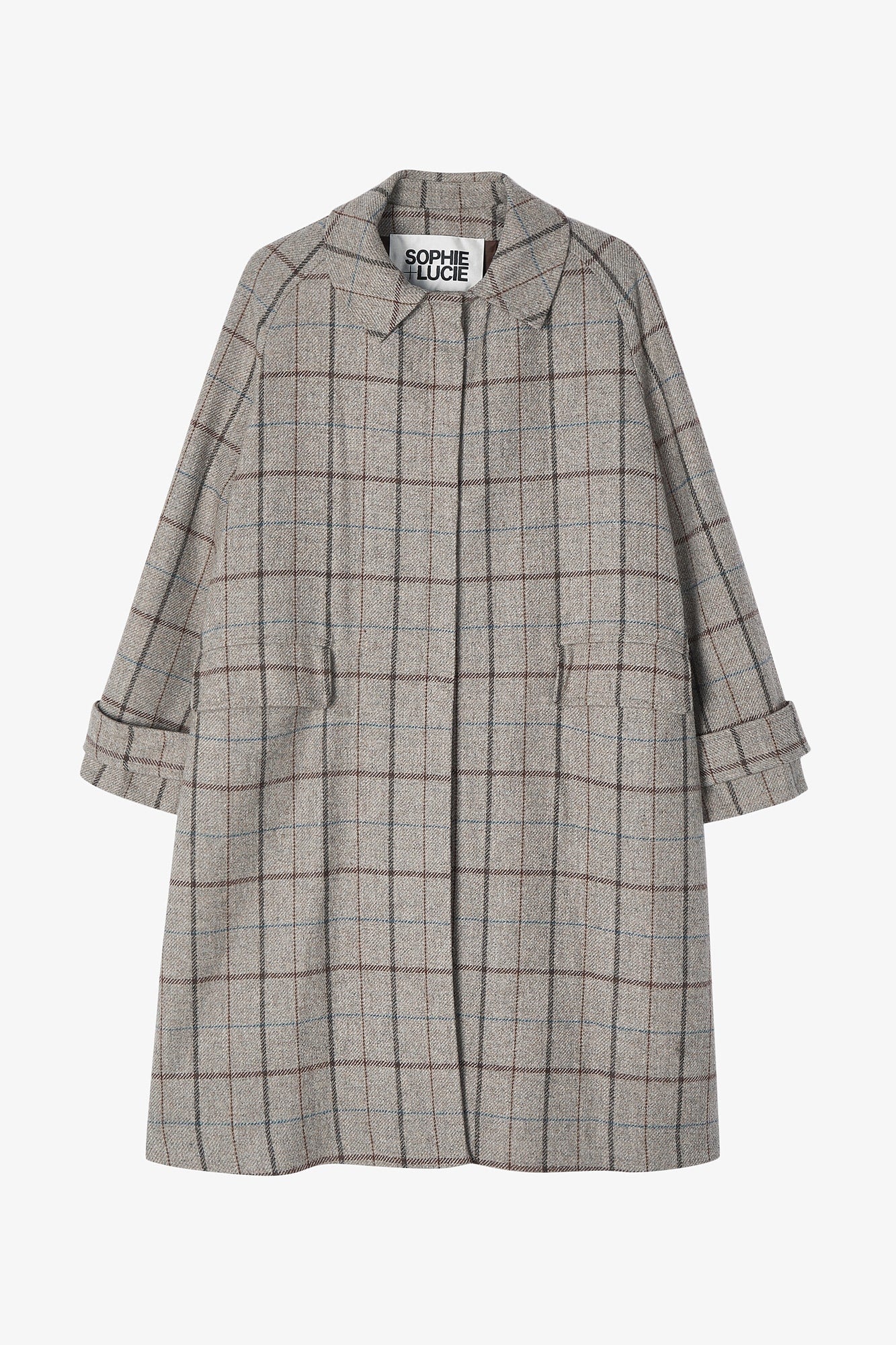 Abrigo oversize en tejido estampado de cuadros. Estilo clásico, con volumen renovado y con un punto masculino. Tiene manga ranglan, botonadura oculta y bolsillos en el delantero a contraste.