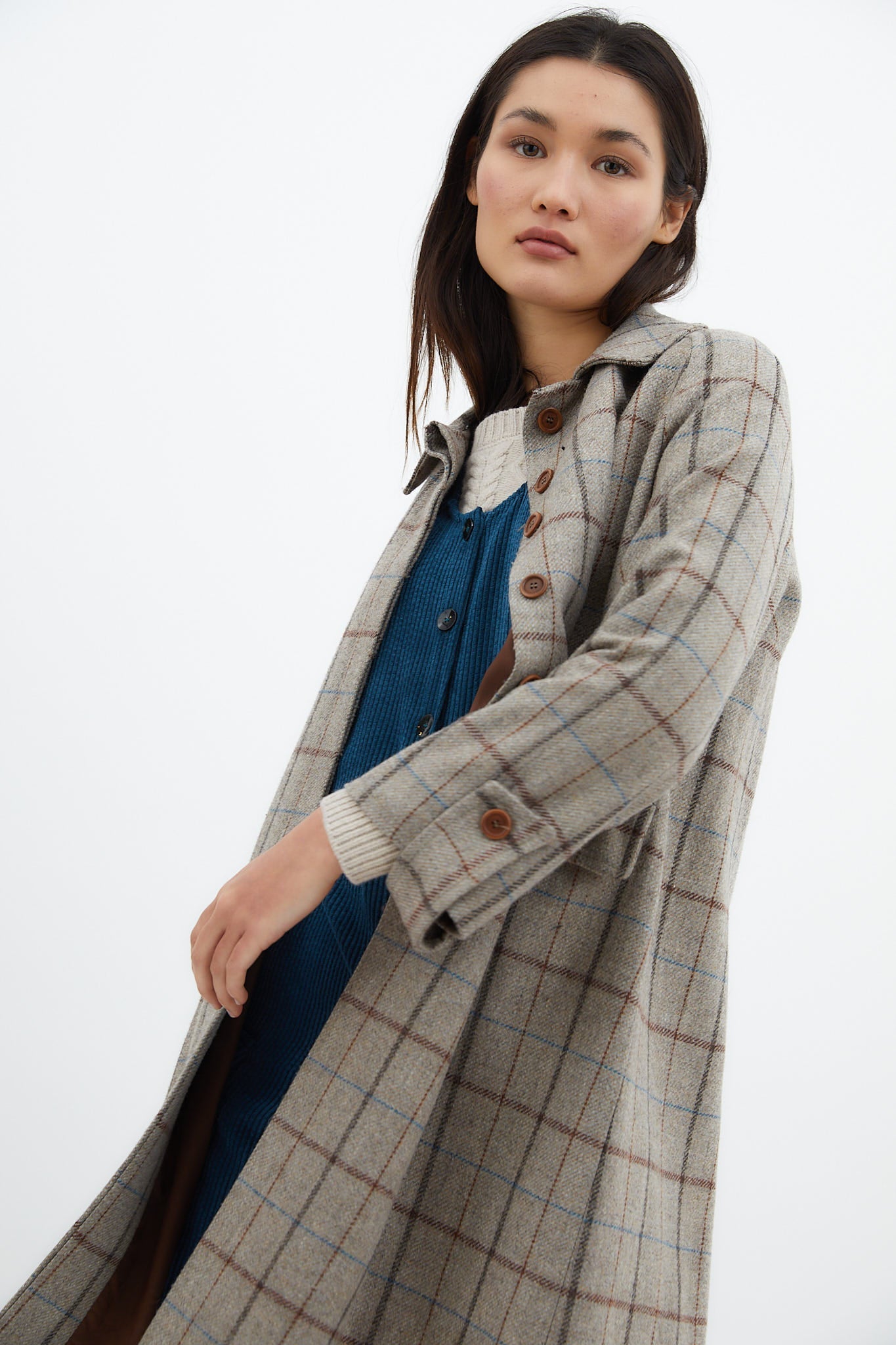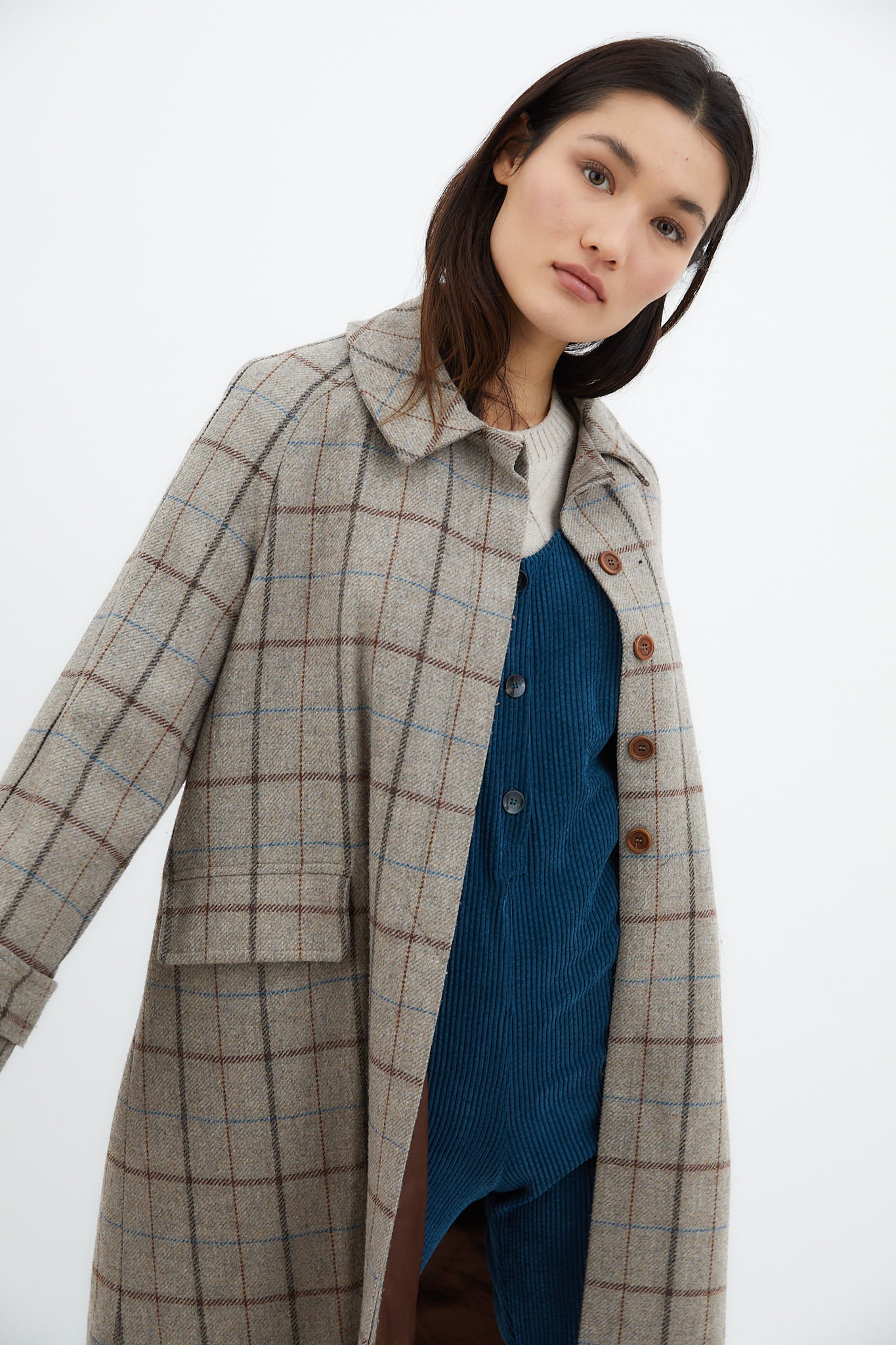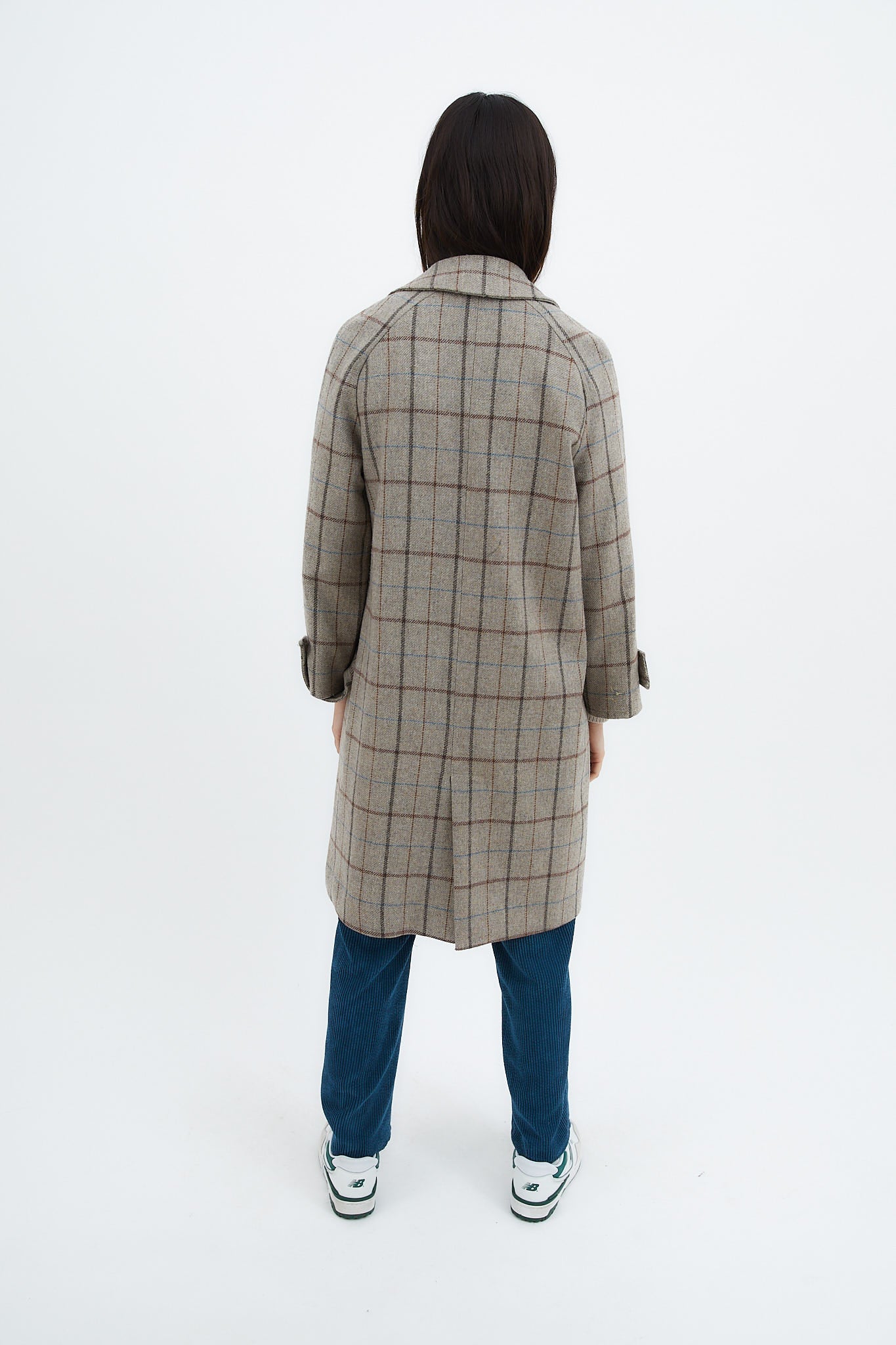 Abrigo oversize en tejido estampado de cuadros. Estilo clásico, con volumen renovado y con un punto masculino. Tiene manga ranglan, botonadura oculta y bolsillos en el delantero a contraste.