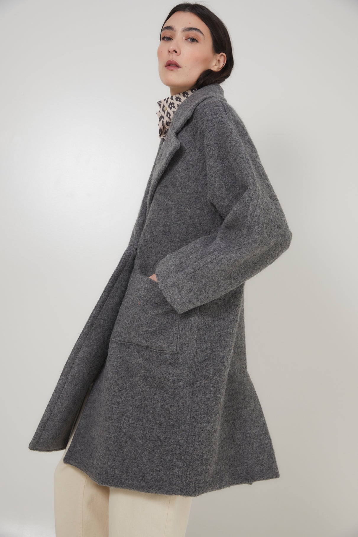 Este abrigo oversize color gris y tiene un diseño clásico con doble botonadura en la parte frontal. Escote pico con solapas. Bolsillos con solapas en ambos lados, y su longitud media proporciona un estilo cómodo ideal para el invierno. Es una prenda versátil, perfecta para ocasiones formales o looks más casuales y elegantes.