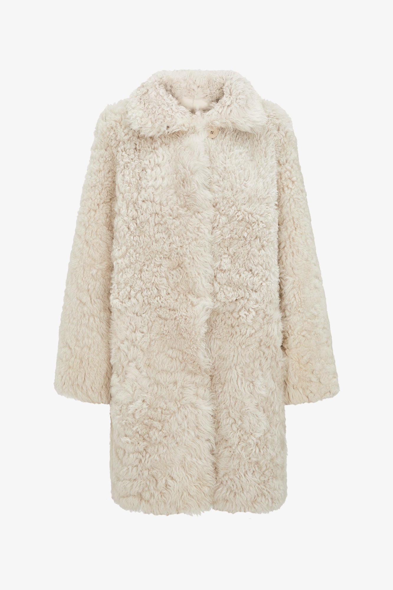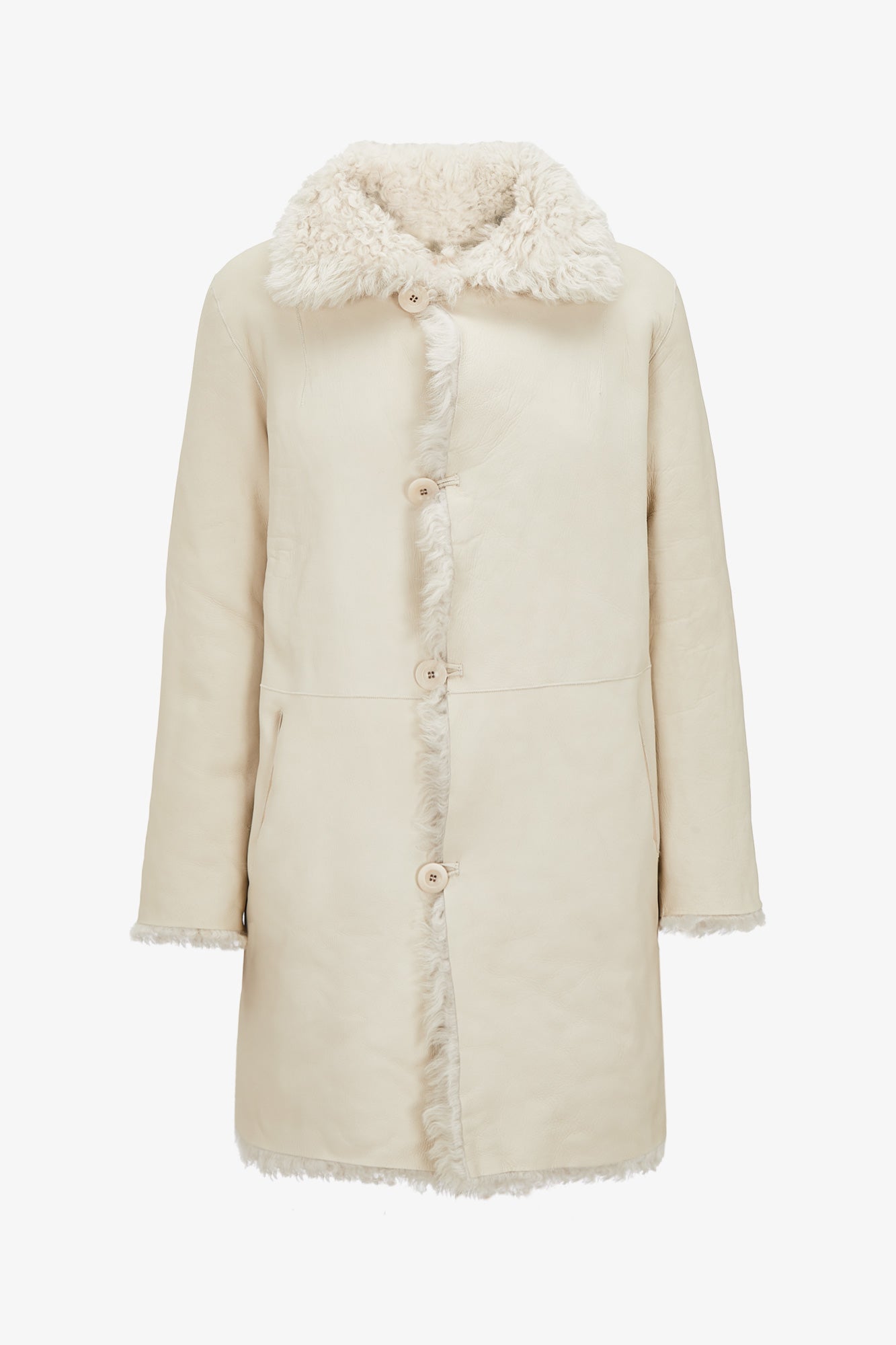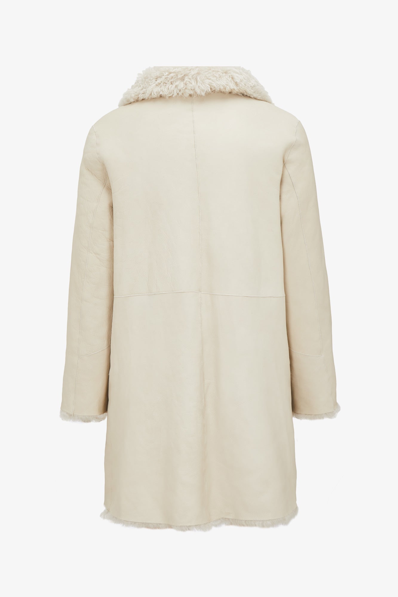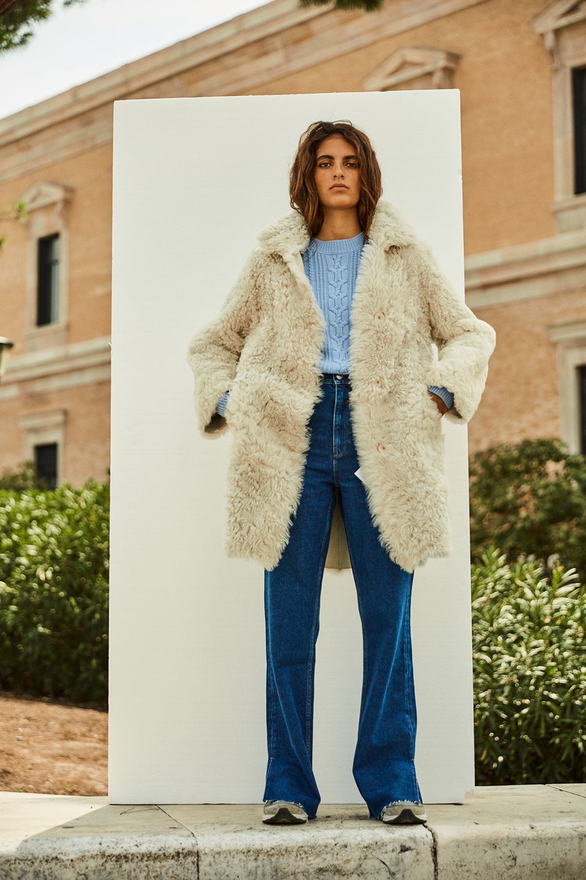 Este invierno apostamos por la artesanía española y hacemos las dos primeras prendas de 100% cordero español. Este abrigo de cuello alto, hombro marcado y largo tres cuartos es totalmente reversible, el cierre es con botones laterales. La piel es re-utilizada del sector alimentario.