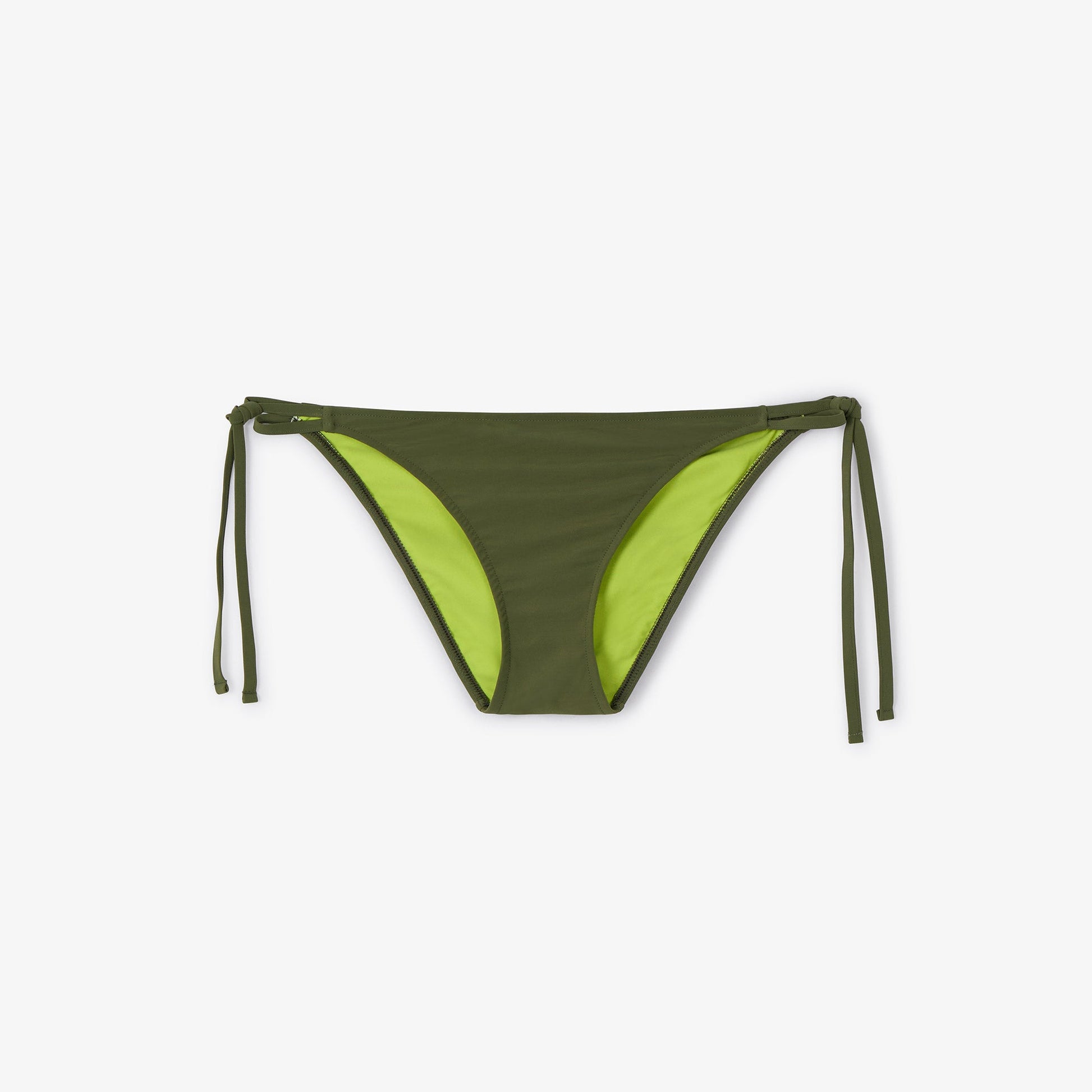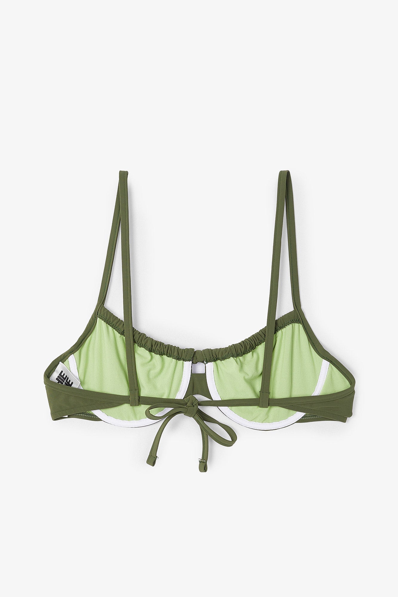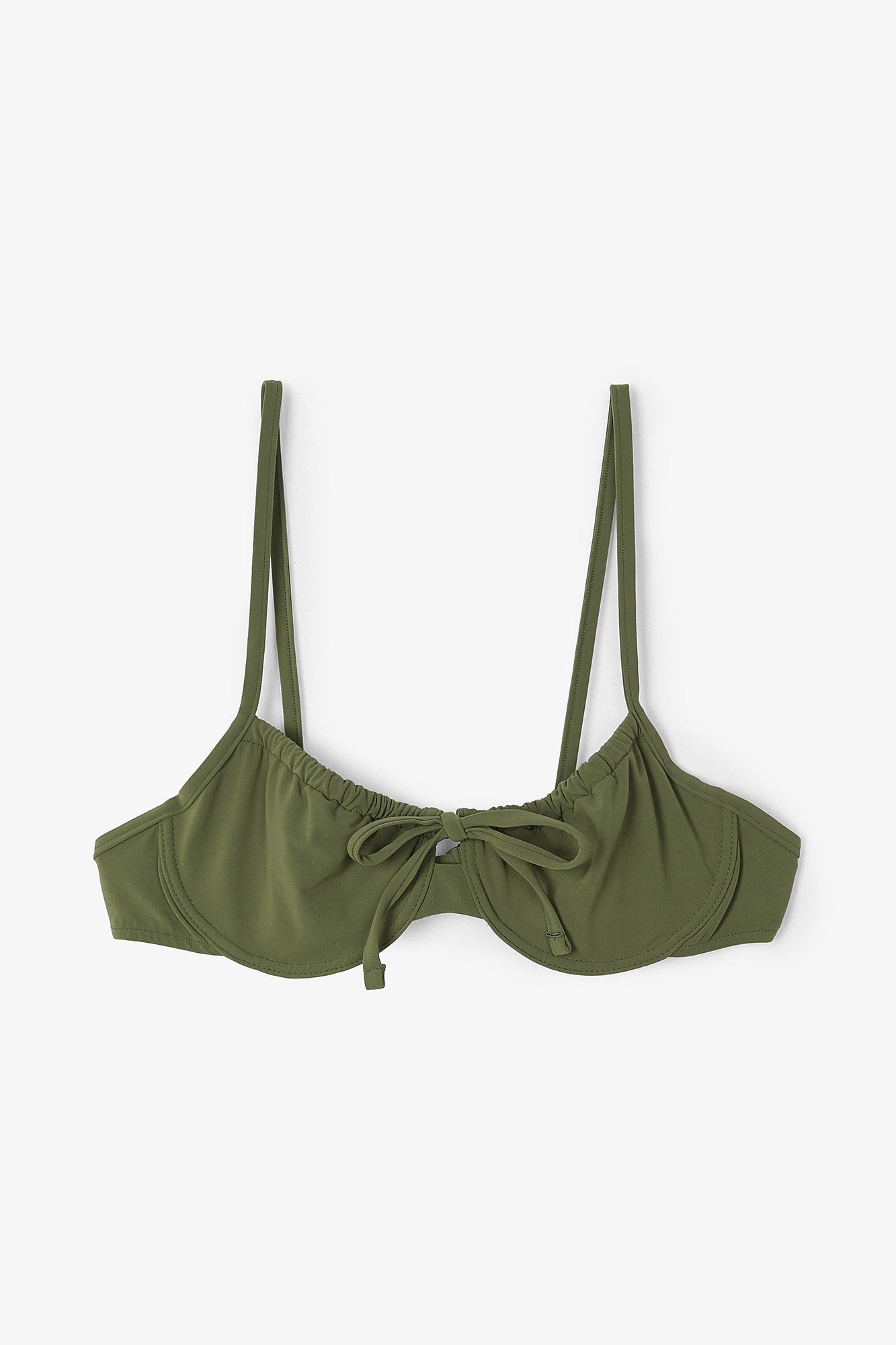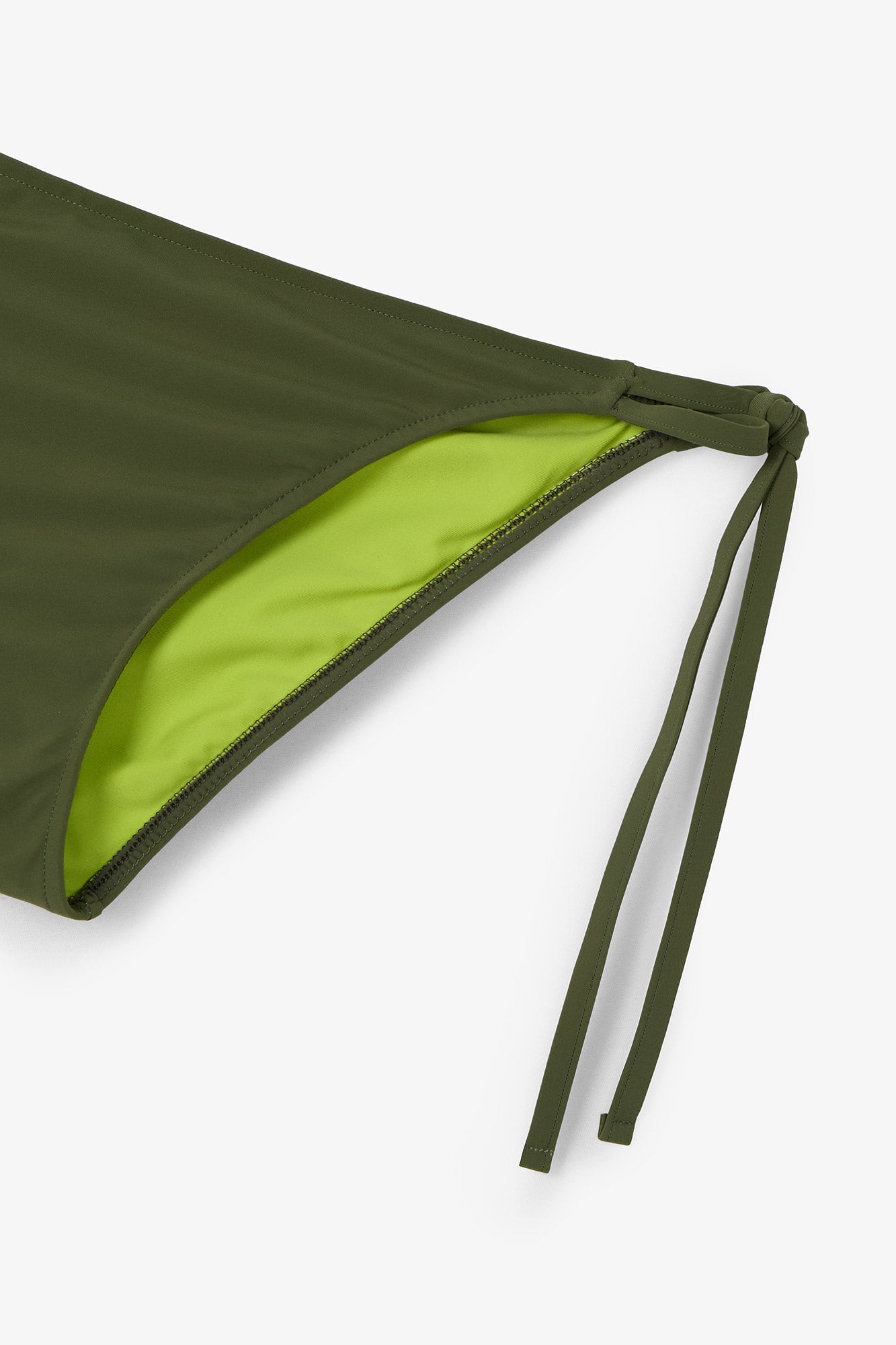 Un bikini con braguita baja y top, en tejido color kaki. Braguita talle bajo con cierre en los laterales mediante lazada. Top de tirantes con aros en el pecho para que resulte cómodo, detalle de lazo en el centro y cierre en la espalda mediante lazada.