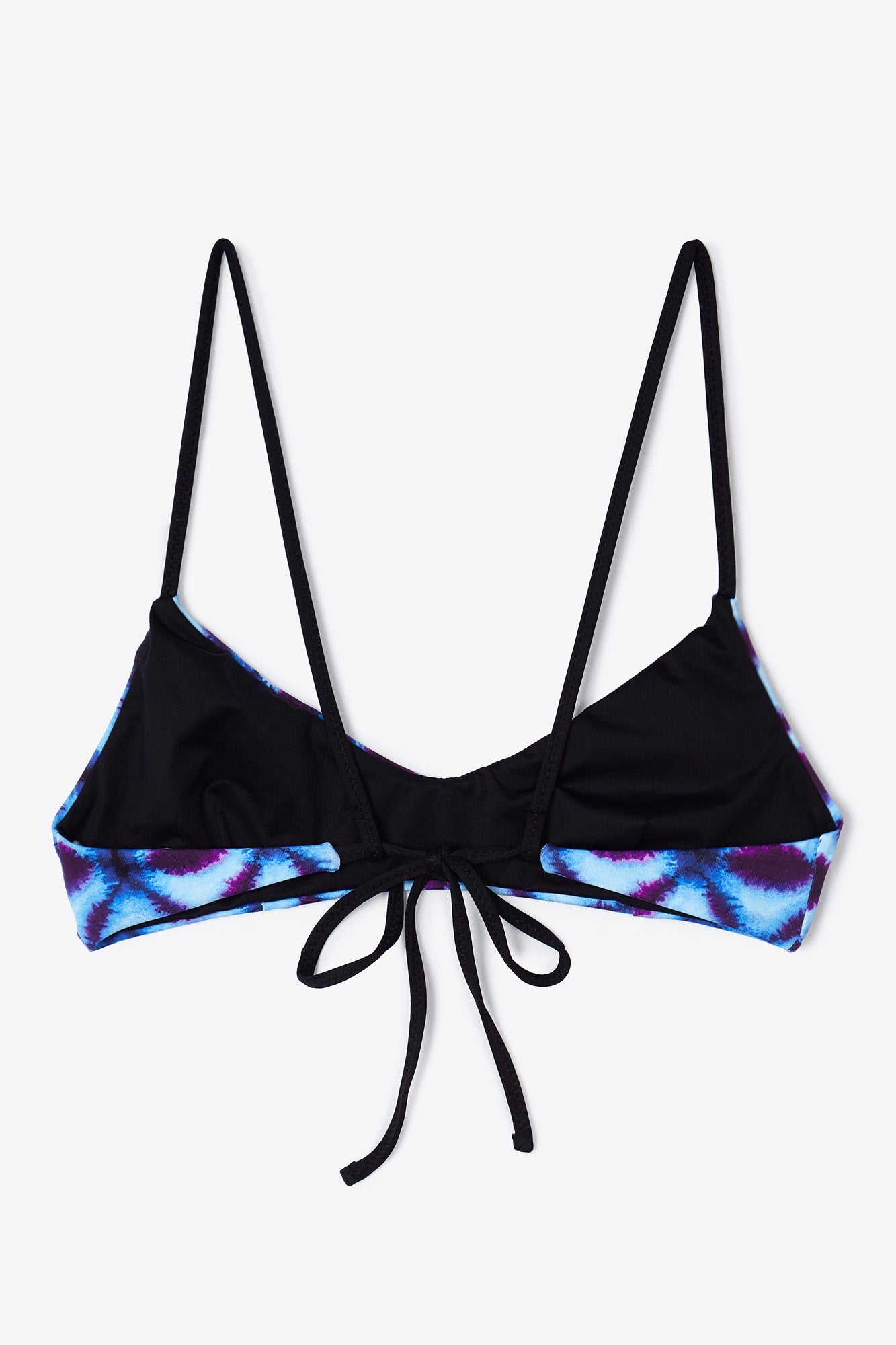 Este bikini es ideal para este verano. Top de bikini con escote fijo redondeado confeccionado en tejido estampado tie die en color azul. Tirante recto en color negro a contraste del bikini y cierre en la espalda mediante una lazada ajustable. La braguita es una braguita baja confeccionada en el mismo tejido. Lazada en los laterales en color negro a contraste del bikini, perfecta para poder ajustarla.