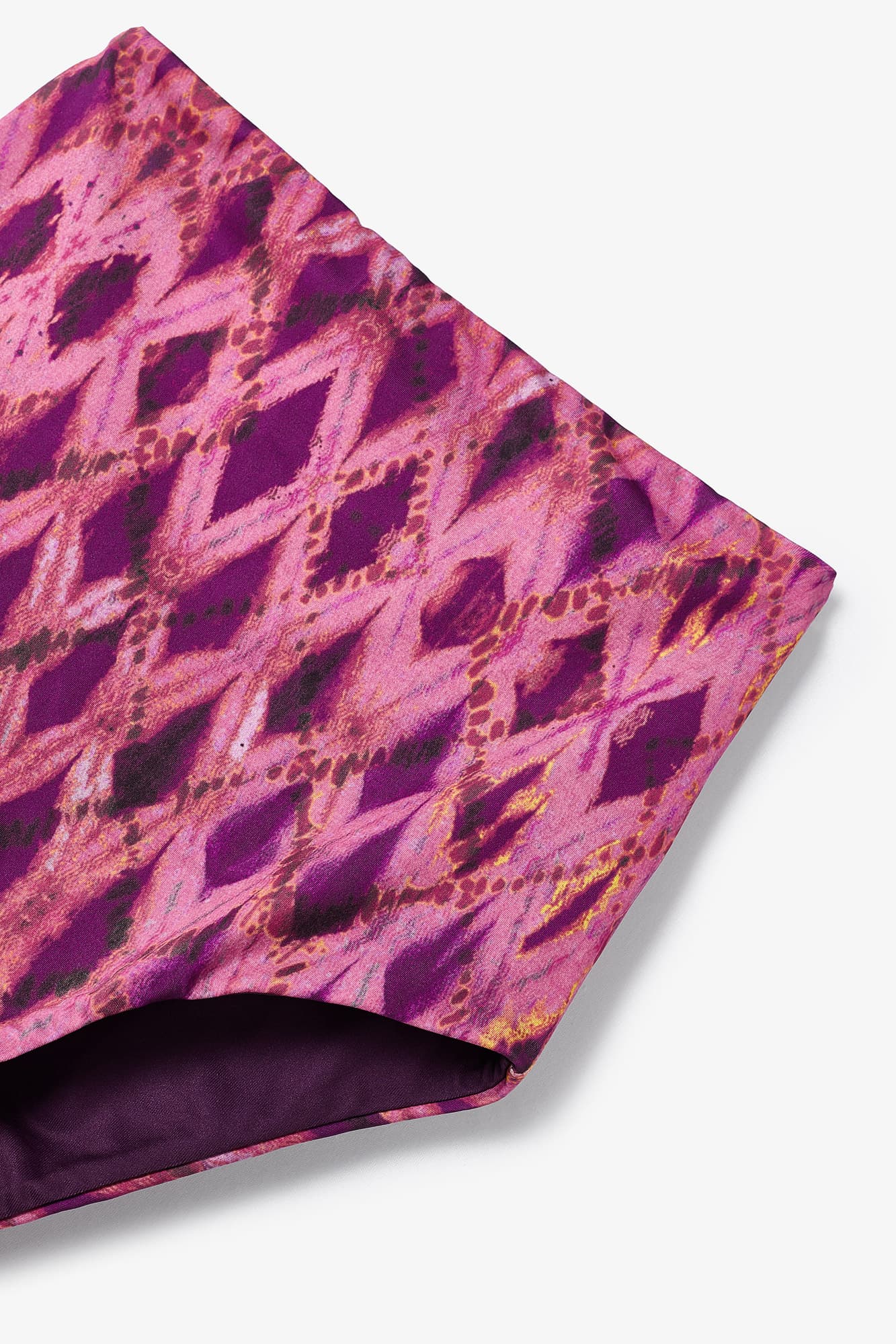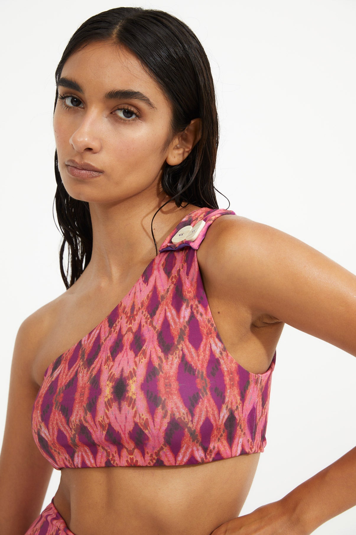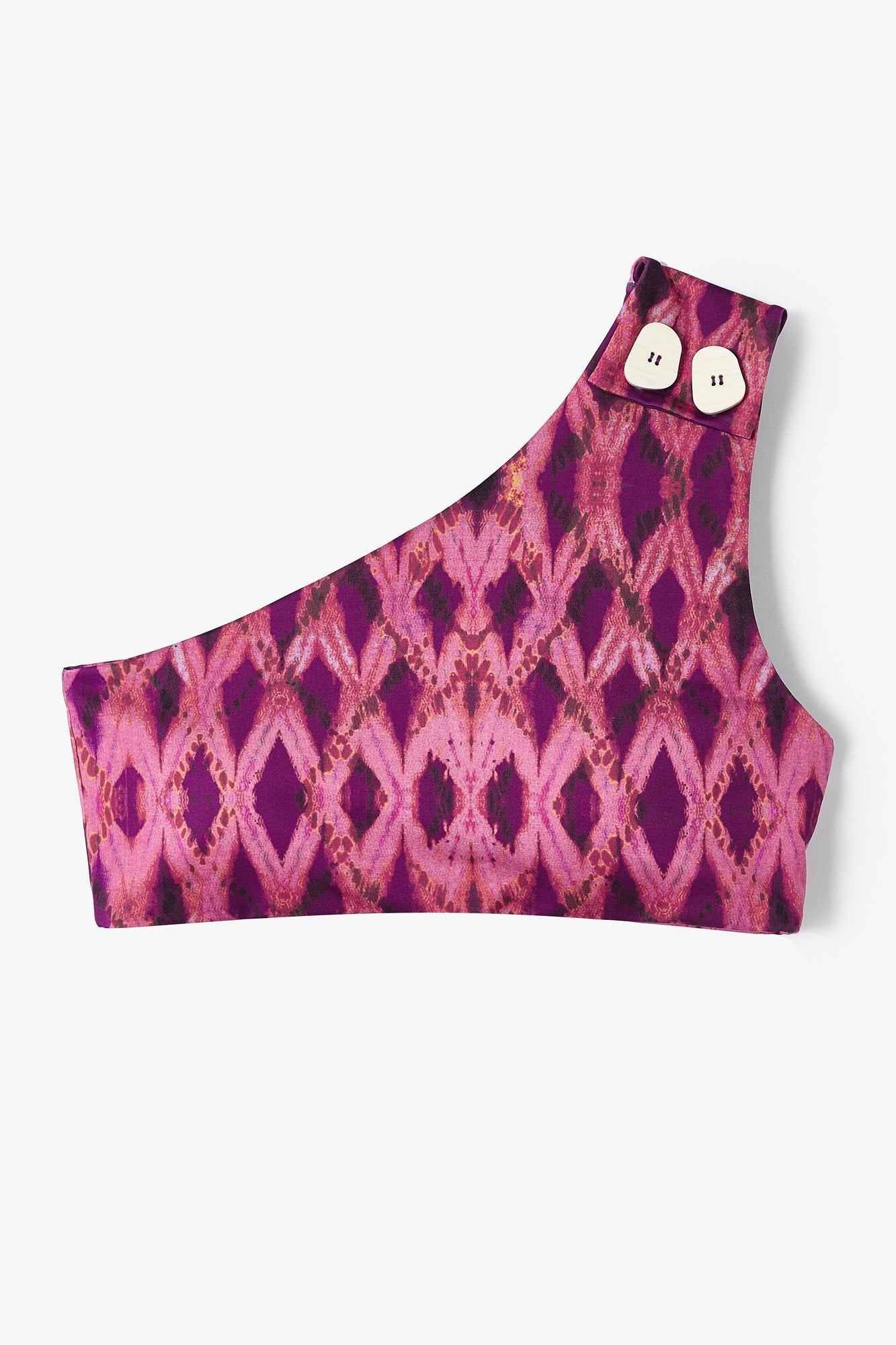 Este bikini es perfecto para este verano. Nuestro top icon, de escote asimétrico, con un único tirante. Confeccionado en tejido estampado tie die en color rosa. Utilizando nuestros botones más icónicos de la marca como detalle en el top. La braguita es alta, alarga las piernas, braguita de bikini confeccionada con el mismo tejido, un tejido tie die en color rosa.