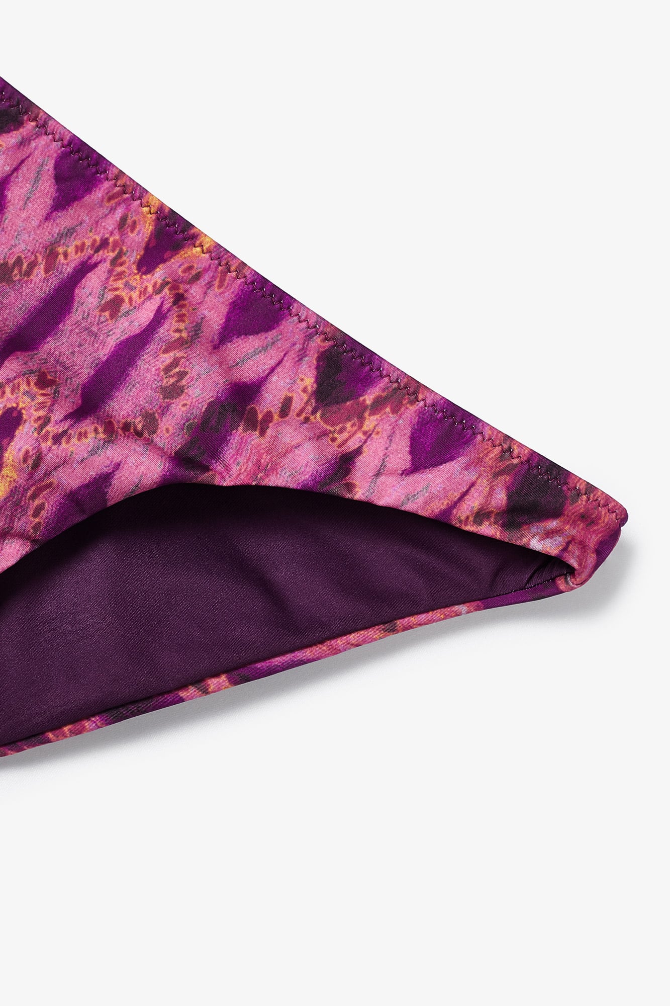 Este bikini es perfecto para este verano. Nuestro top icon, de escote asimétrico, con un único tirante. Confeccionado en tejido estampado tie die en color rosa. Utilizando nuestros botones más icónicos de la marca como detalle en el top. Braguita baja confeccionada en nuestro tejido estampado estilo tie die en color rosa.