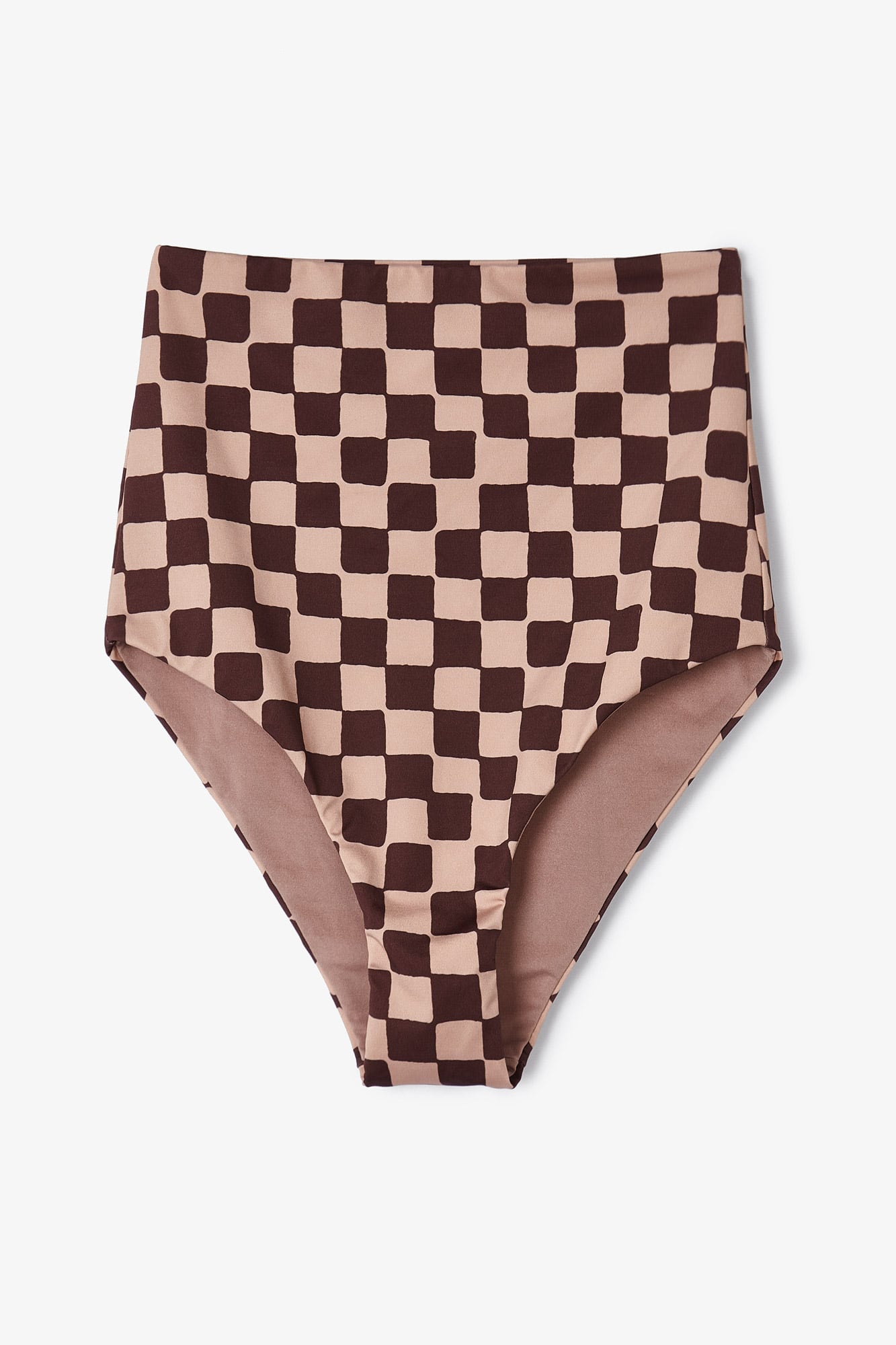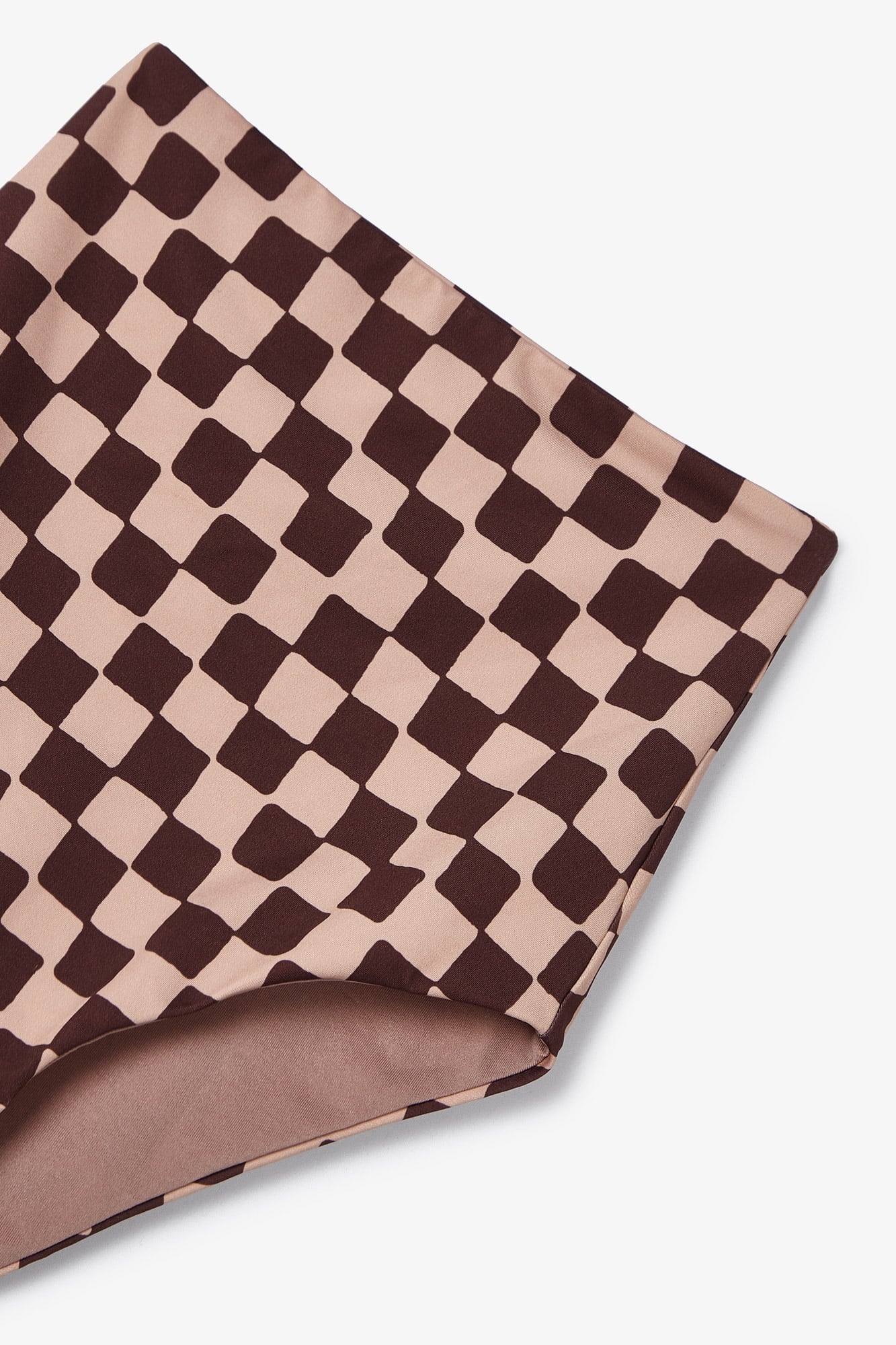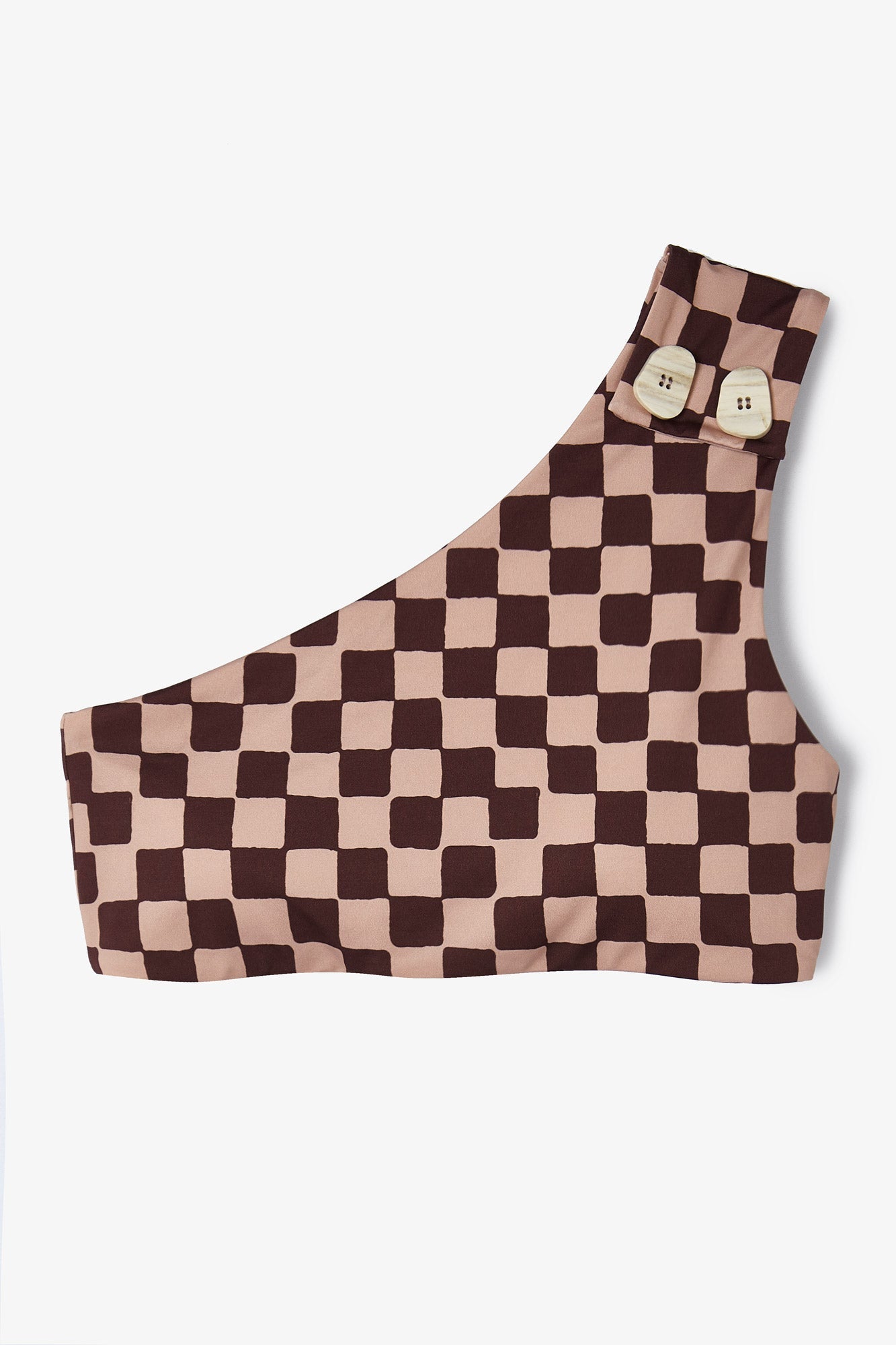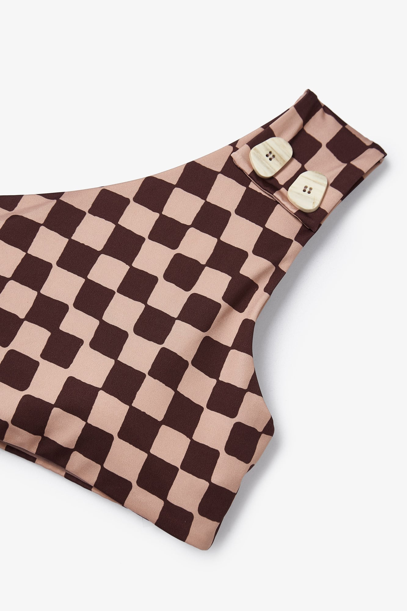 Este bikini se ha convertido en uno de nuestros iconos de la marca, perfecto para este verano. Nuestro top icon, de escote asimétrico, un único tirante. Confeccionado en tejido estampado damero combinando los colores nude y granate. Utilizando nuestros botones más icónicos de la marca como detalle en el top. La braguita es alta, alarga las piernas, braguita de bikini confeccionada en tejido estampado damero combinando los colores nude y granate.