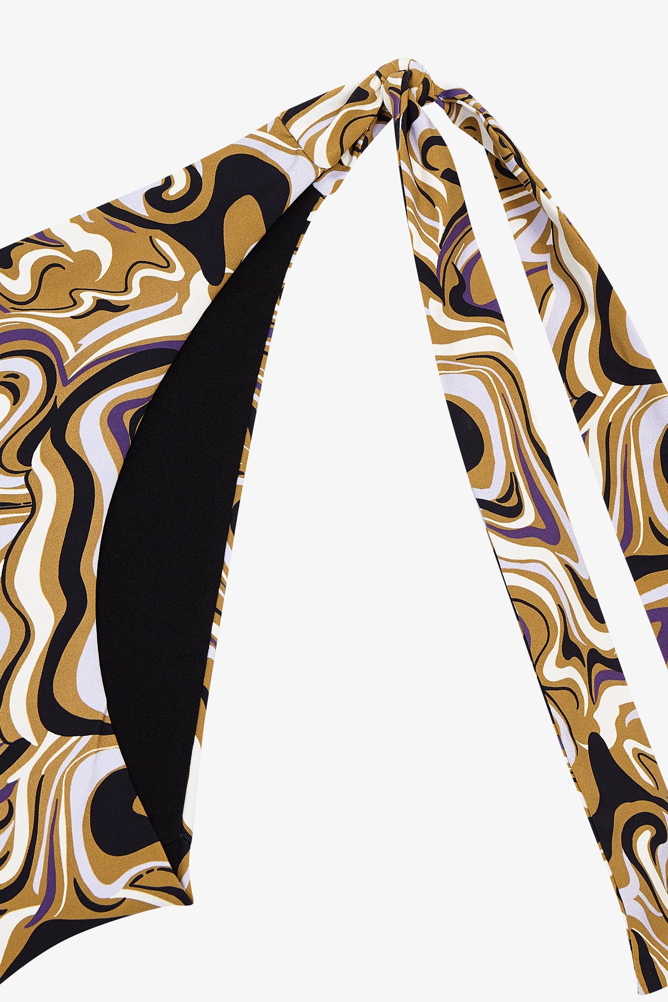 Bikini triangular con tirantes regulables, sin aros y con cierre de broche en la parte trasera confeccionado en estampado psicodélico. Braguita baja confeccionada en nuestro tejido estampado psicodélico con detalle de lazada lateral.