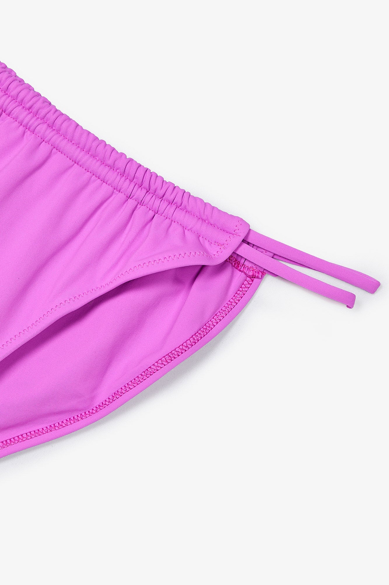 Un bikini con braguita baja y top triángulo color rosa. Braguita talle bajo con doble tira en los laterales. Top de tirantes, con foam y cierre en la espalda mediante lazada.