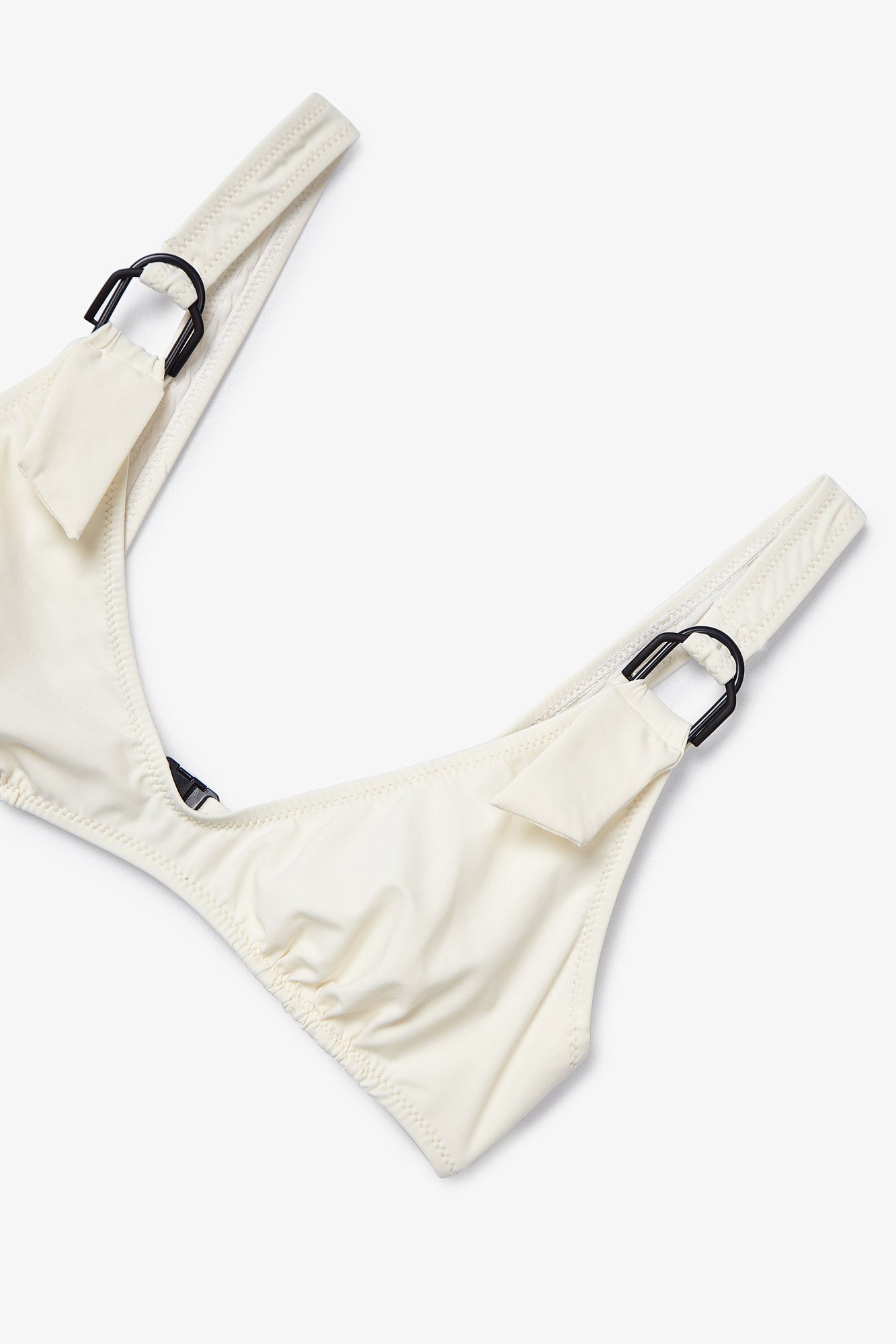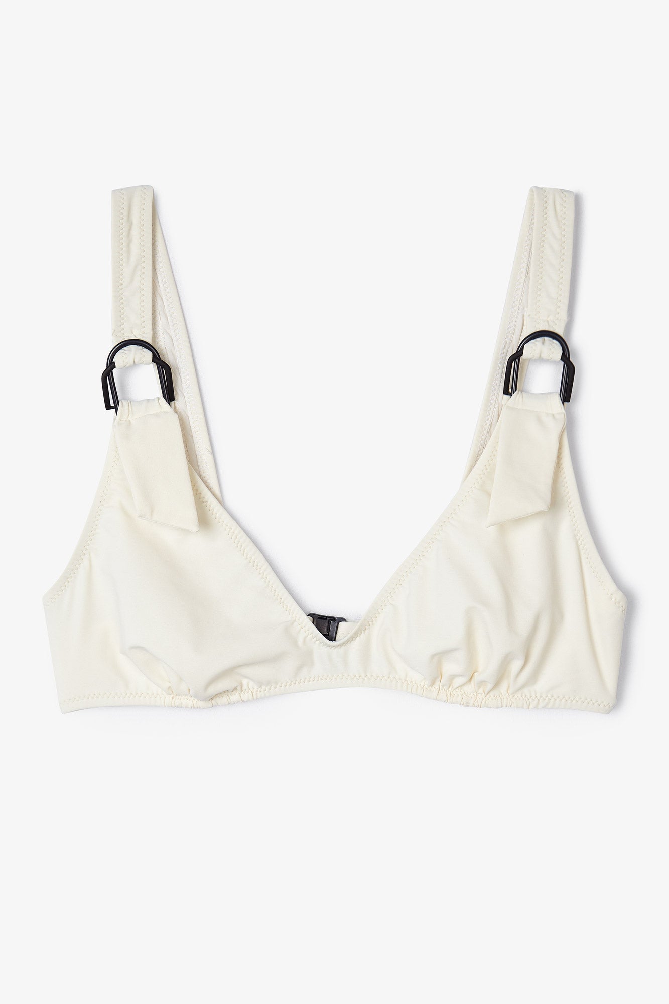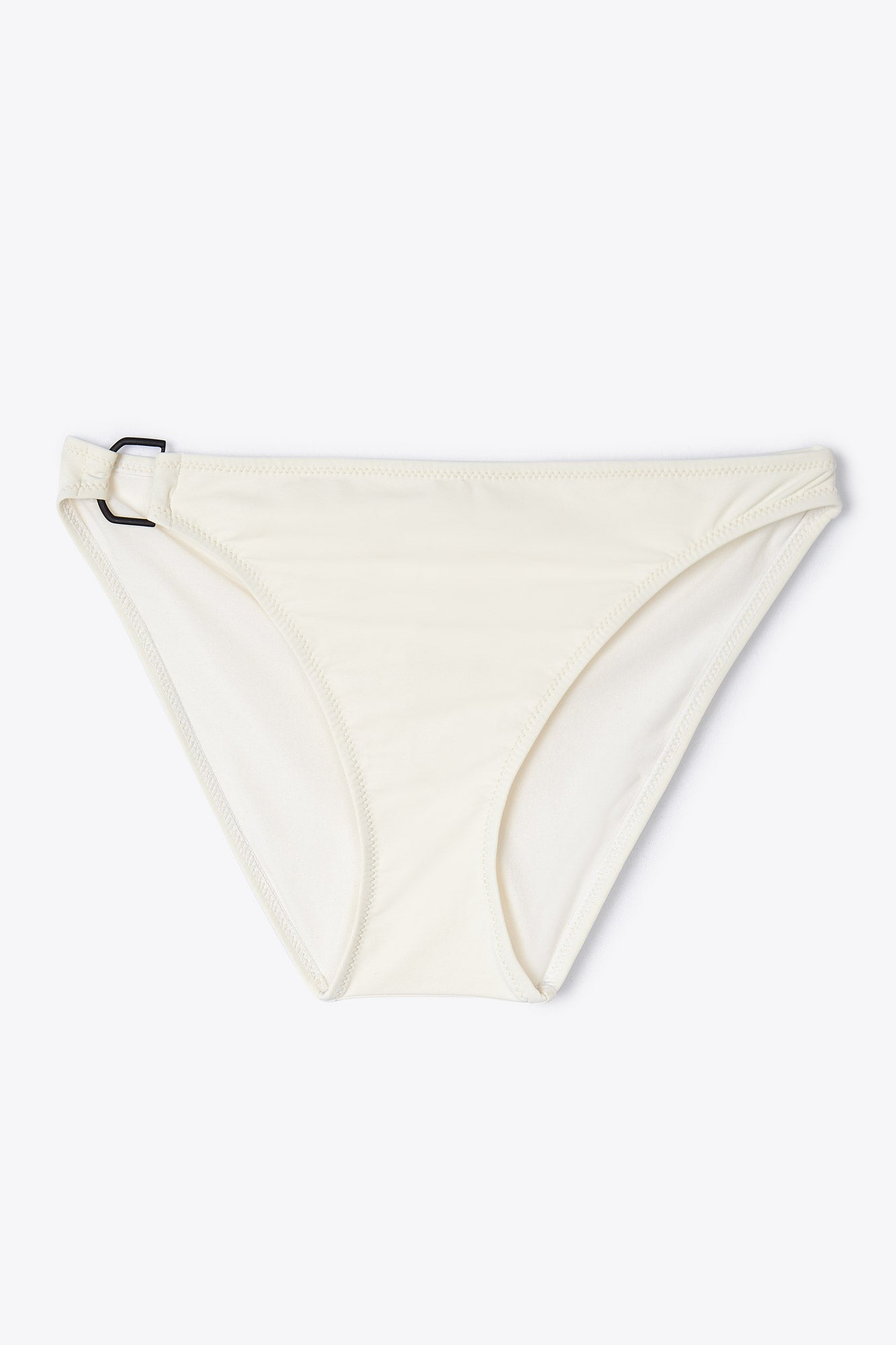 Este bikini es ideal y hará resaltar tu moreno este verano. Top de bikini con escote en pico confeccionado en color blanco. Tirante recto con detalle de hebilla en color negro incorporada en los tirantes. Cierre en la espalda mediante un cierre metálico. Braguita baja confeccionada en color crudo. Detalle de hebilla en color negro en el lado derecho.