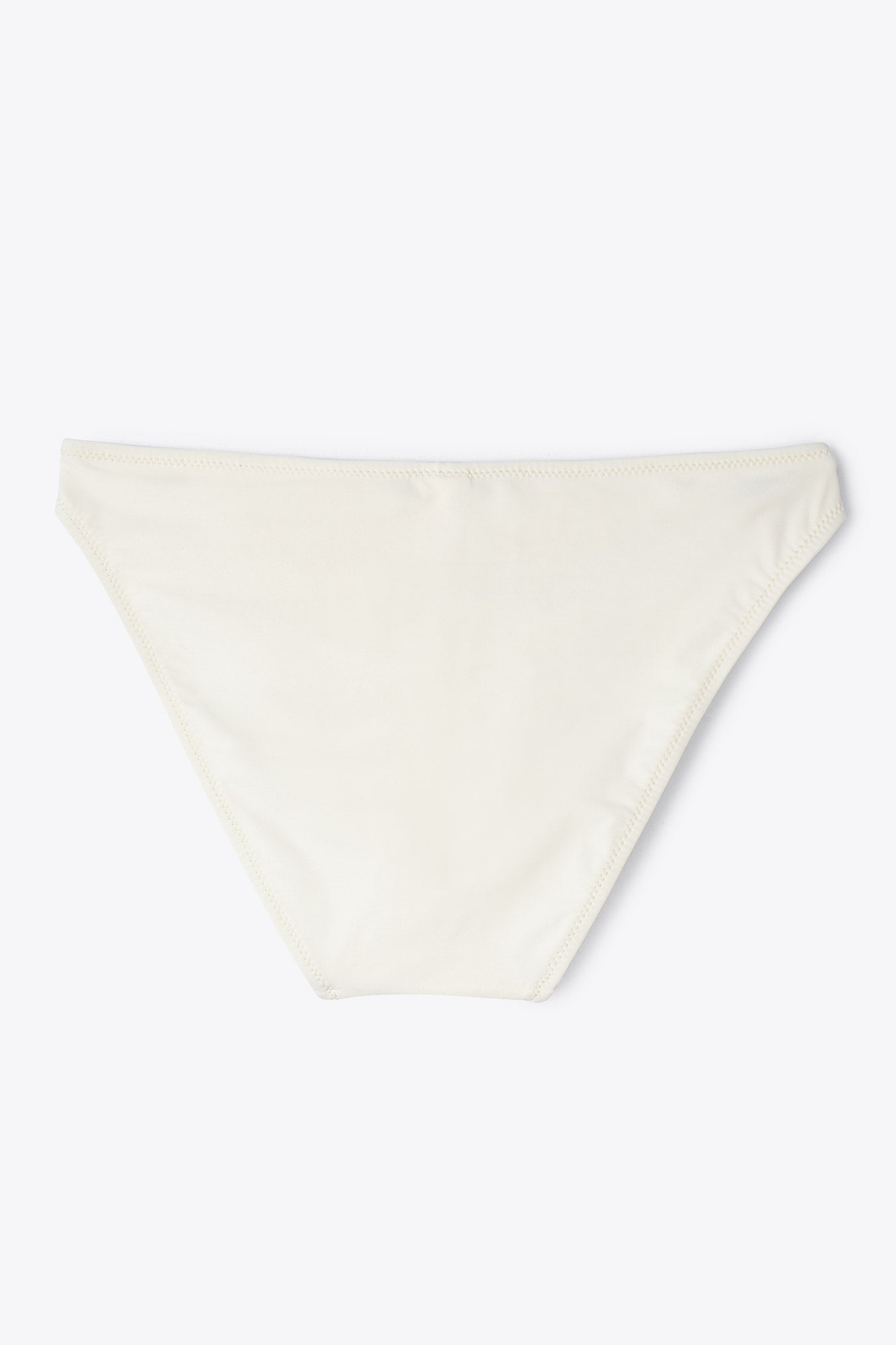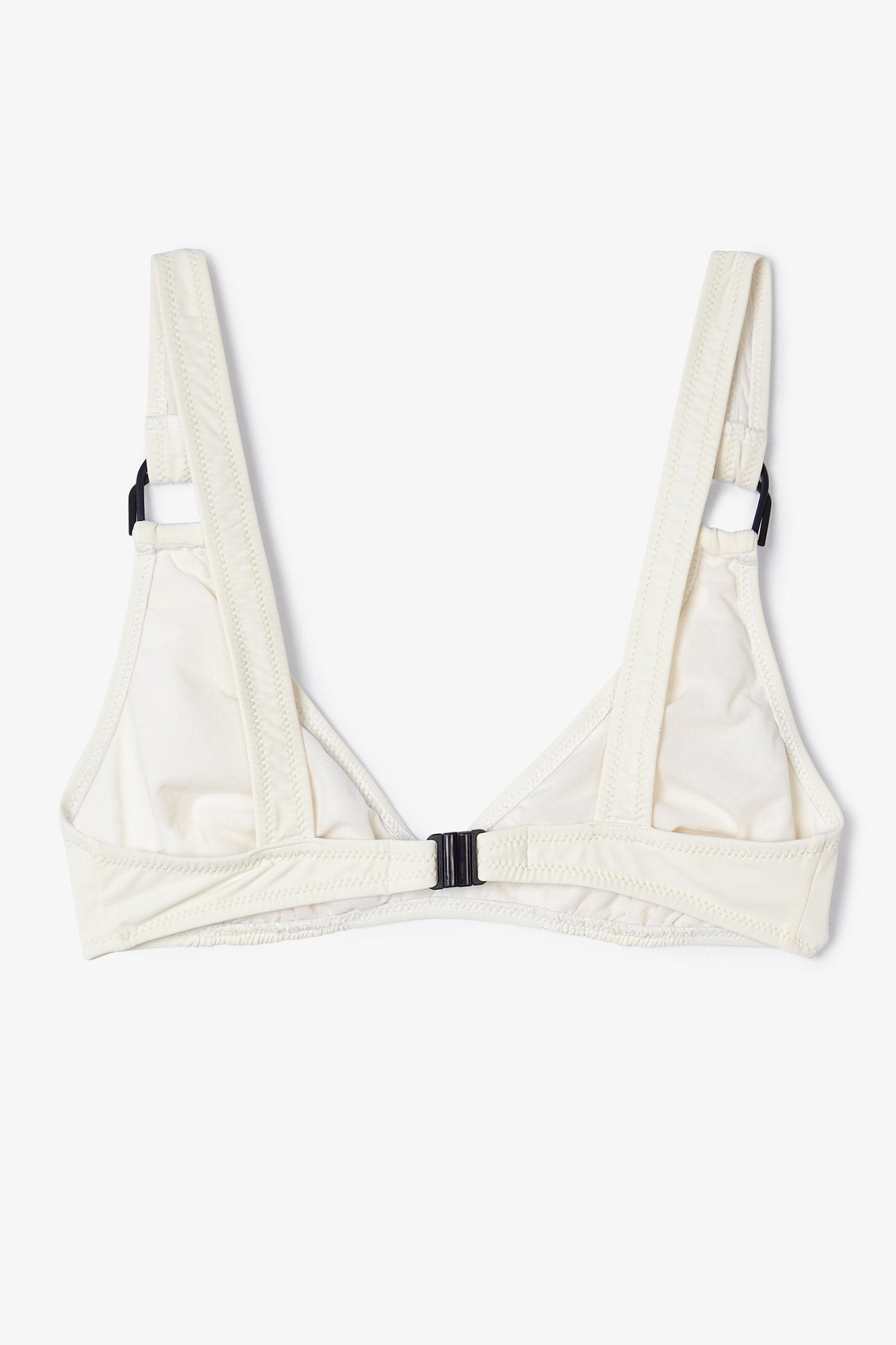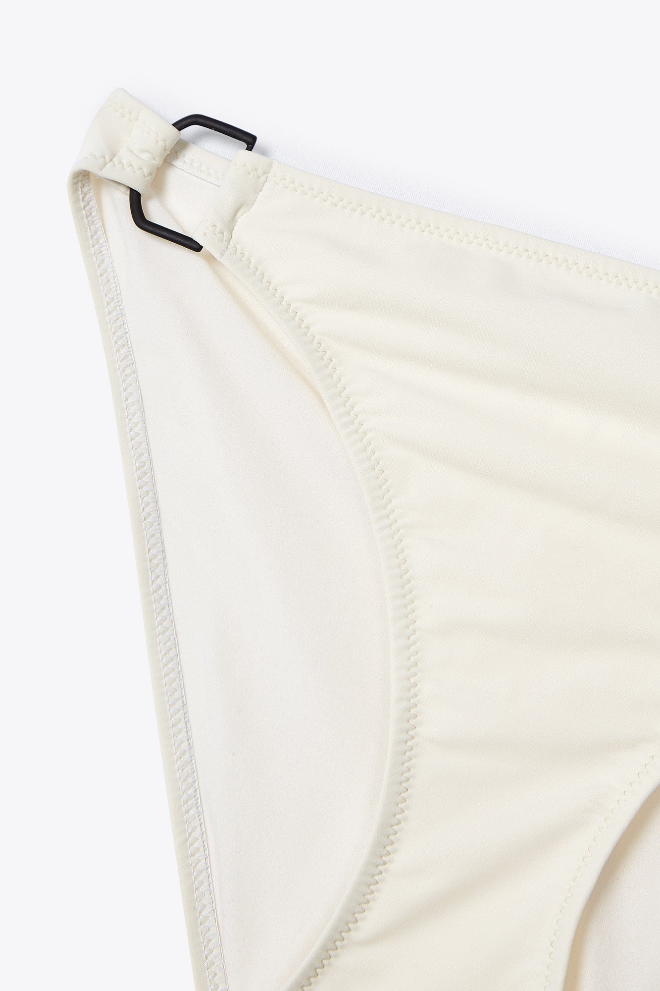 Este bikini es ideal y hará resaltar tu moreno este verano. Top de bikini con escote en pico confeccionado en color blanco. Tirante recto con detalle de hebilla en color negro incorporada en los tirantes. Cierre en la espalda mediante un cierre metálico. Braguita baja confeccionada en color crudo. Detalle de hebilla en color negro en el lado derecho.