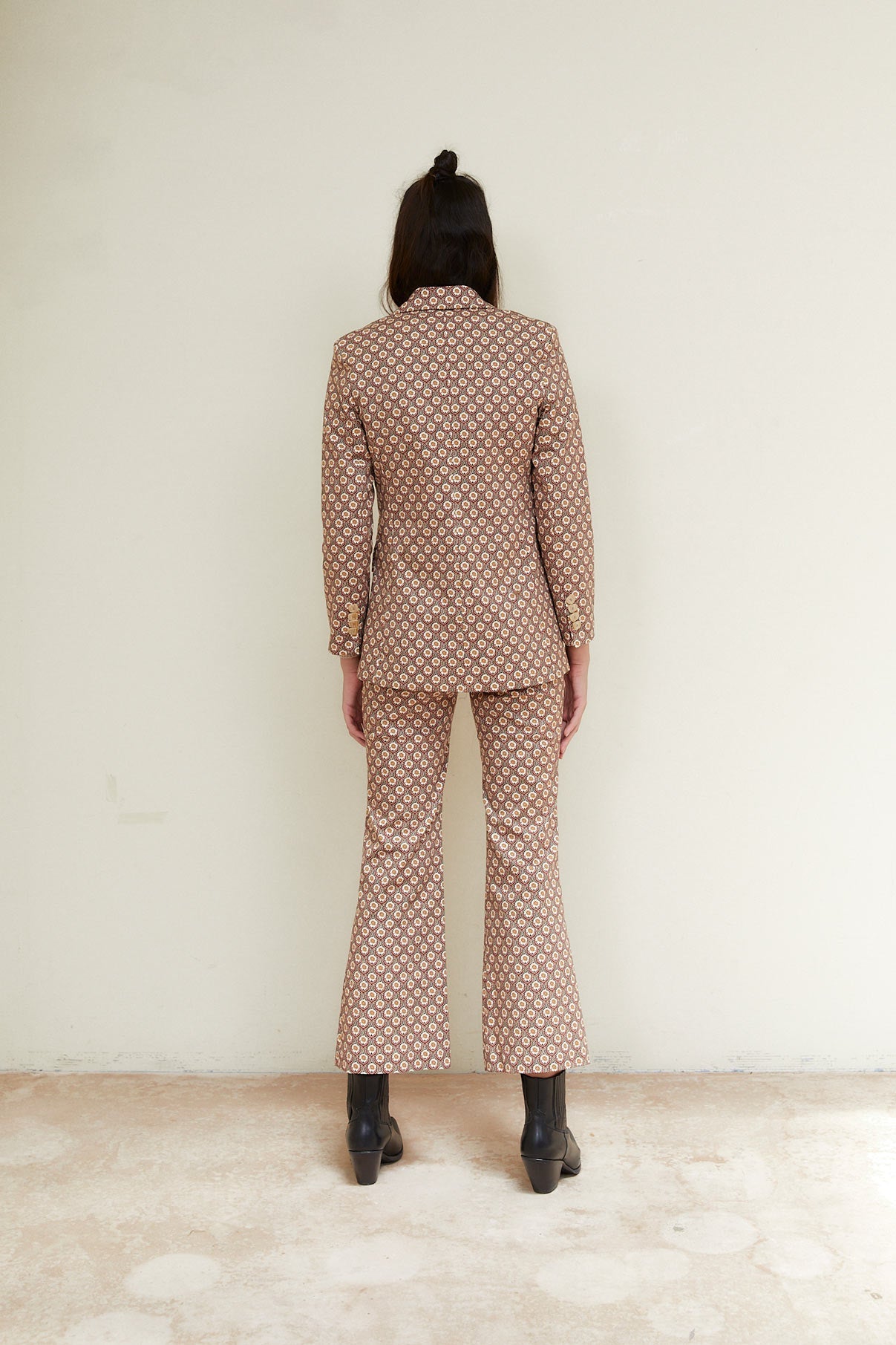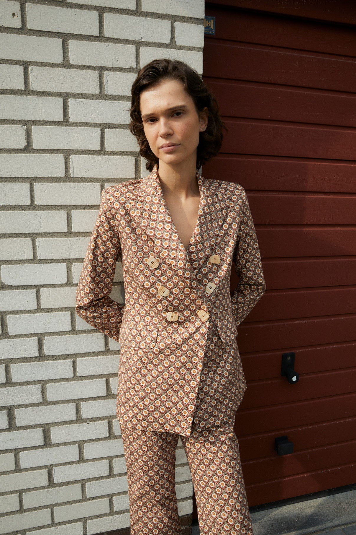 Blazer cruzada confeccionada en tejido de flores. Cierre cruzado de botones en el delantero y bolsillos de solapa.
