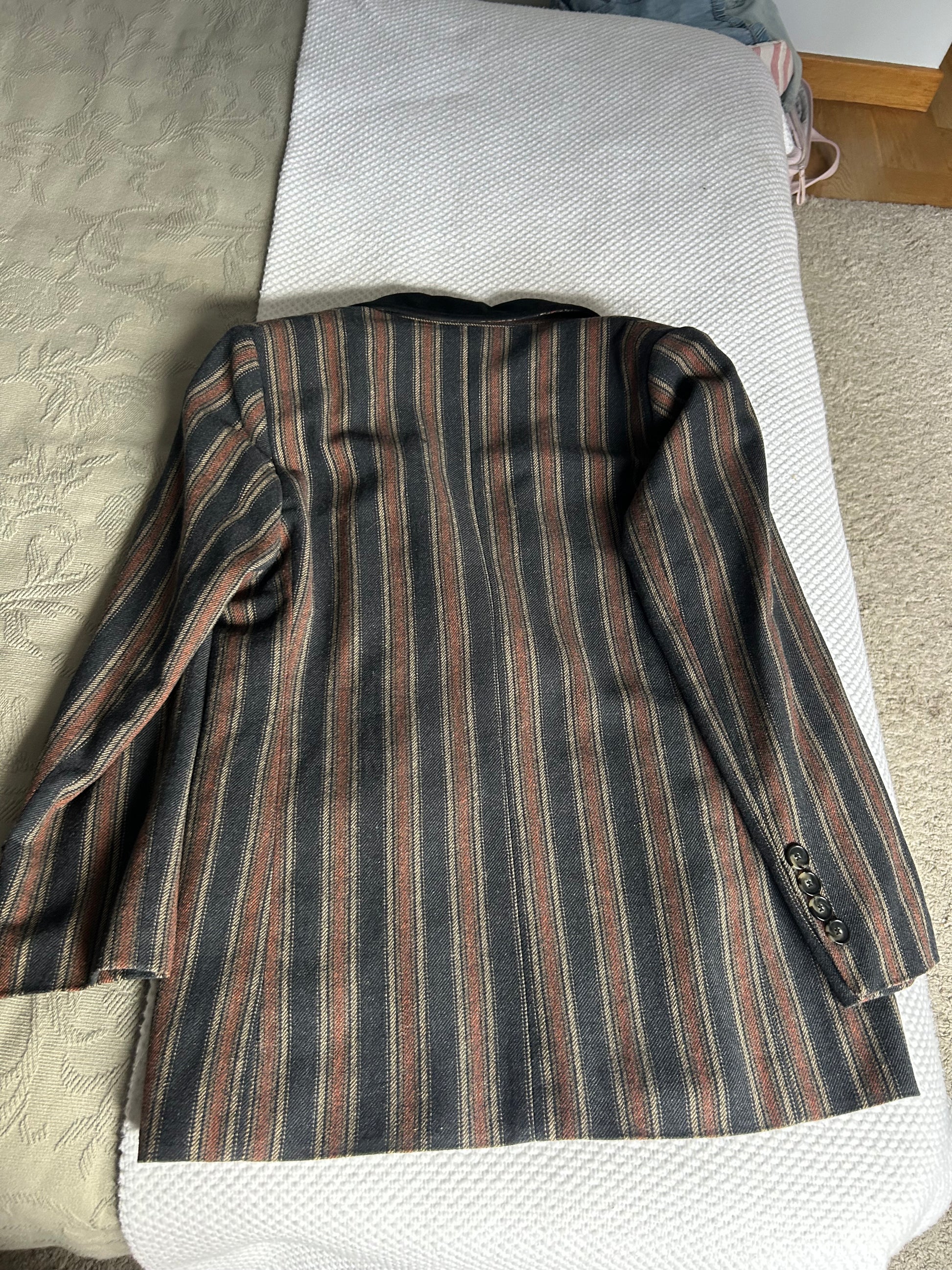 Blazer confeccionada en tejido de rayas con fit oversize, cuello y bolsillos con solapa. Detalle de solapa en terciopelo negro y botones en ecocarey. Cierre delantero con doble botonadura.