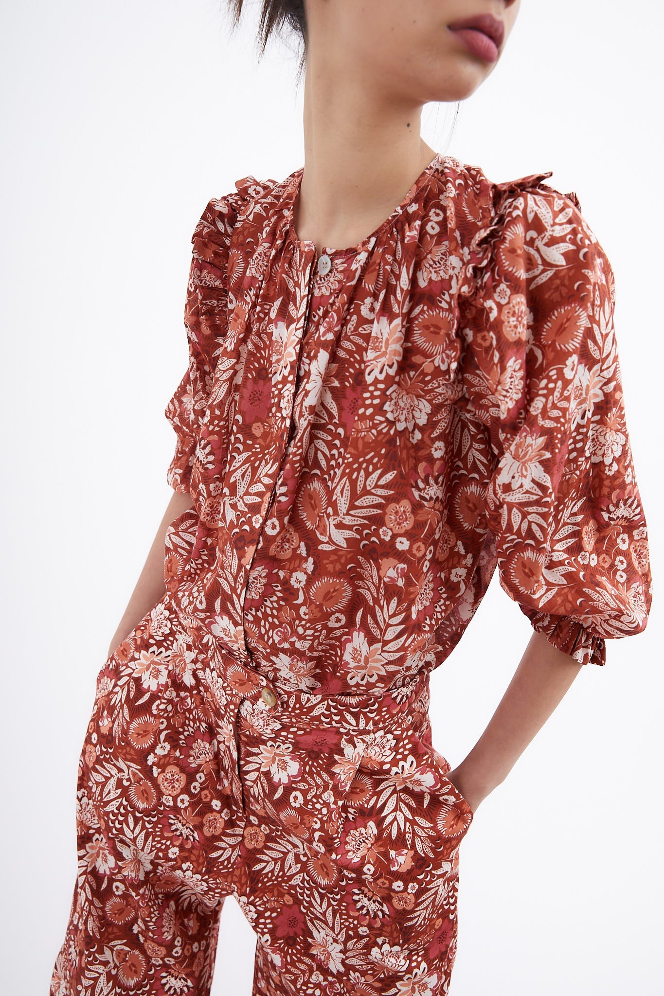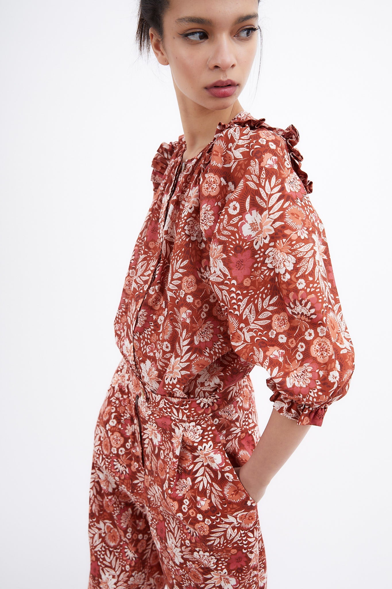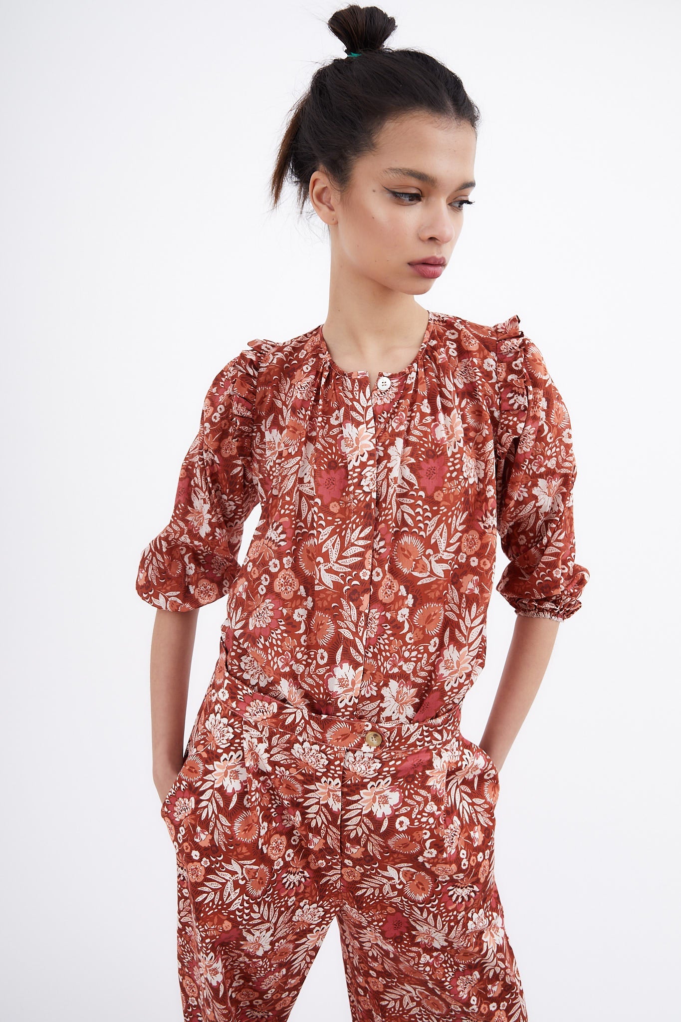 Blusa confeccionada en tejido de algodón 100% con estampado flora. Blusa con escote caja y plisados en el delantero. Tiene manga 3/4 terminada con detalle de volantes en el hombro y en el puño.