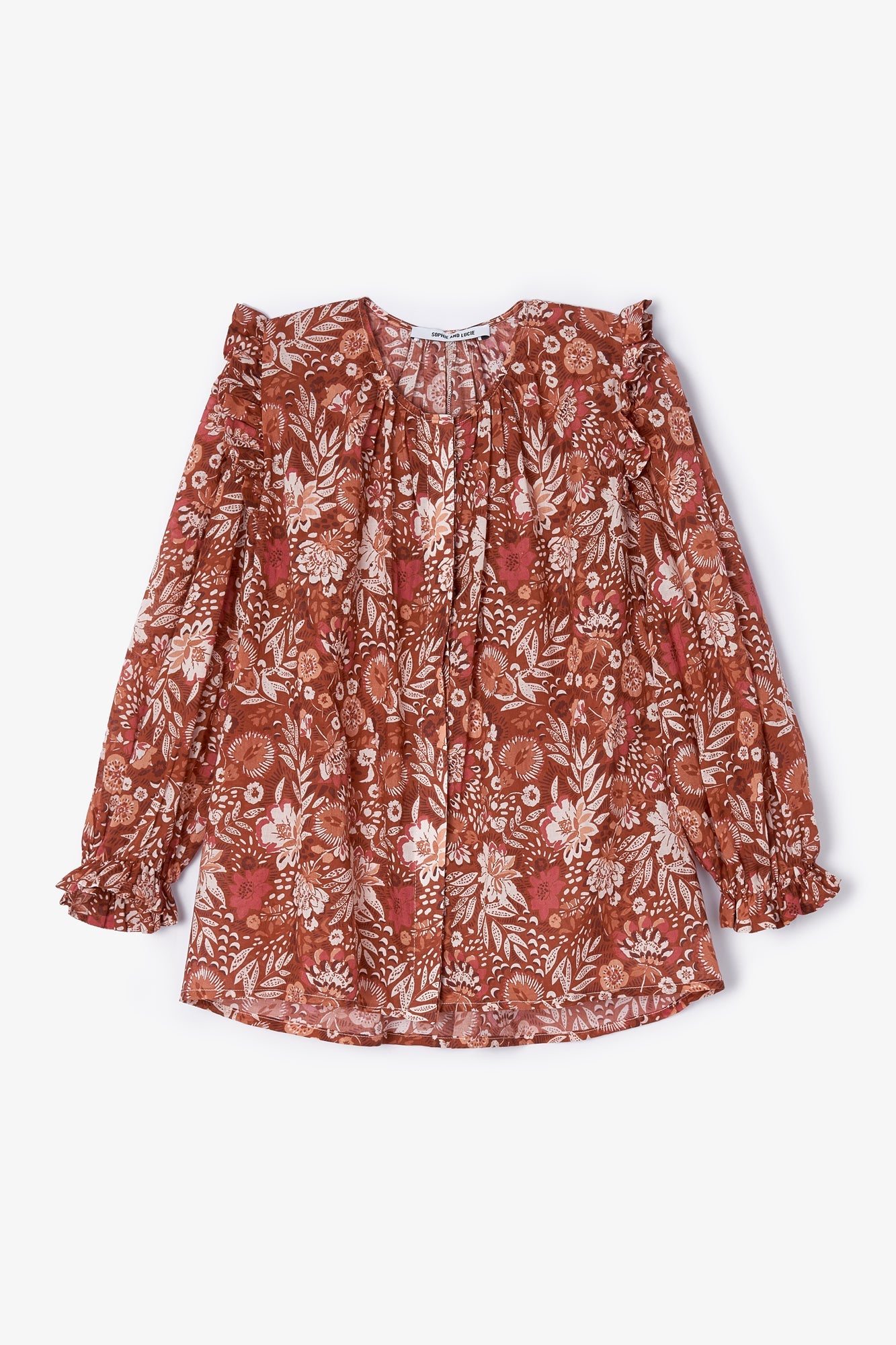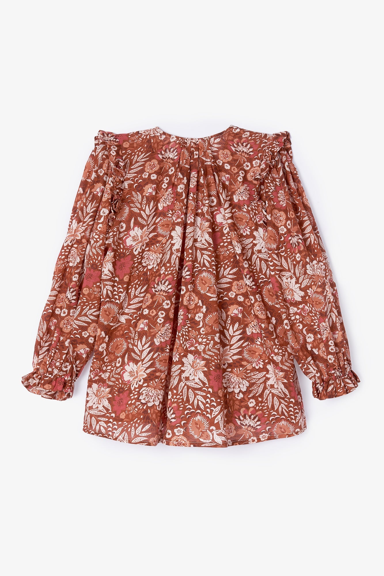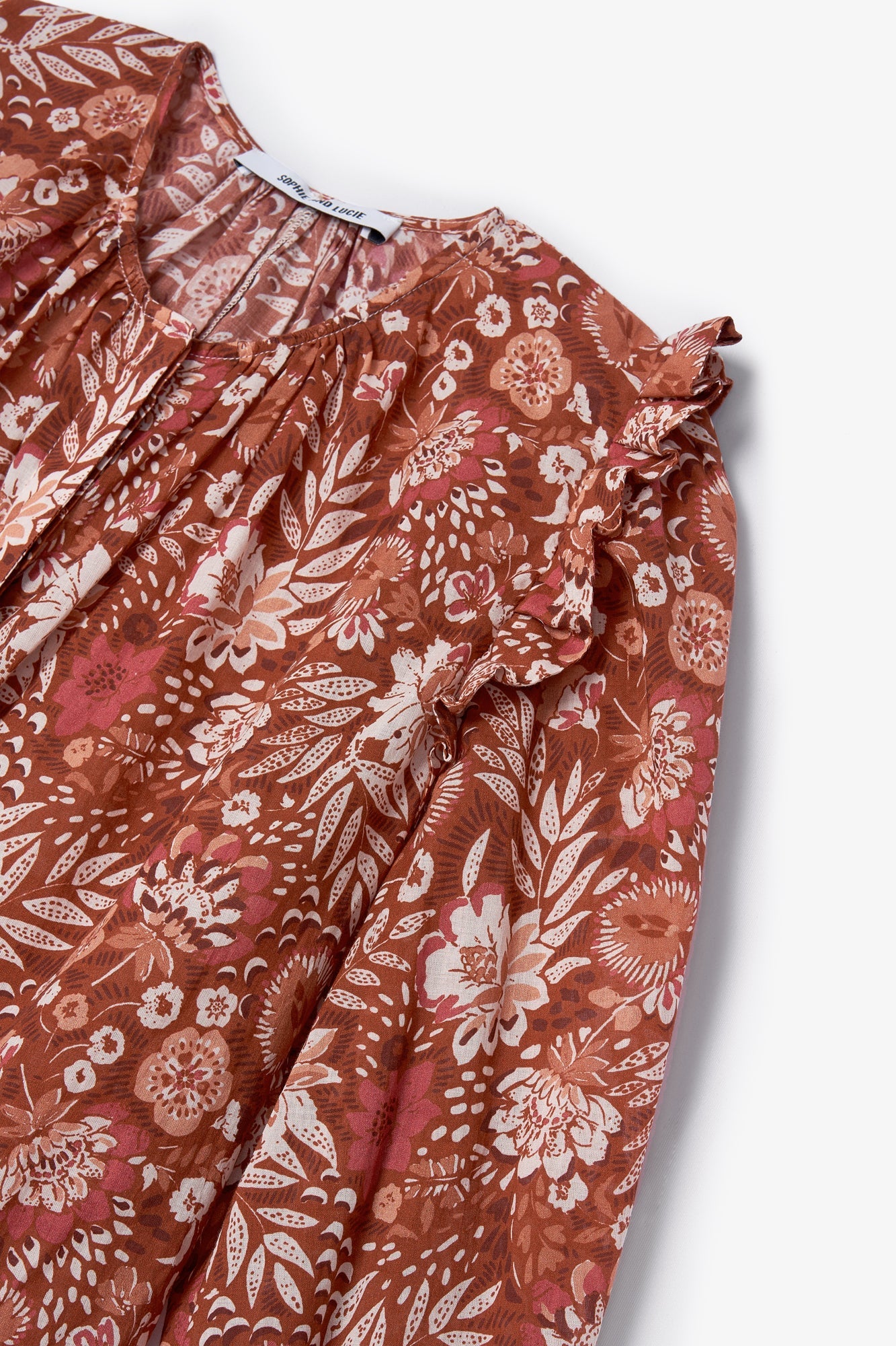 Blusa confeccionada en tejido de algodón 100% con estampado flora. Blusa con escote caja y plisados en el delantero. Tiene manga 3/4 terminada con detalle de volantes en el hombro y en el puño.