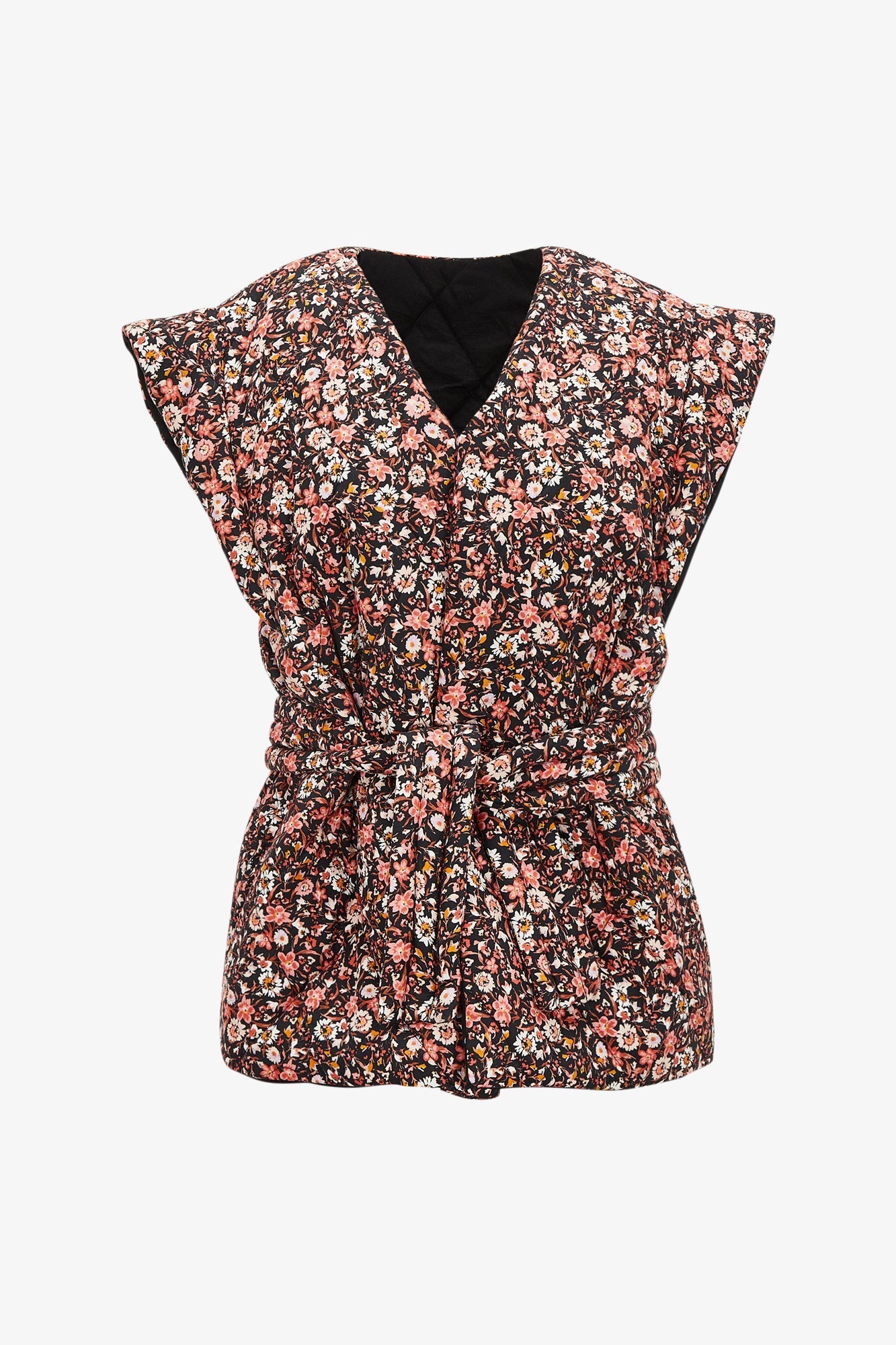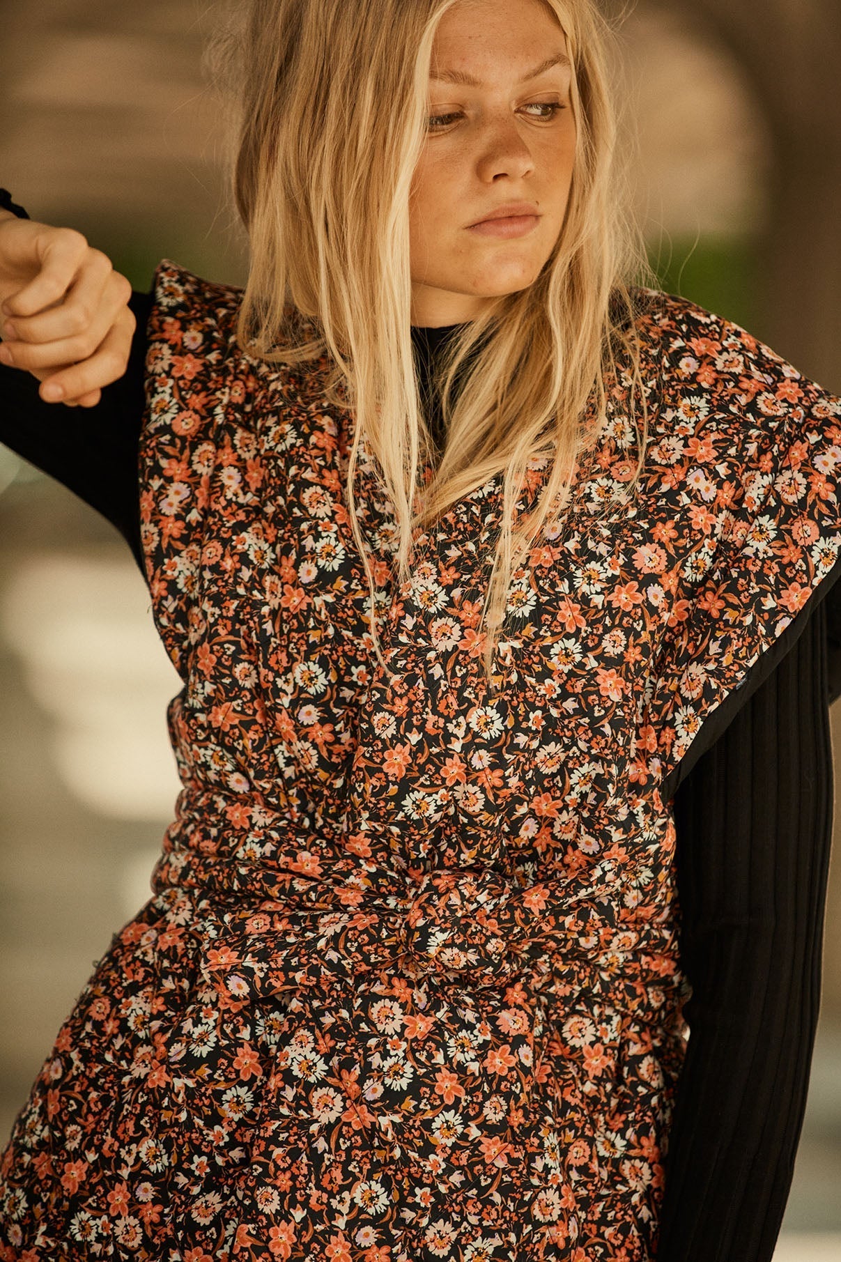 Nuestro primer chaleco llega en la colección #anytimeanywhere exclusiva de venta en la web. Es un chaleco acolchado y reversible, por un lado estampado de flores y por otro popelín negro. Sisa caída y largo de 70cm. Cierre con cinturón del mismo tejido.