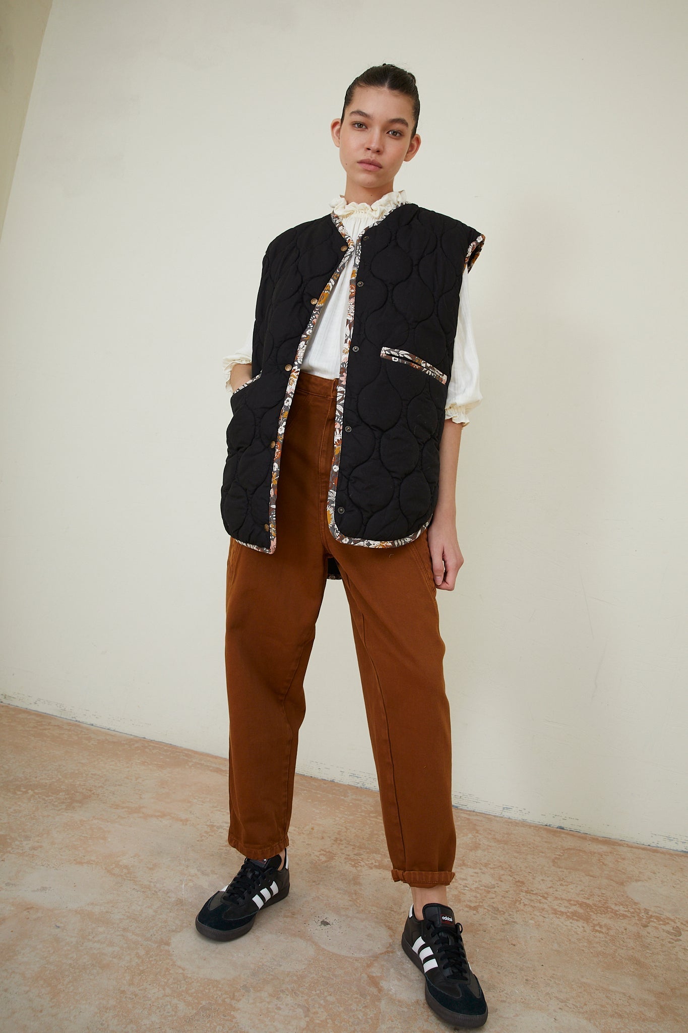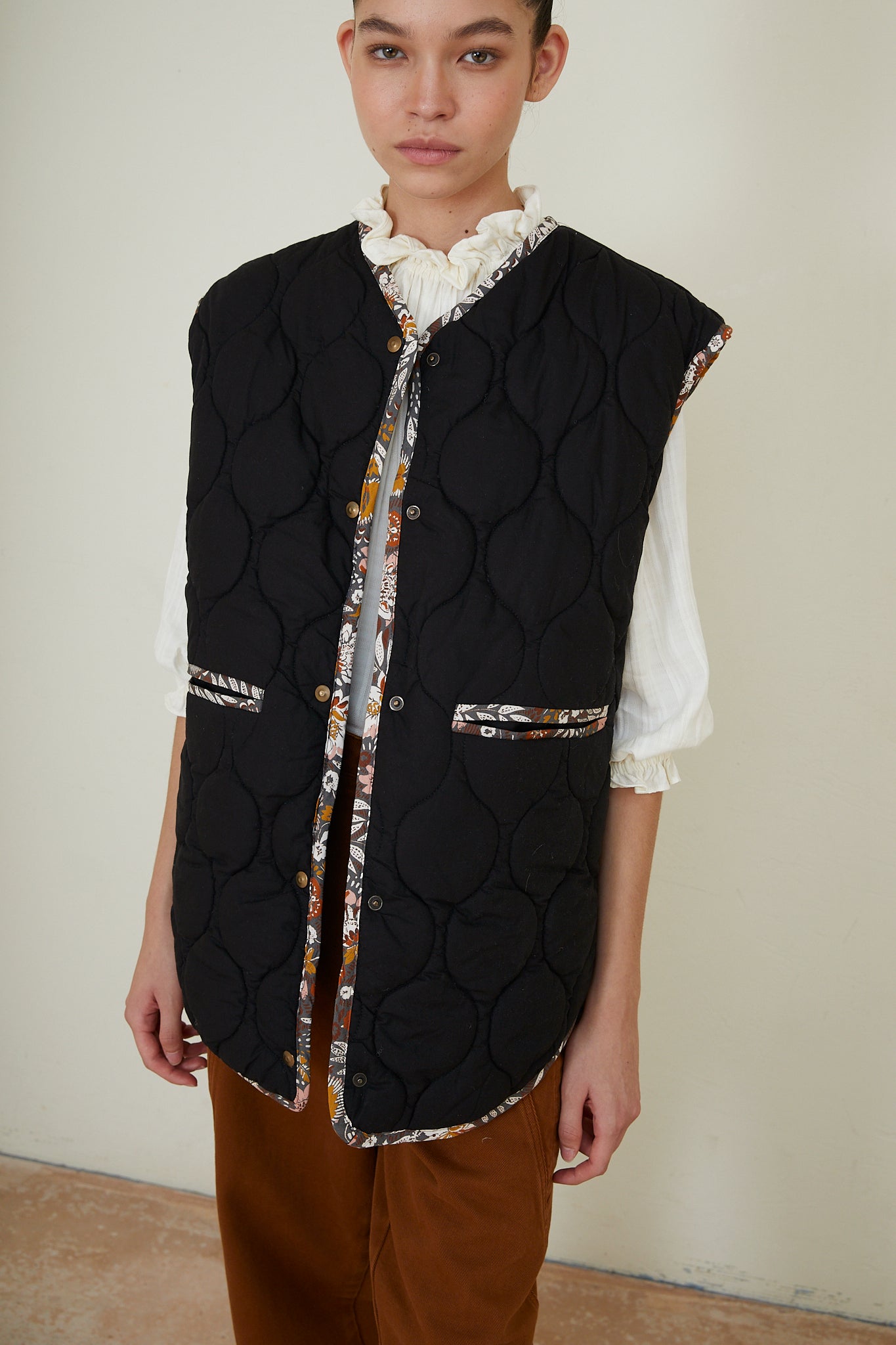 Chaleco guateado con fit oversice confeccionado en negro con vivos en el tejido estampado de flores de la temporada. Bolsillos laterales y cierre frontal de snaps.