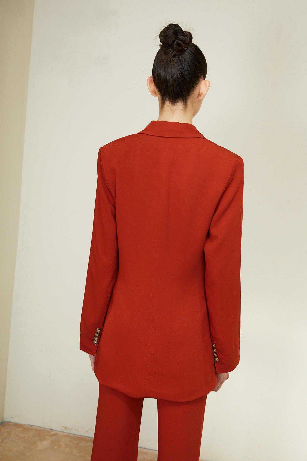 Blazer con fit entallado con manga larga y hombro marcado confeccionada en tejido color teja. Bolsillos de vivo con solapa en delantero. Cierre delantero cruzado con botones marrones.
