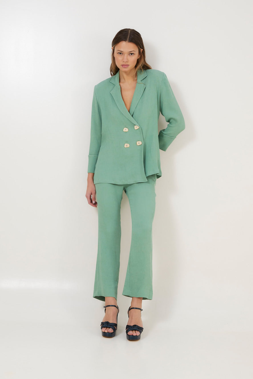 Nuestra prenda mas icónica, la chaqueta pijamera cuatro botones, una chaqueta color verde agua, desestructurada y fluida con fit relajado. Cuatro botones a contraste en color crudo que se han quedado como nuestro signo de identidad.