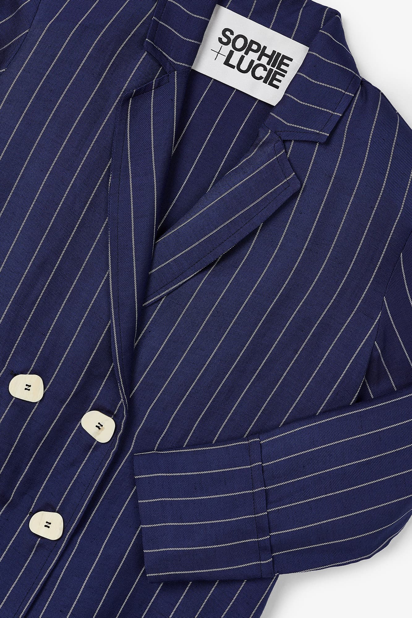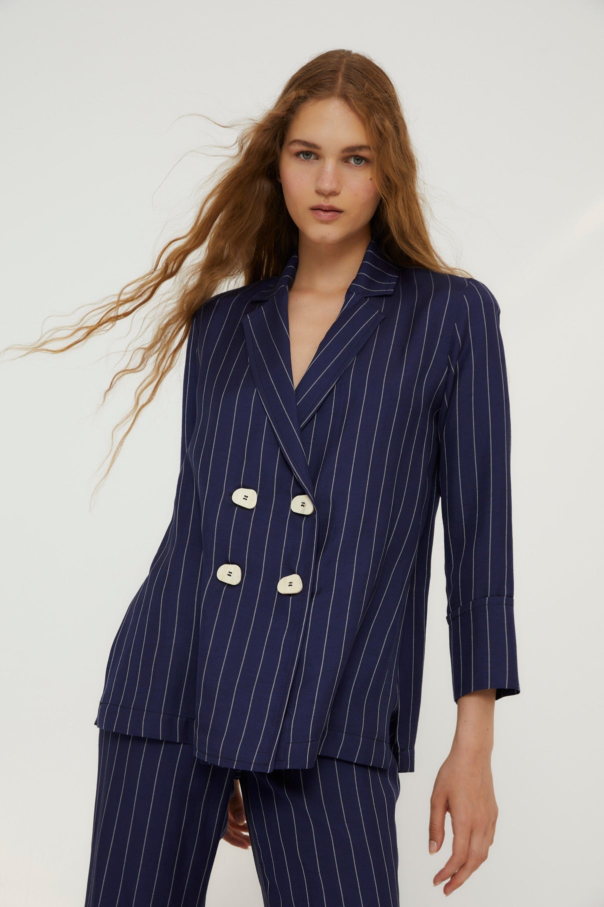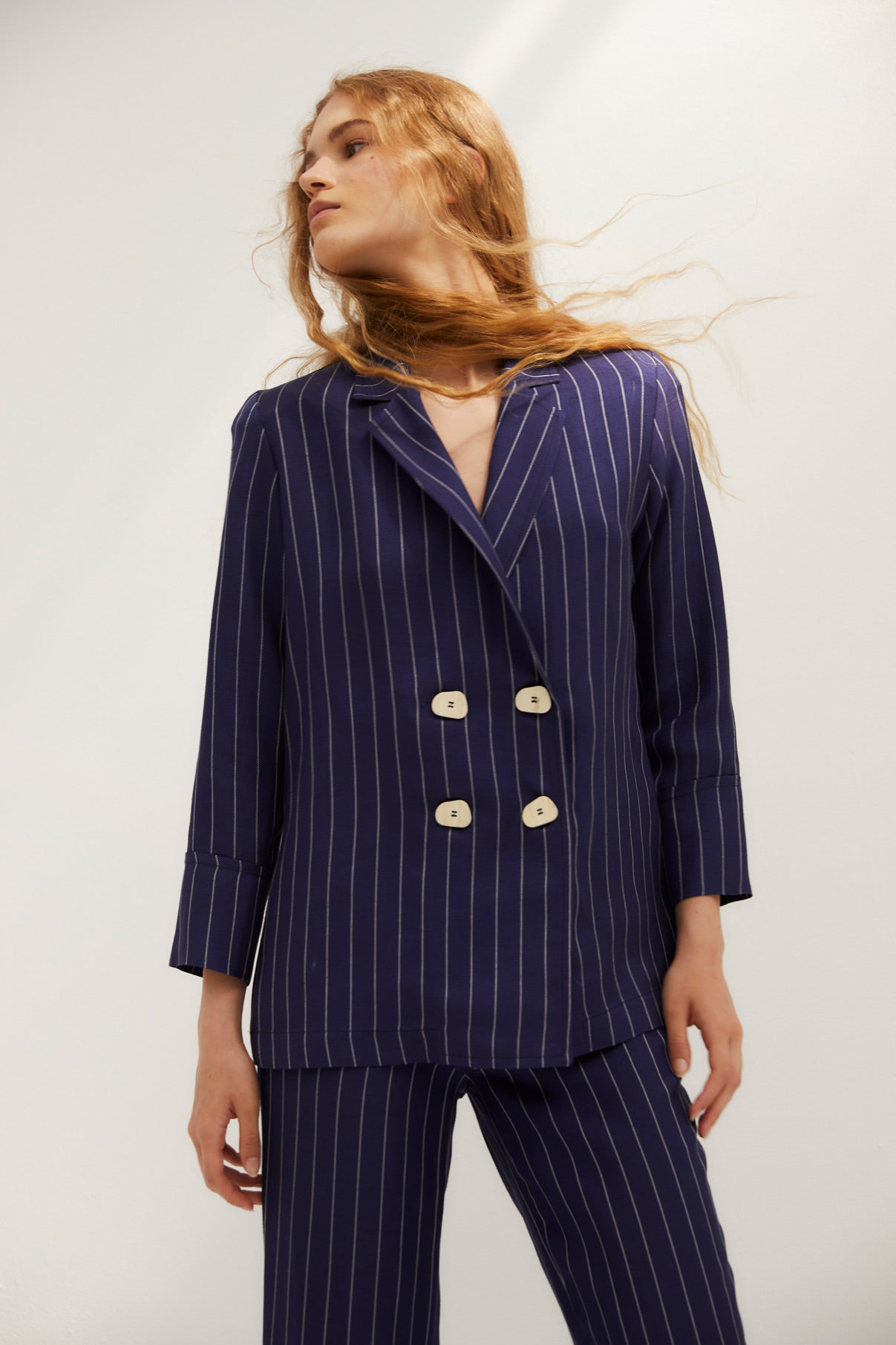 Nuestra chaqueta Icon, chaqueta pijamera cuatro botones, desestructurada, fluida, con fit relajado y escote blazer. Chaqueta confeccionada en un tejido de rayas estilo diplomático color azul. Chaqueta con cuatro botones a contraste en color crudo que se han quedado como nuestro signo de identidad.