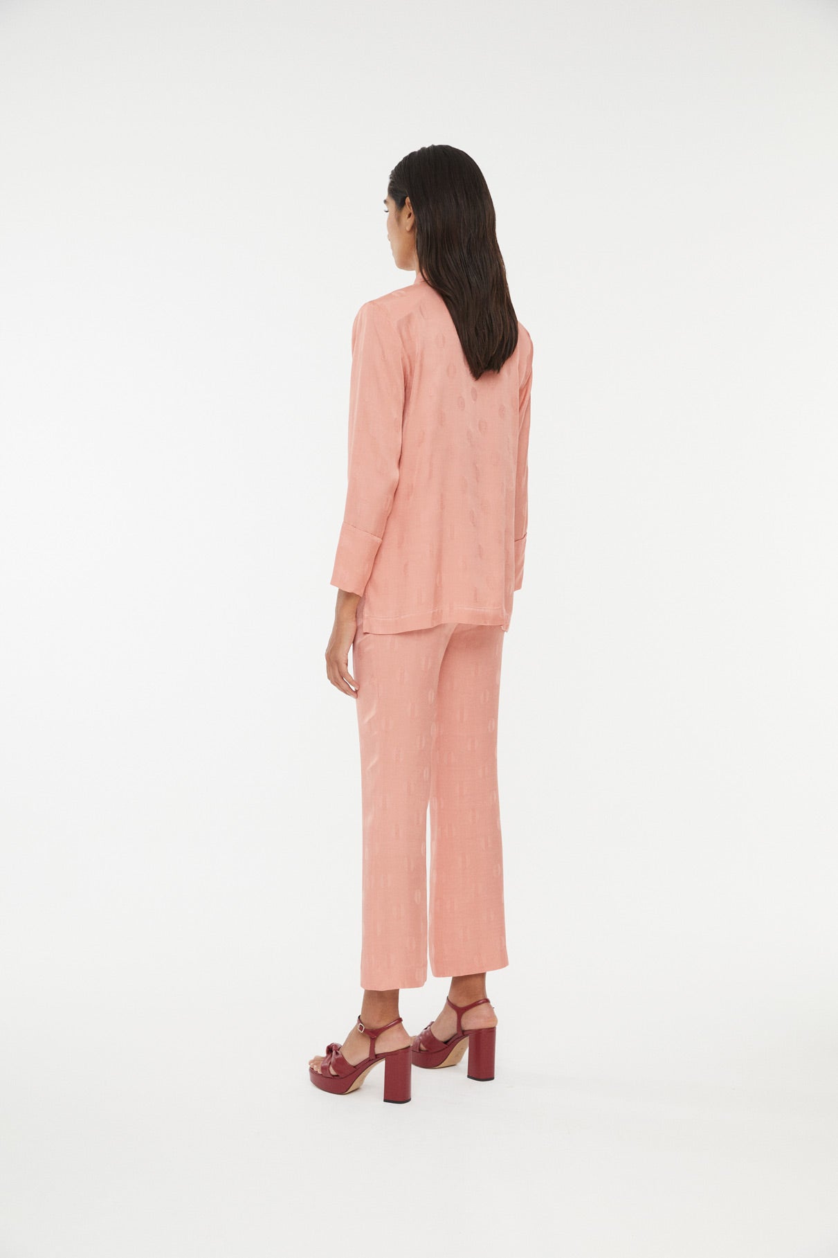 Nuestra chaqueta Icon, chaqueta pijamera cuatro botones, desestructurada, fluida, con fit relajado y escote blazer. Chaqueta confeccionada en un tejido de jacquard color rosa. Chaqueta con cuatro botones a contraste en color crudo que se han quedado como nuestro signo de identidad.
