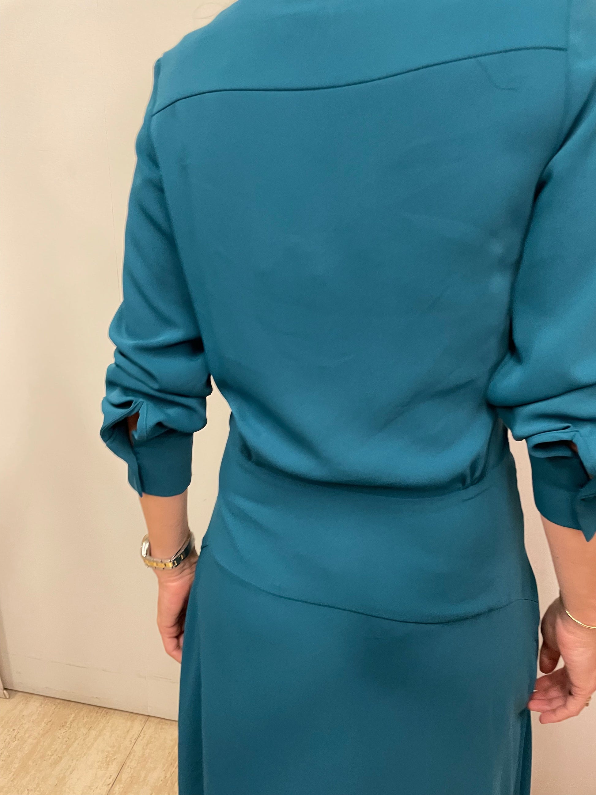 Vestido midi confeccionado en crepe en color azul cobalto. Vestido con mucha caída. Escote pico, manga larga acabada en puño con botones. Detalle de lazada en la cintura y falda irregular.