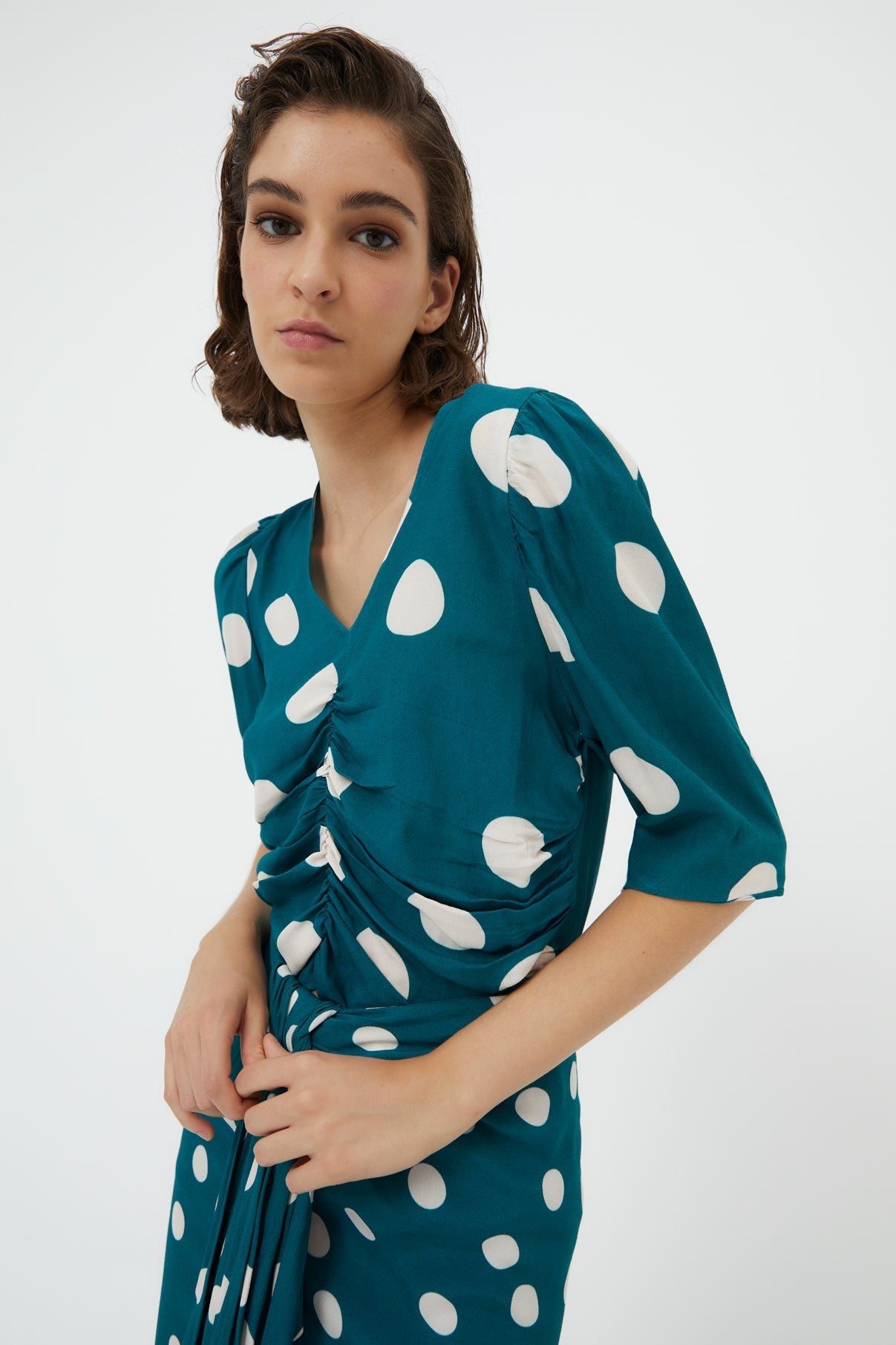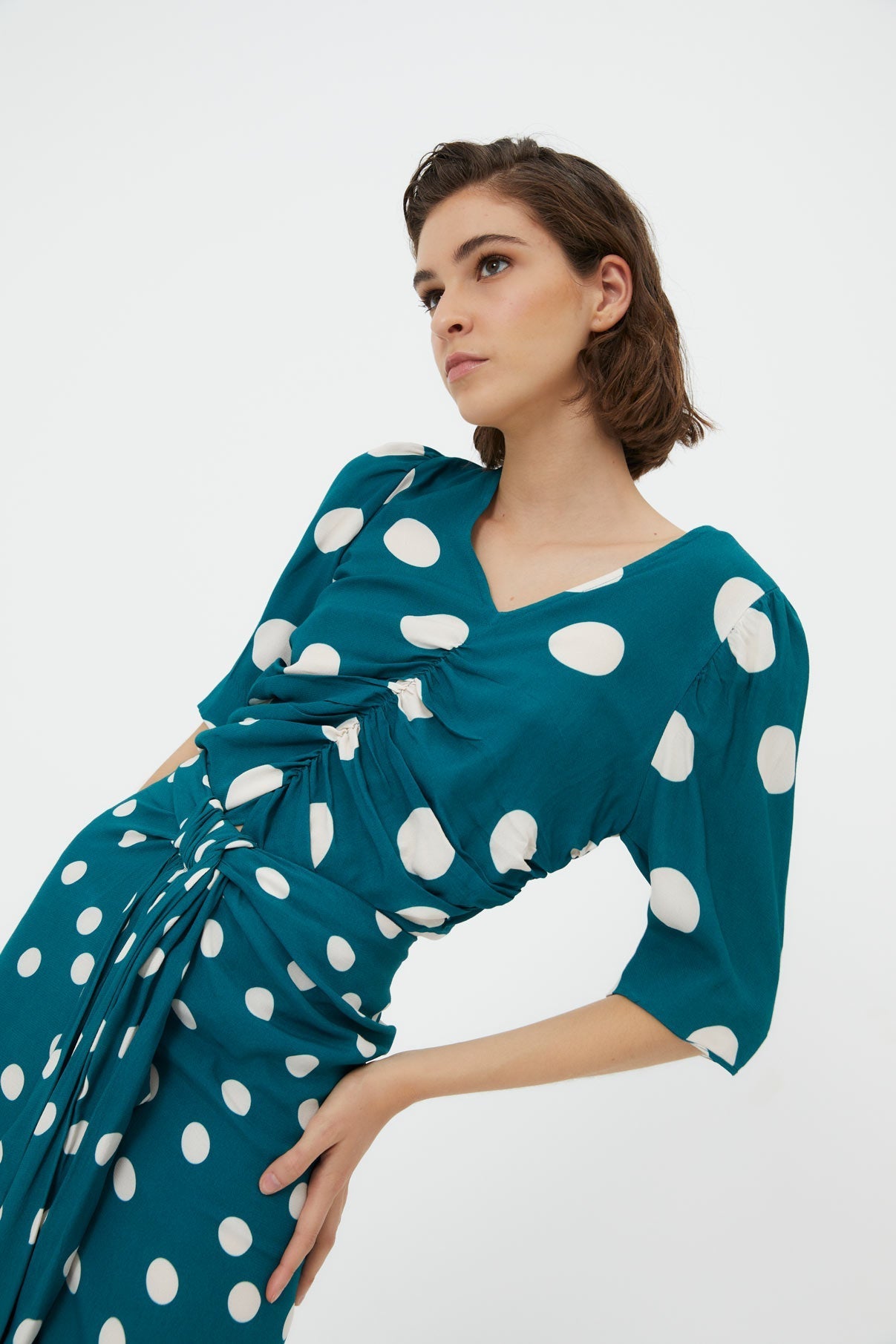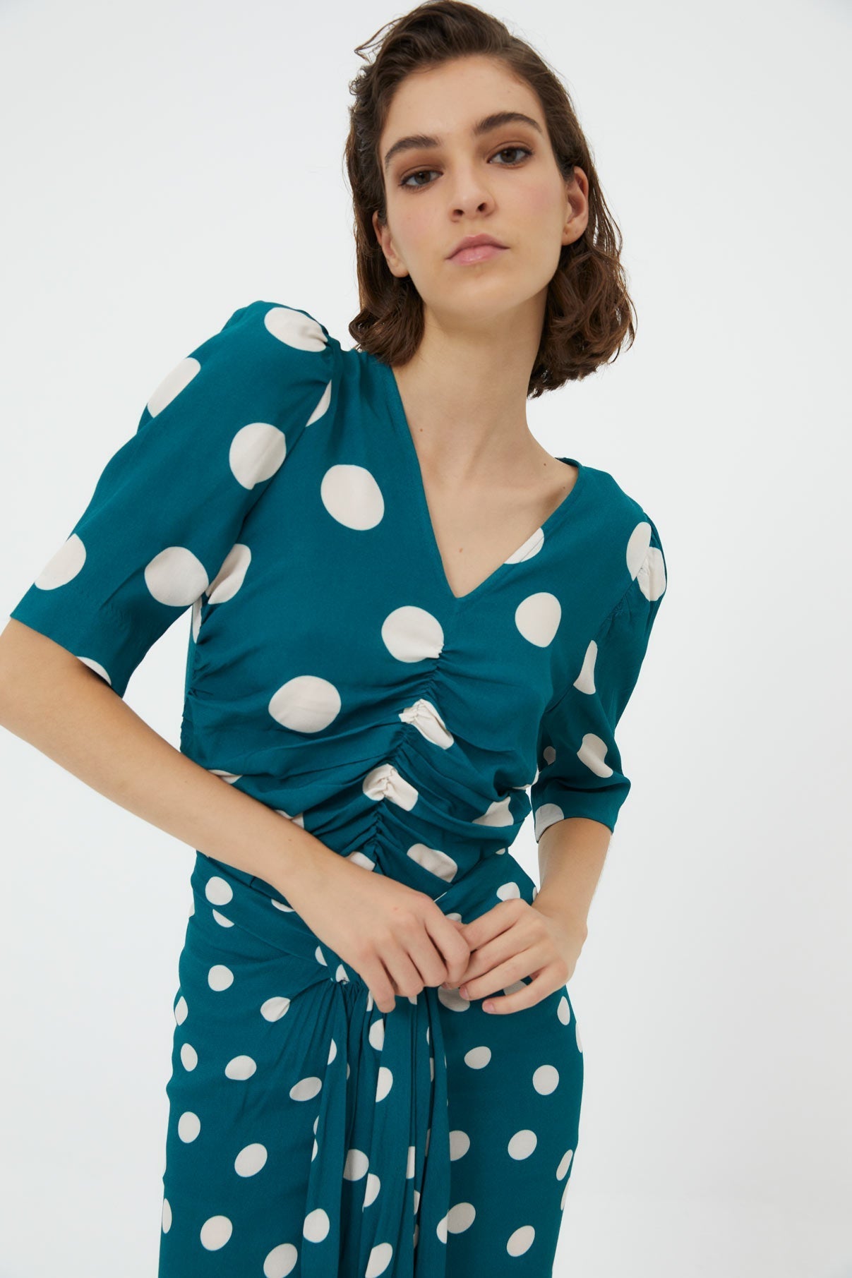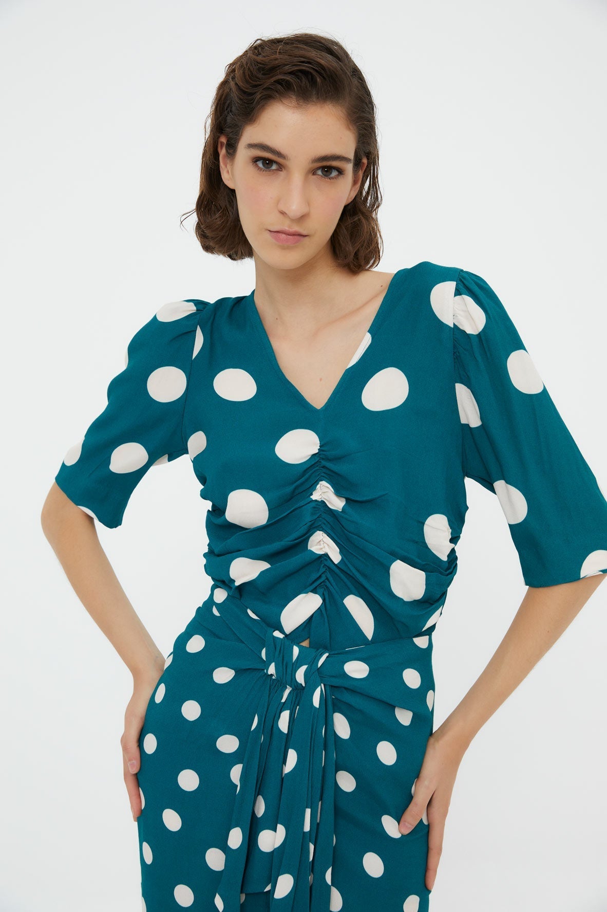 Cuerpo confeccionado en tejido estampado de lunares en color azul cobalto. Cuerpo de escote en pico, con detalle de frunces en la parte delantera de manga tres cuartos.