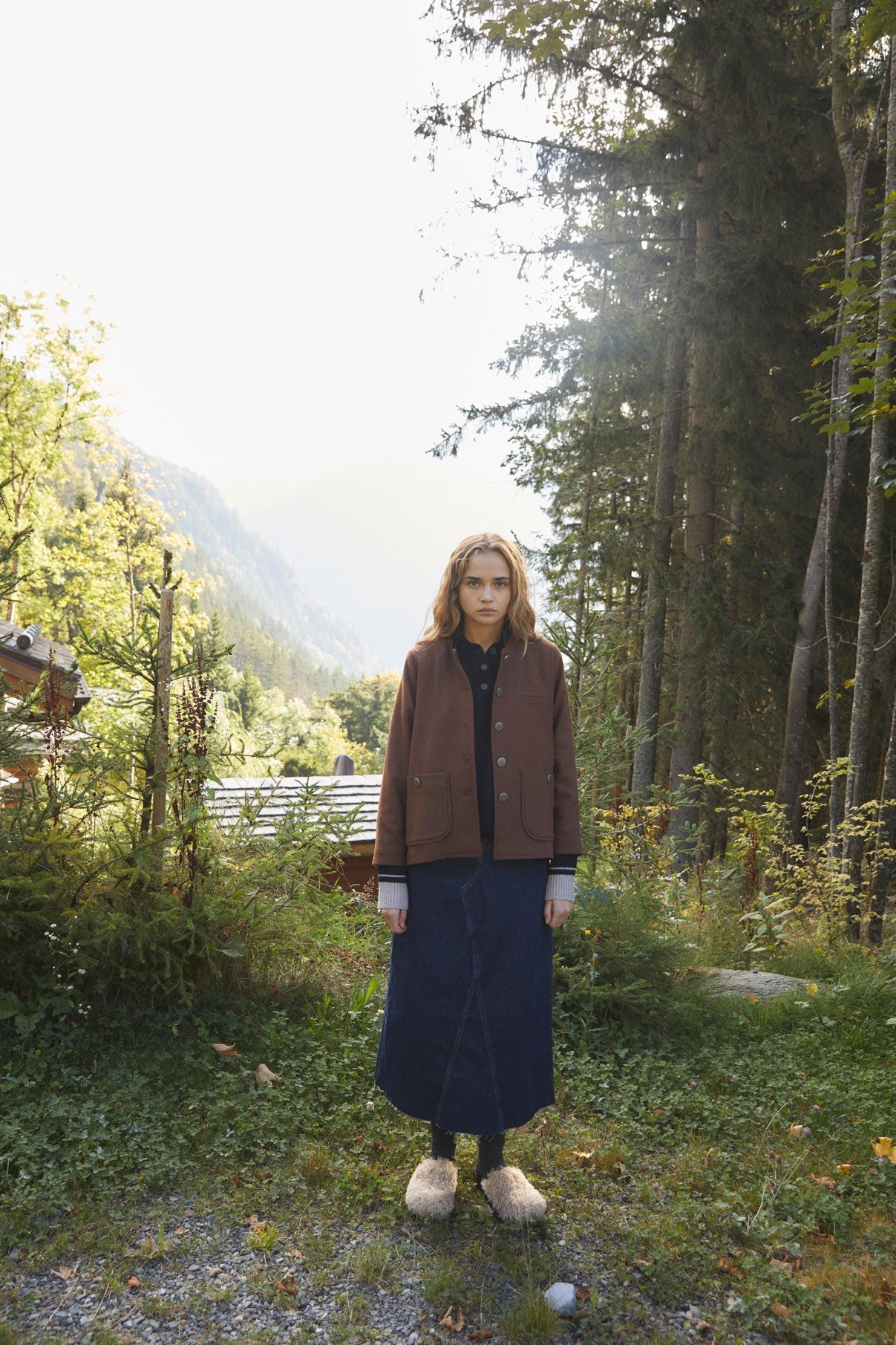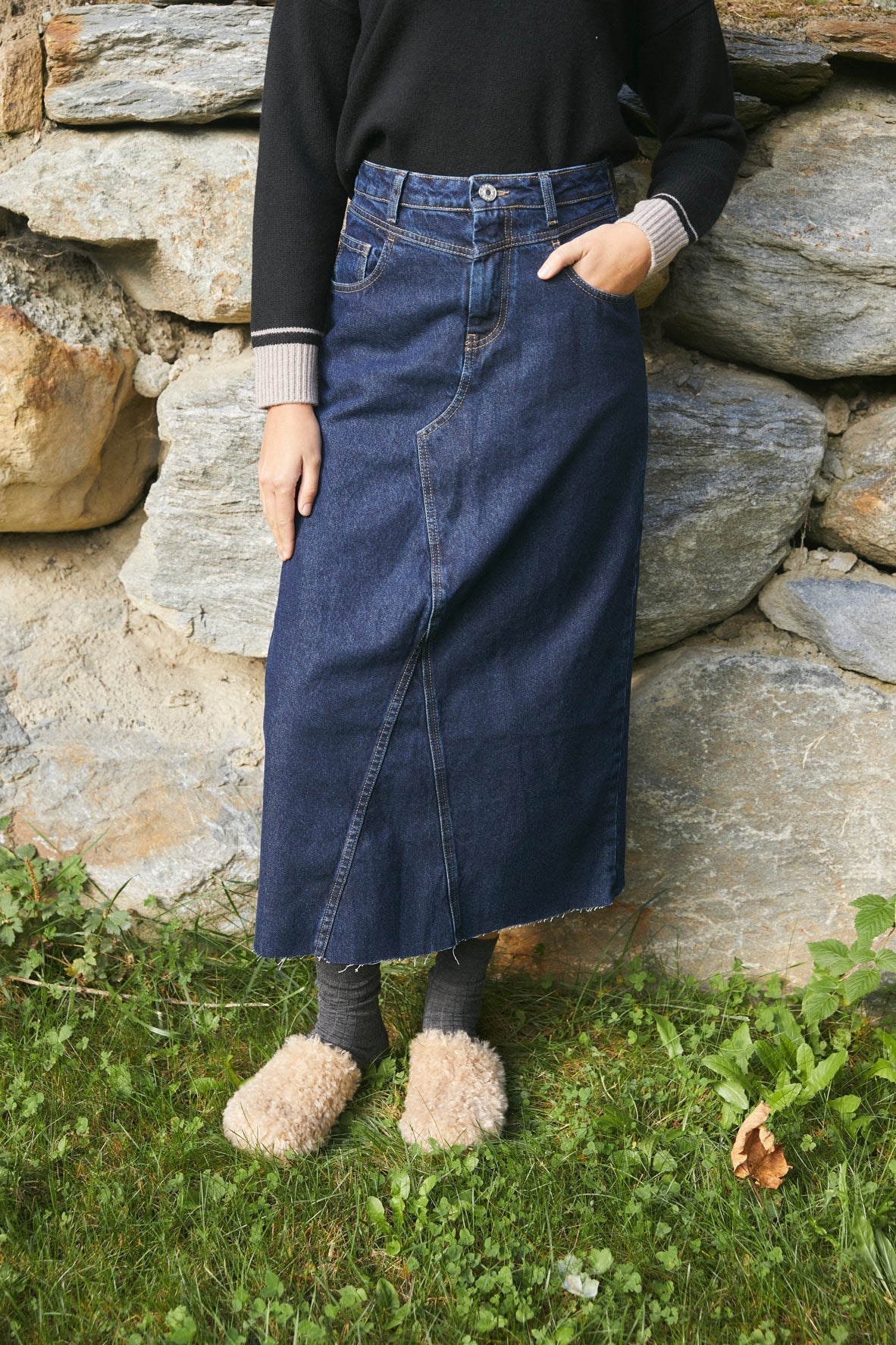 Falda larga de tiro medio, confeccionada en tejido vaquero 100% algodón en tono oscuro. Con cinco bolsillos. Bajo acabado sin costura. Cierre frontal con botón y cremallera.