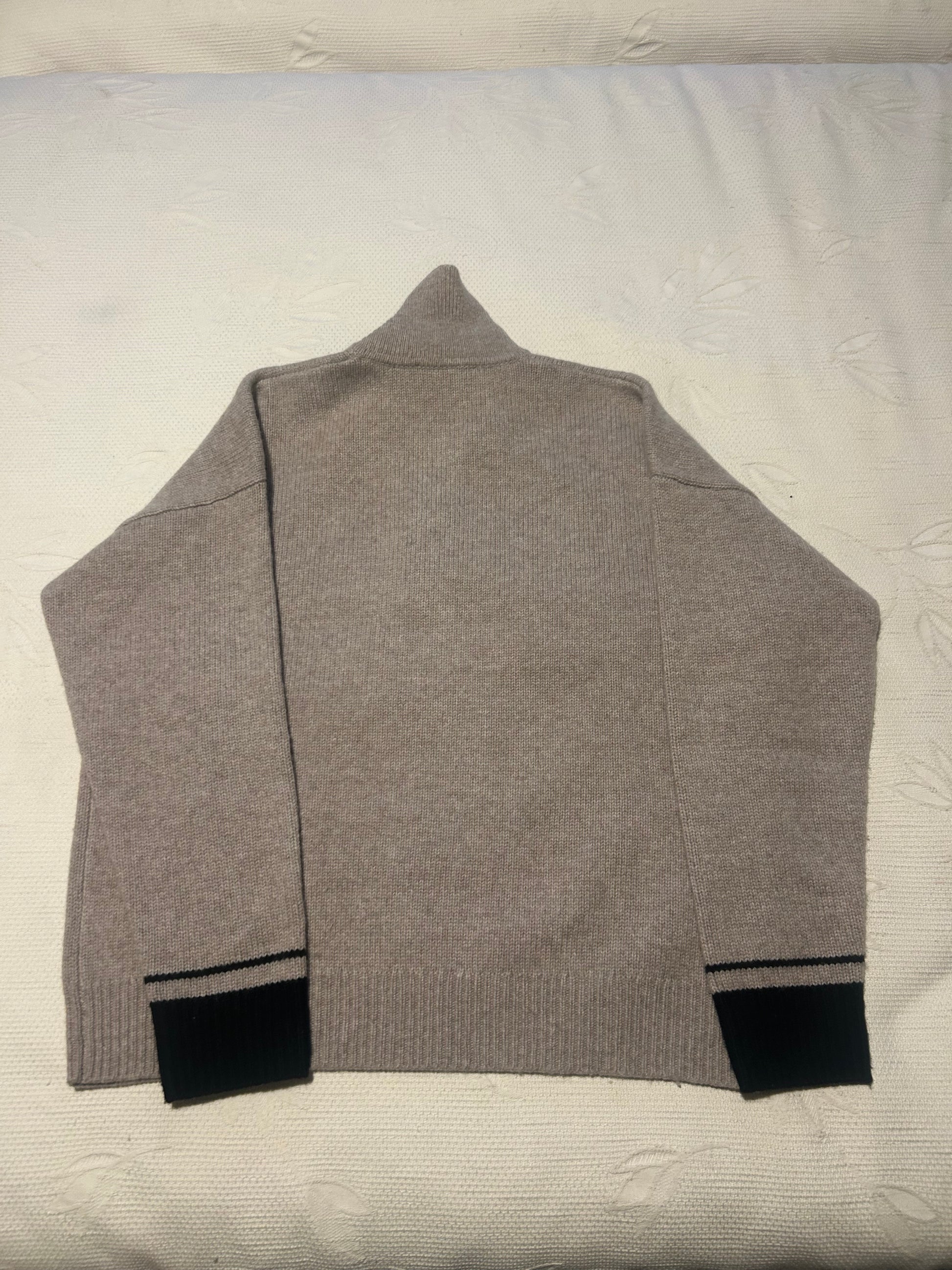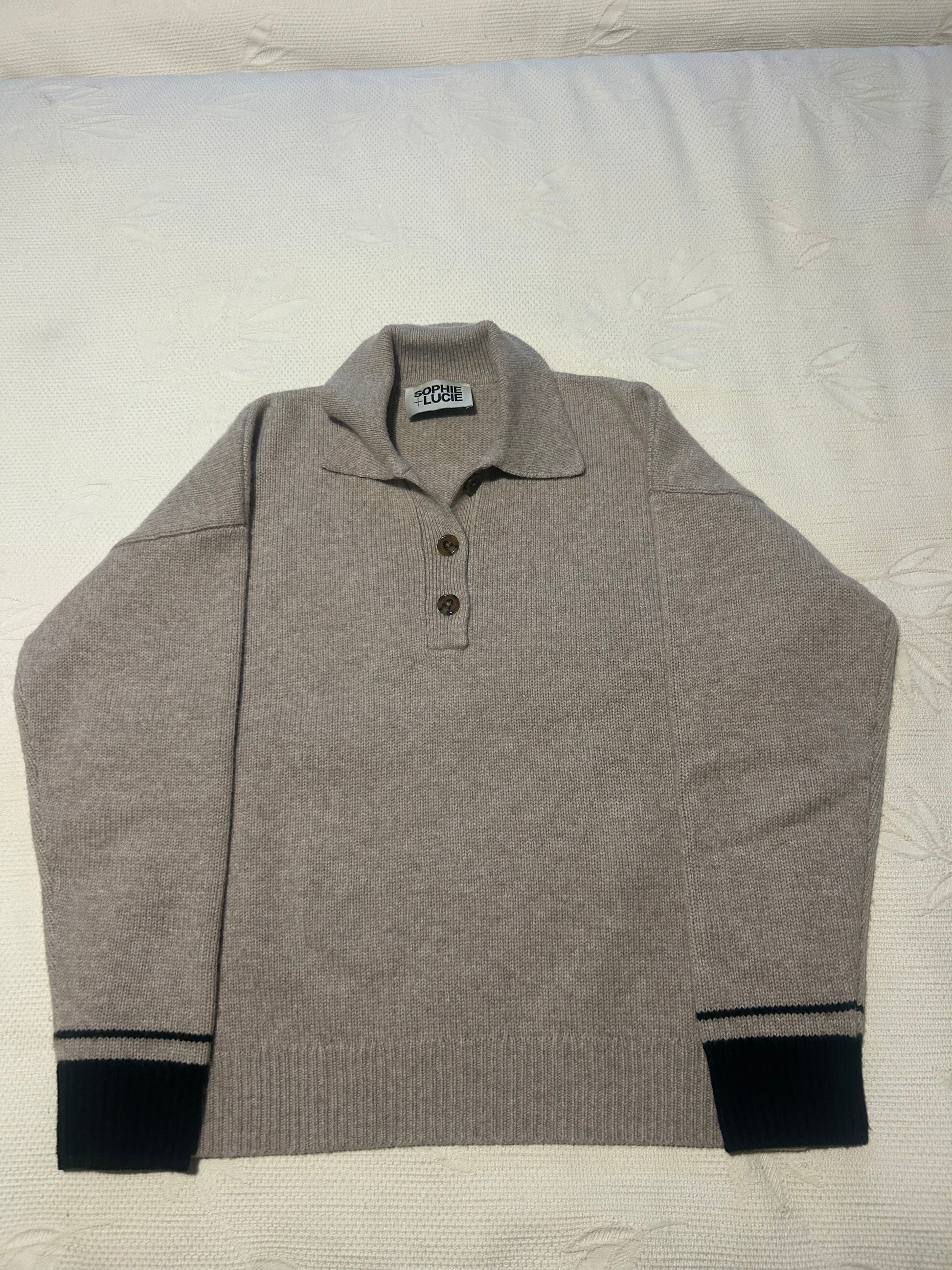 Jersey tejido en punto calado en fibras de lana merino y cashmere color beige. Jersey estilo polo de manga larga y puños acanalados en color negro. Cierre en el escote con botones.