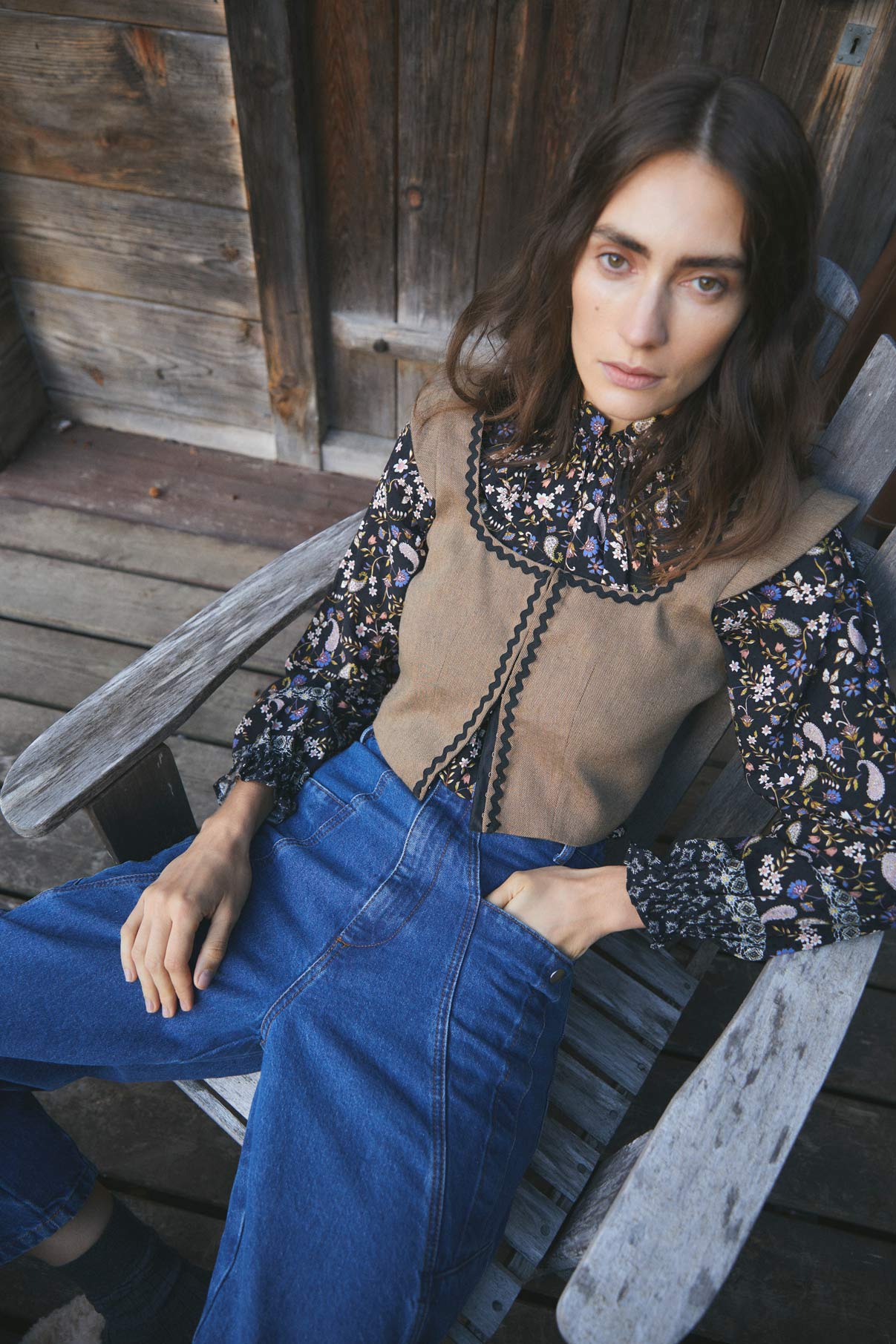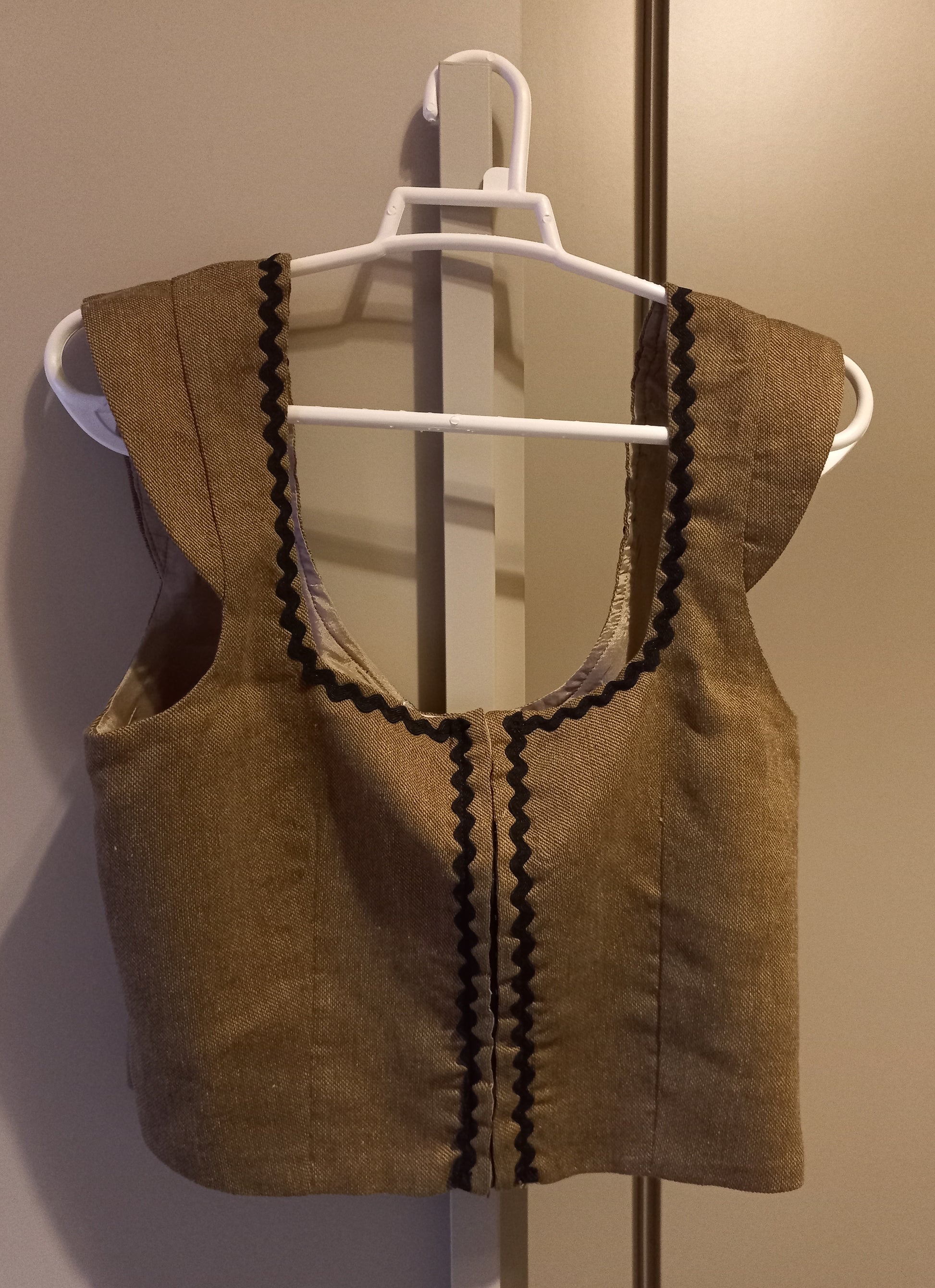 Corsé estilo rústico color beige. Escote cuadrado y cierre de busk en la parte frontal. Detalle de picunela negra en los bordes del escote y del cierre.