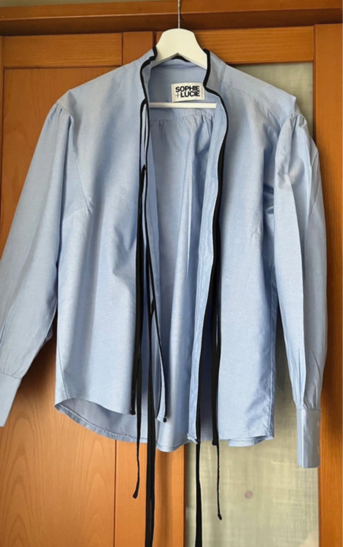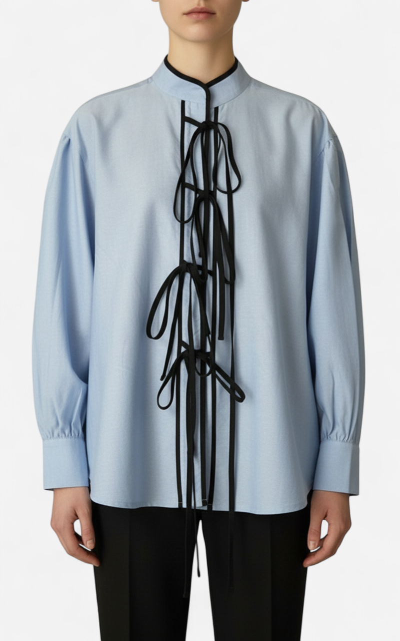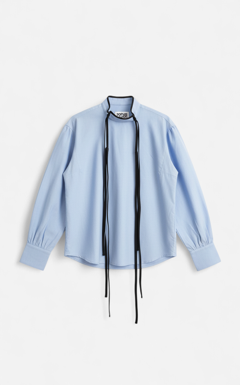 Déjate seducir por la elegancia sutil de esta blusa azul celeste. Su diseño de líneas puras, realzado por detalles en negro, te aportará un toque sofisticado y moderno. Confeccionada en suave algodón, esta prenda de manga larga y lazada frontal es perfecta para crear looks versátiles, del día a la noche, sin renunciar a la comodidad.