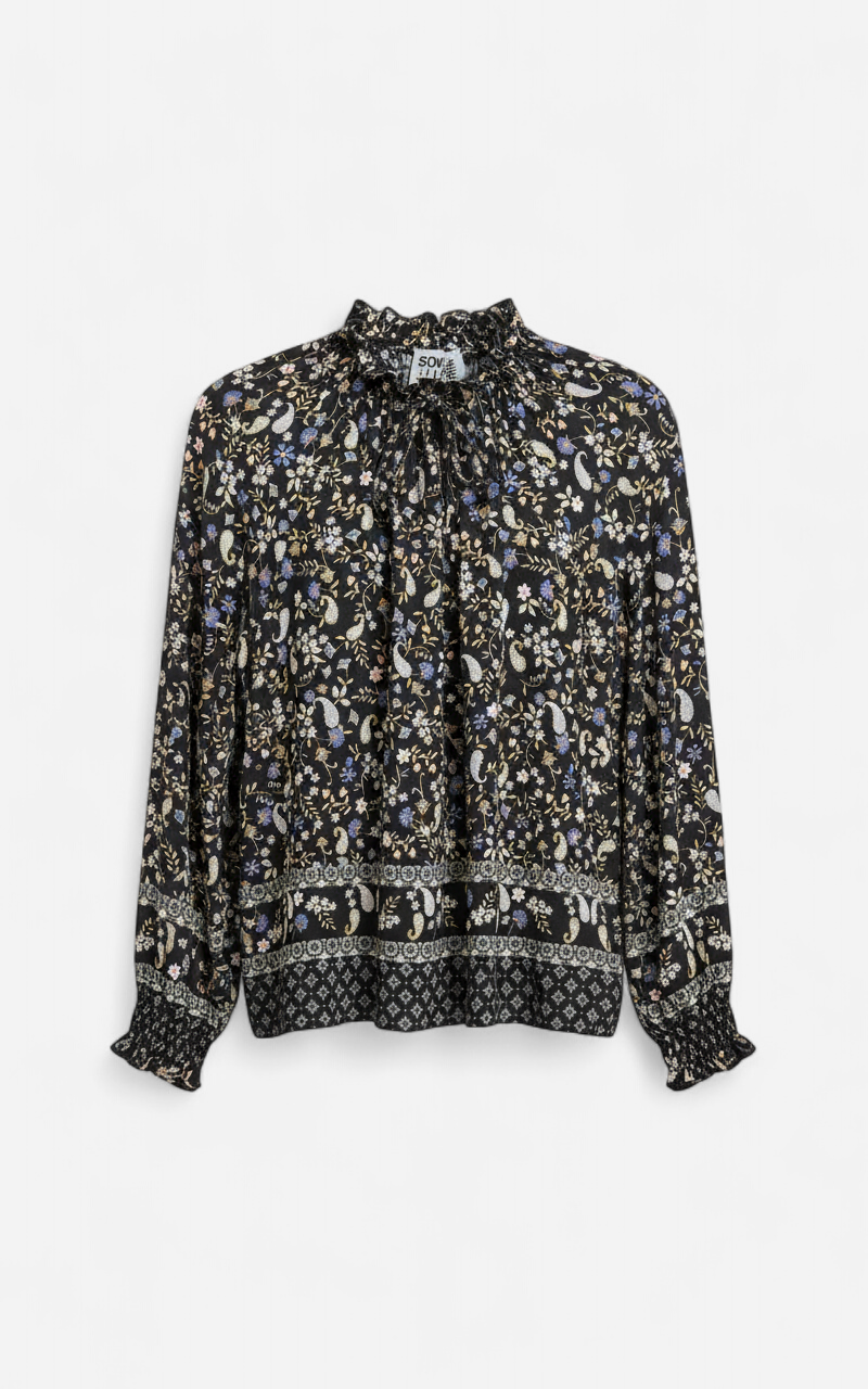 Déjate envolver por el encanto bohemio de esta blusa fluida de manga larga. Su estampado floral paisley en tonos suaves sobre fondo negro te transportará a un jardín secreto. Confeccionada en un tejido ligero y cómodo, cuenta con un cuello alto fruncido que realza tu silueta. Ideal para un look casual chic o para una noche especial.