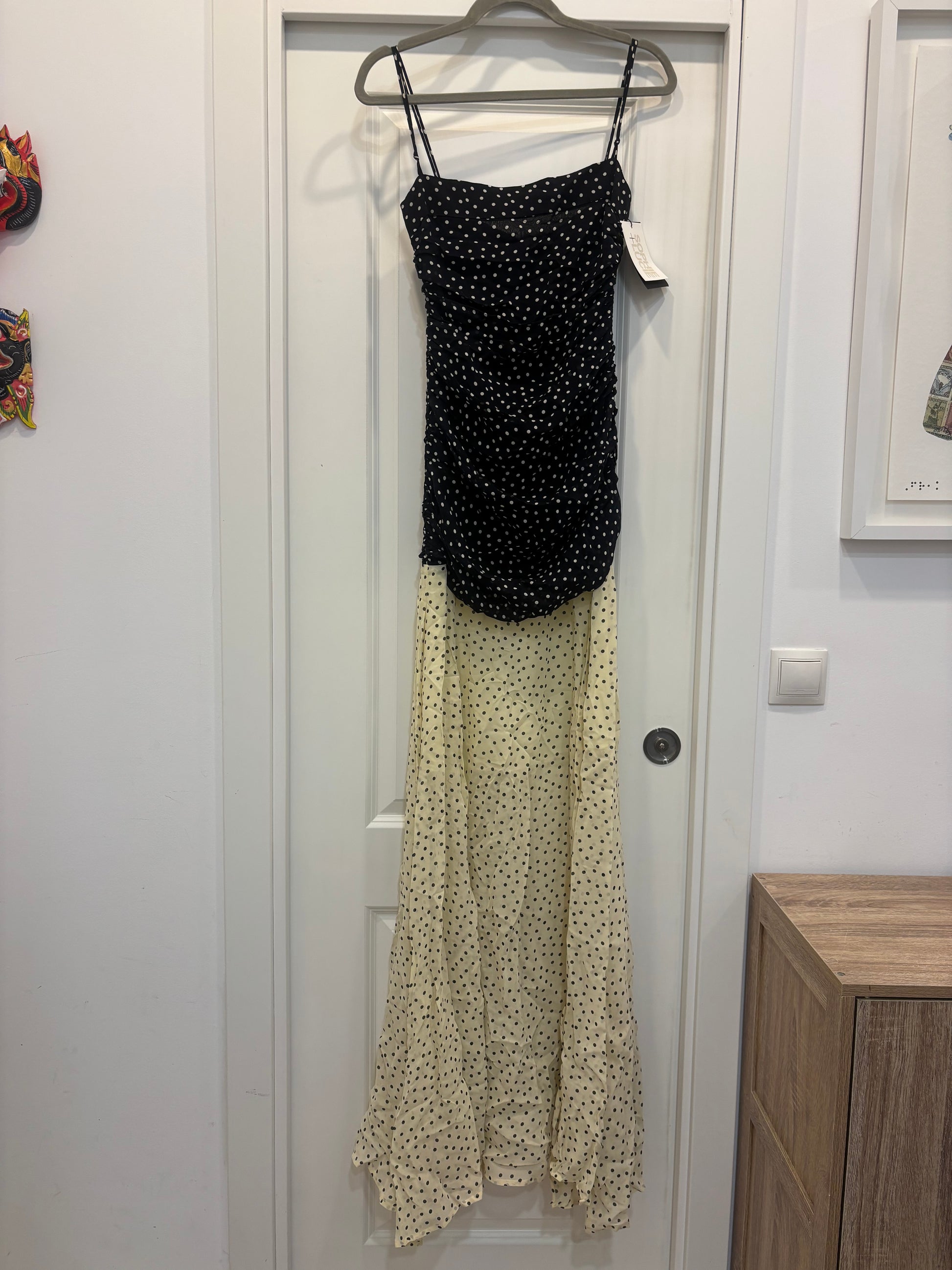 Déjate seducir por este vestido midi de ensueño. Su cuerpo negro con sutiles lunares blancos se funde en una falda fluida color crema, también salpicada de lunares. Ligero y femenino, este vestido de tirantes te acompañará desde una cena romántica hasta un paseo veraniego, aportando un toque de elegancia effortless a tu día a día.