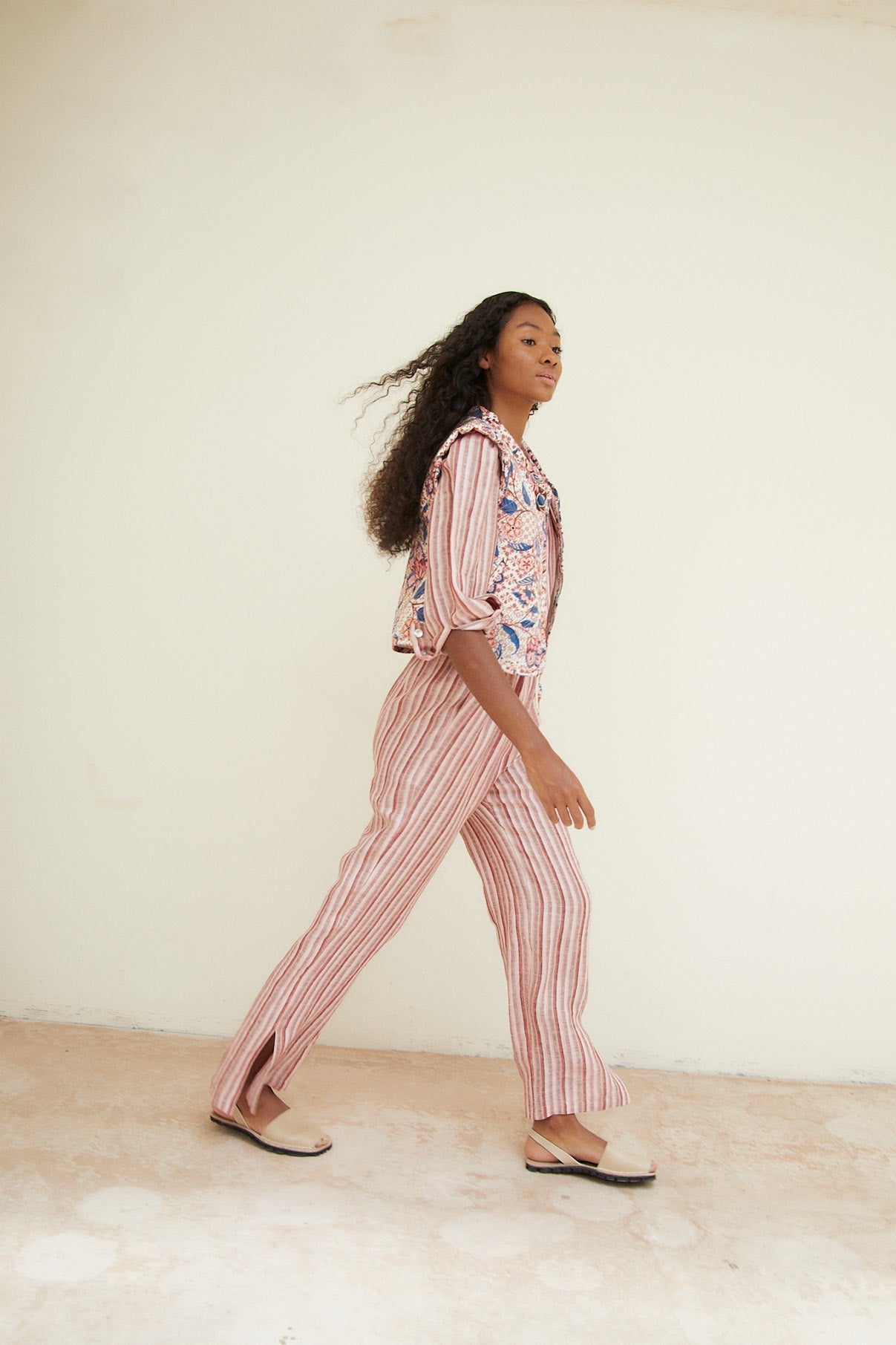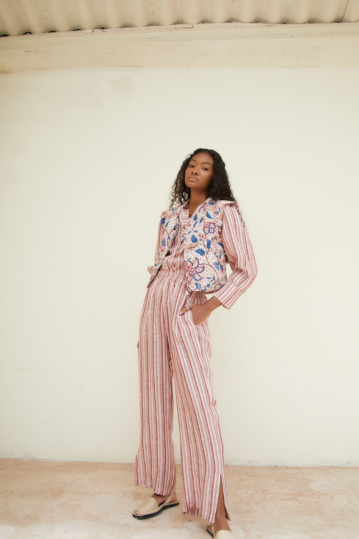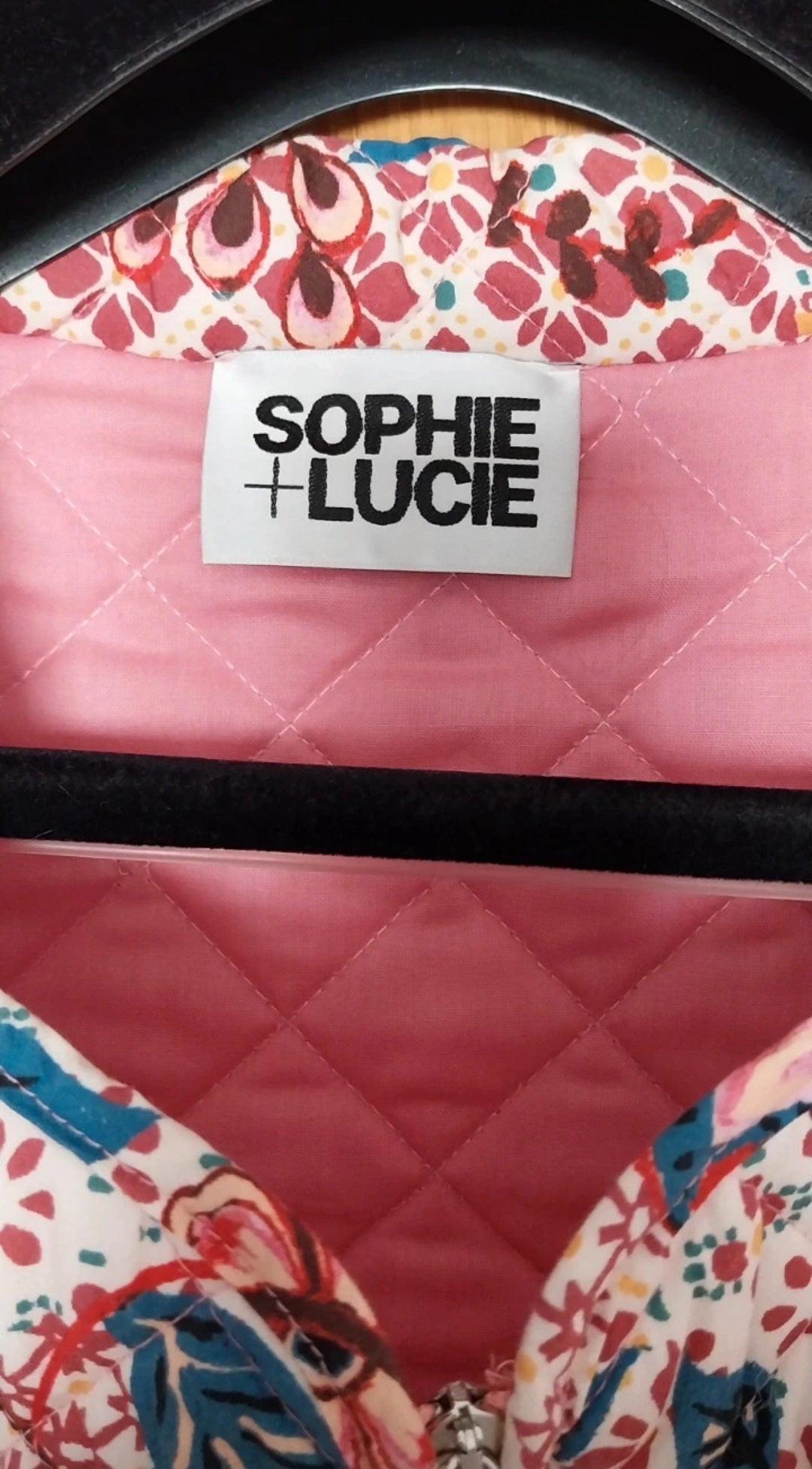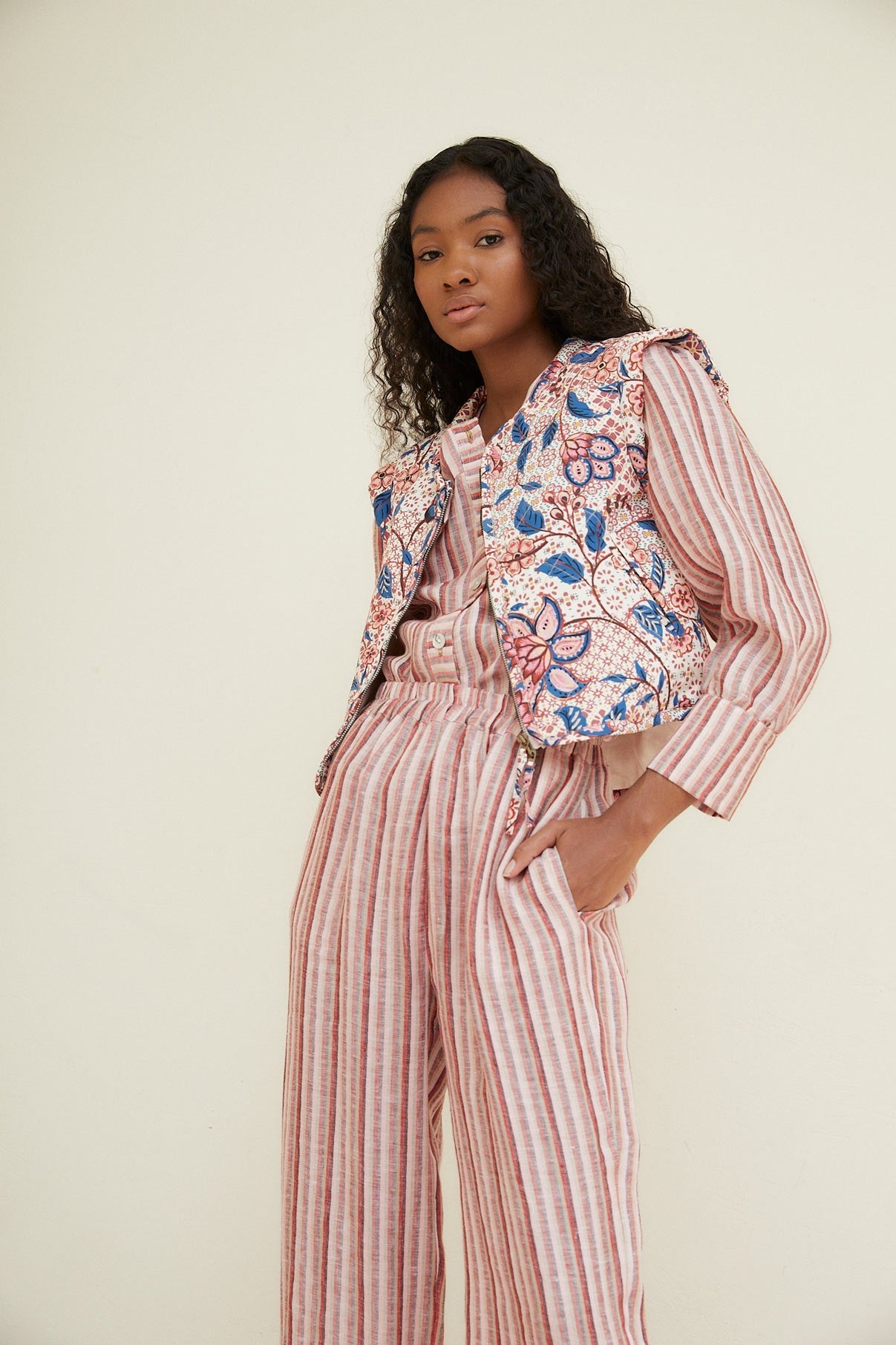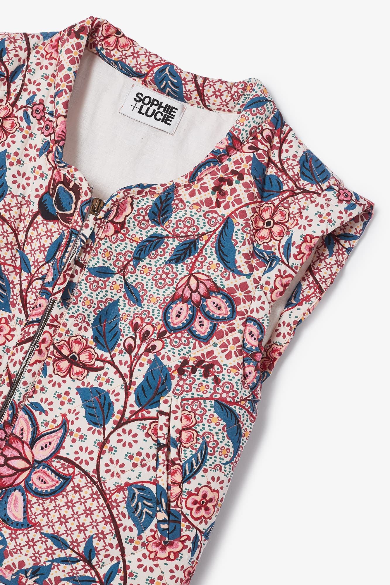 El chaleco Julieta es un chaleco acolchado tipo crop confeccionado en tejido crepé marroquí con estampado floral. Cuenta con dos bolsillos, uno a cada lado, y cierre frontal con cremallera central.