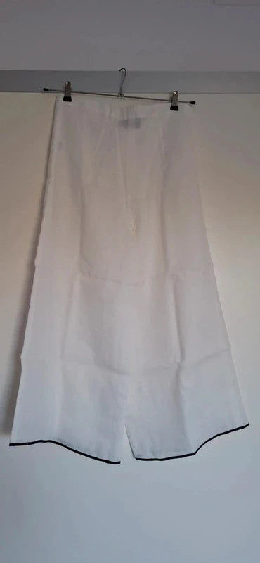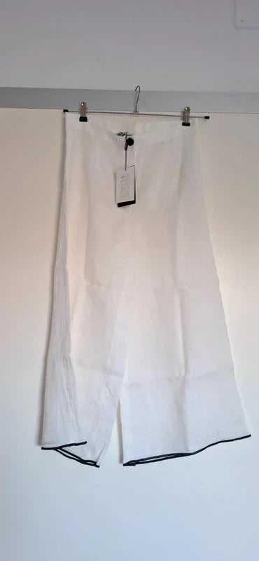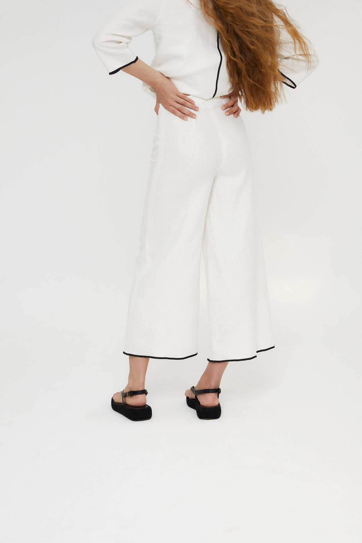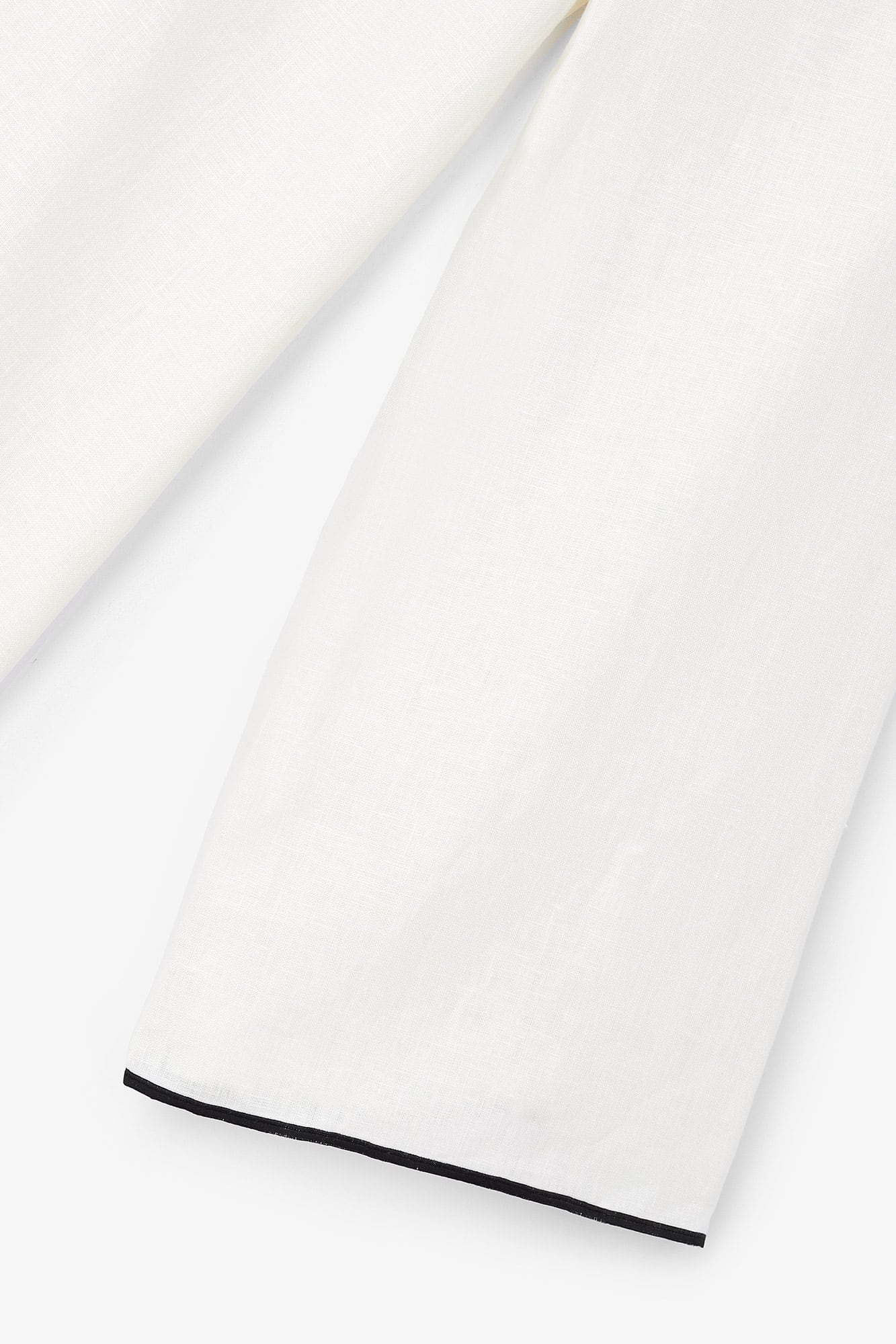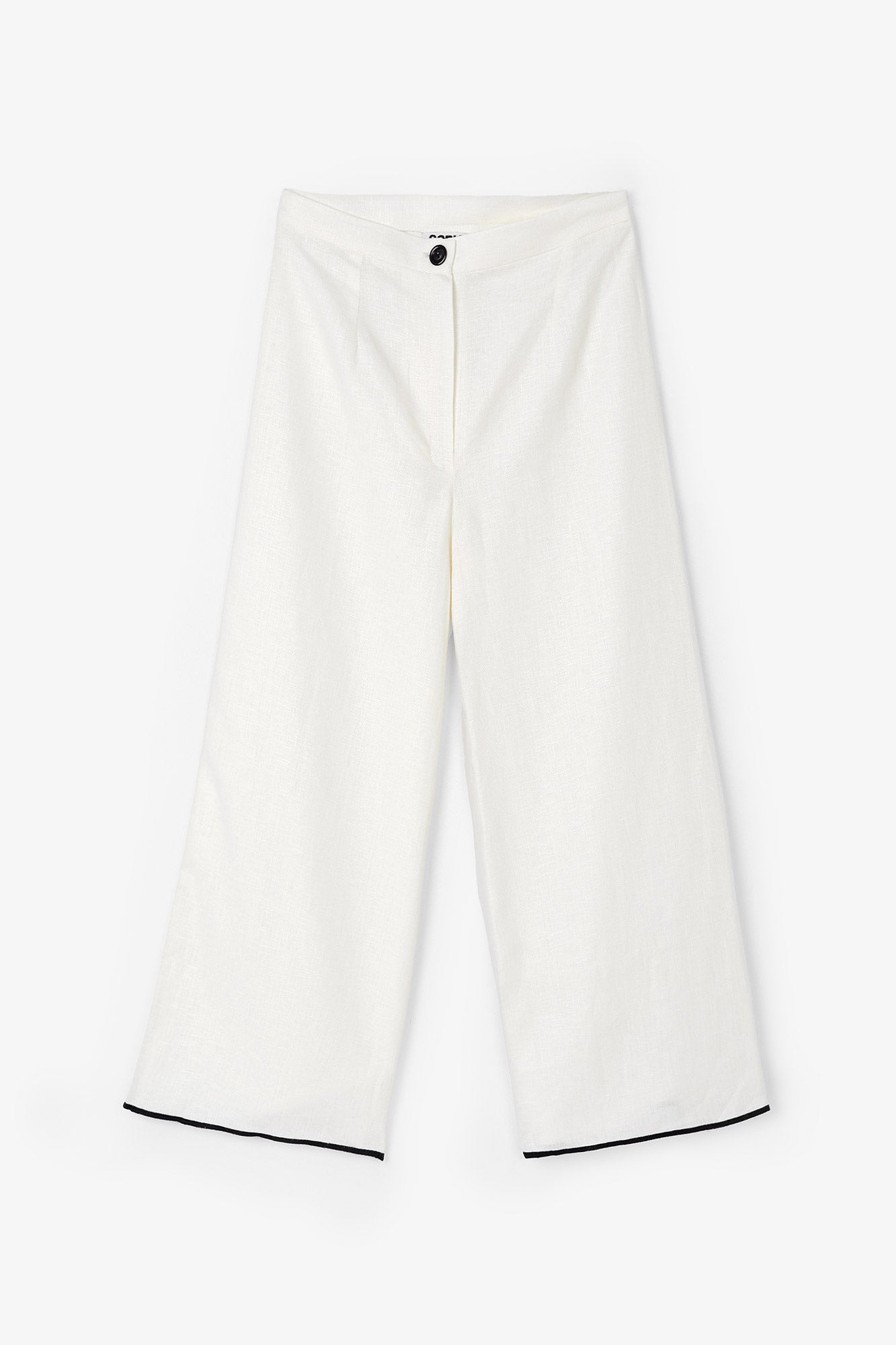 Pantalón 100% lino ancho con fit entallado en la cintura, acabado en un ligero evasé con linea bordada en color negro. Cierre con cremallera y botón.