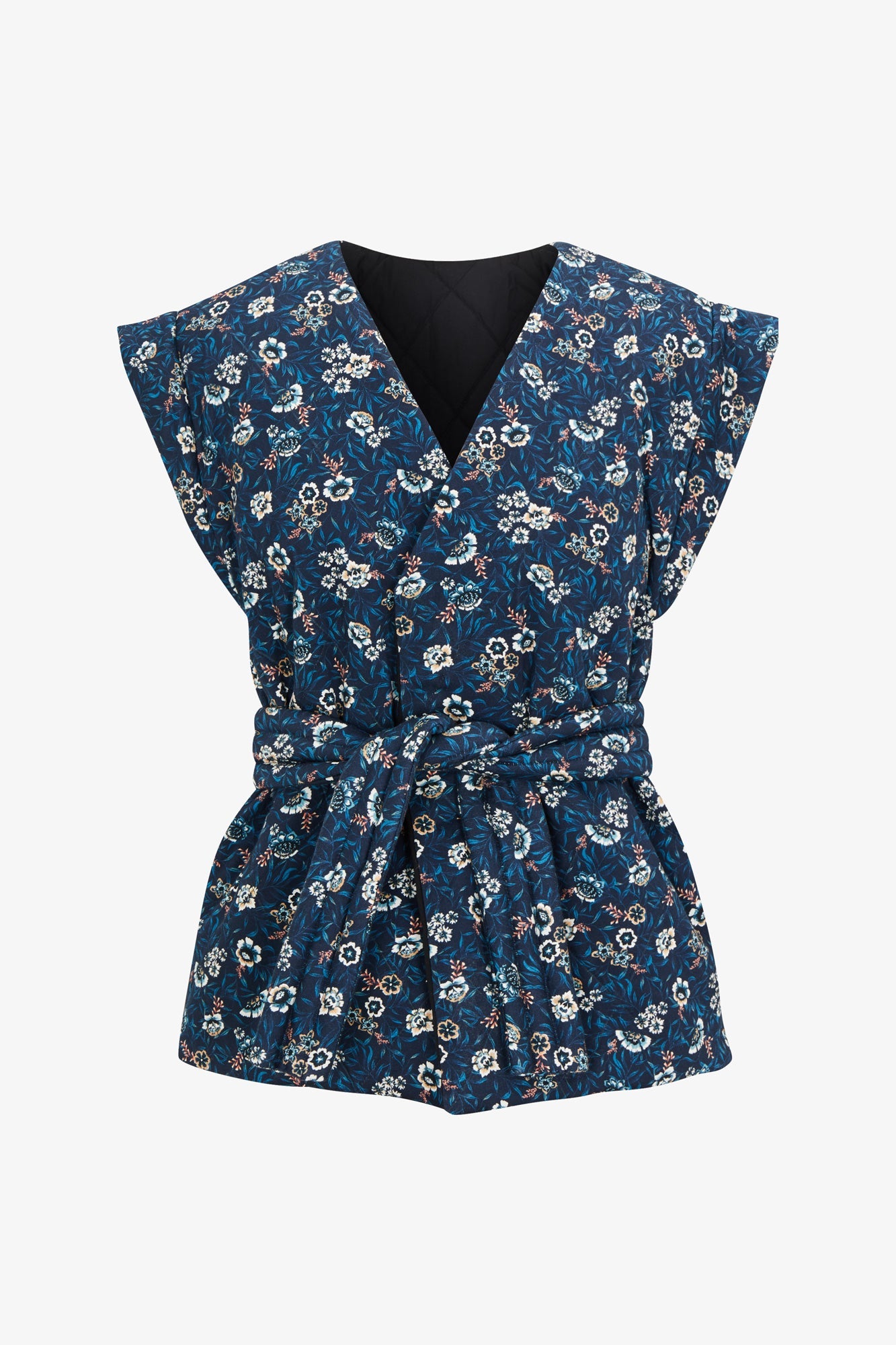 Re-editamos el chaleco que mas os ha gustado en nuevo estmpado. Es un chaleco acolchado y reversible, por un lado estampado de flores y por otro popelin negro. Sisa caida y largo de 70cm . Cierre con cinturón del mismo tejido.
