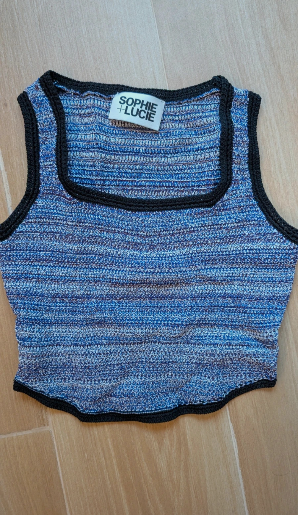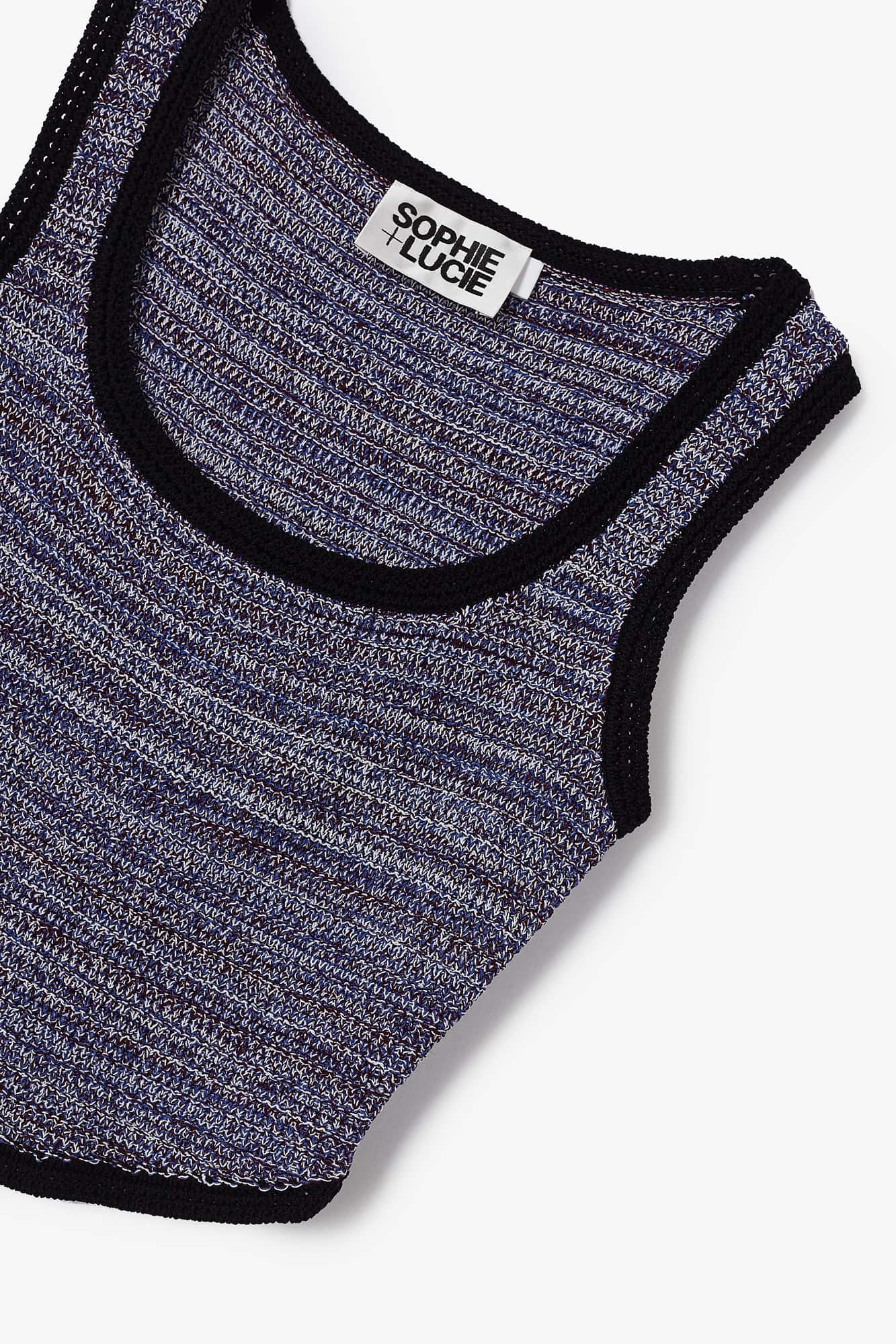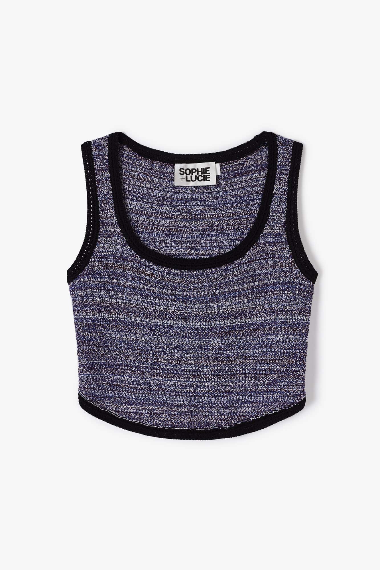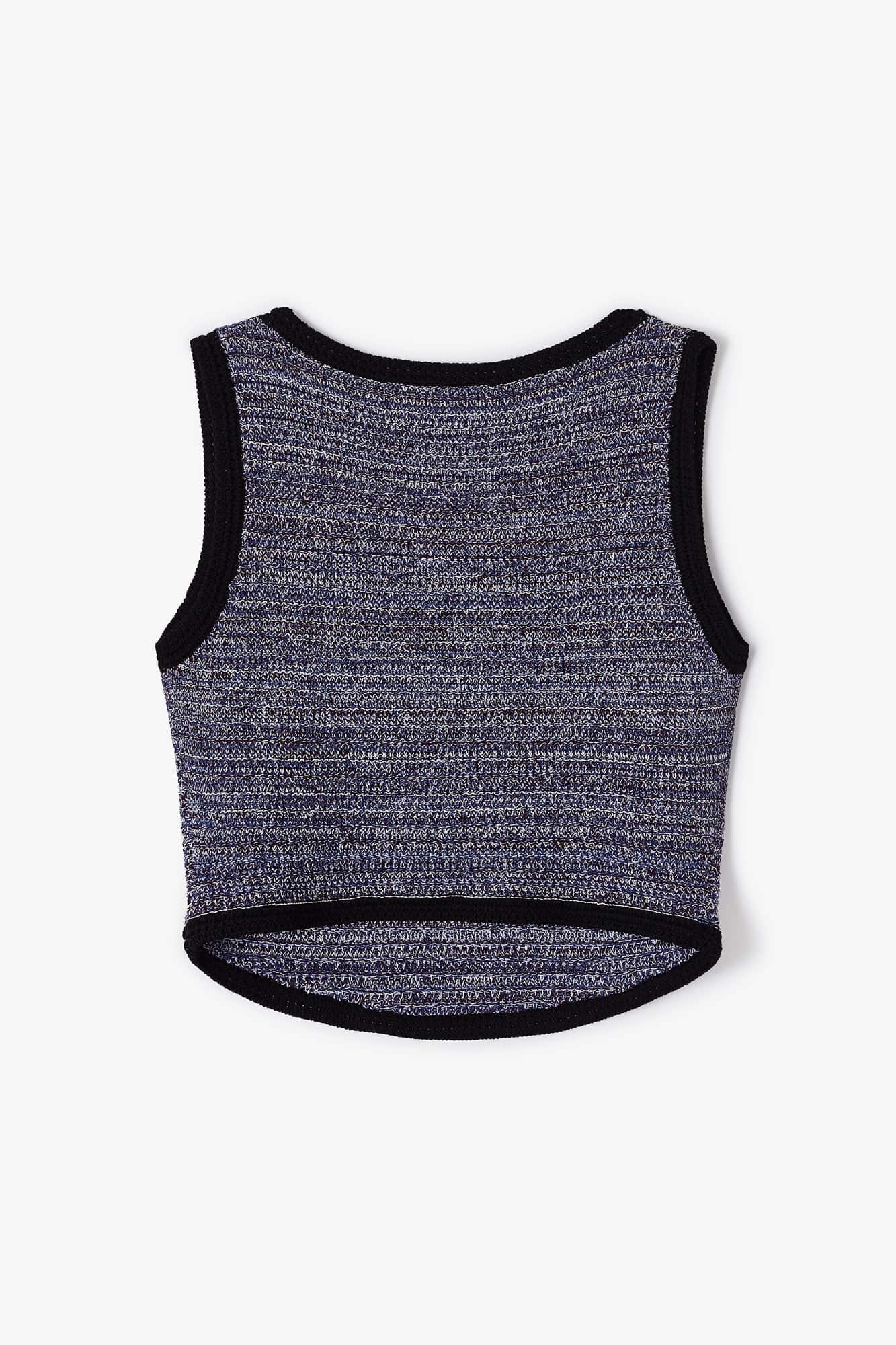 Top tipo crop, confeccionado en punto 100% algodón. Top de tirante y escote redondo en color morado, detalle de contorno en negro.