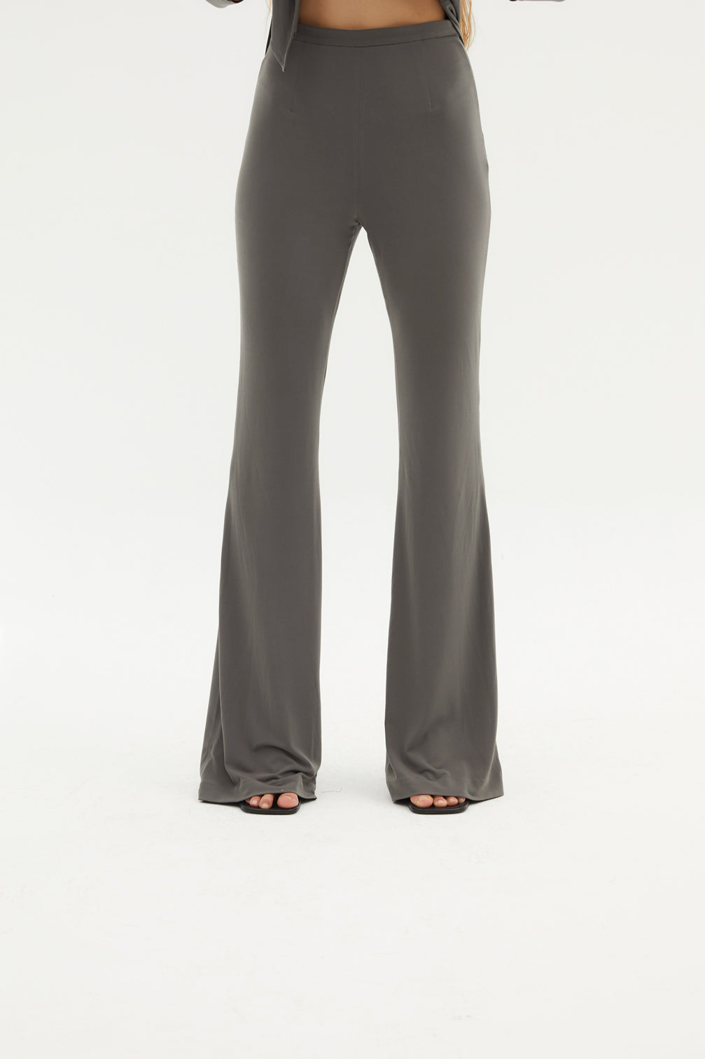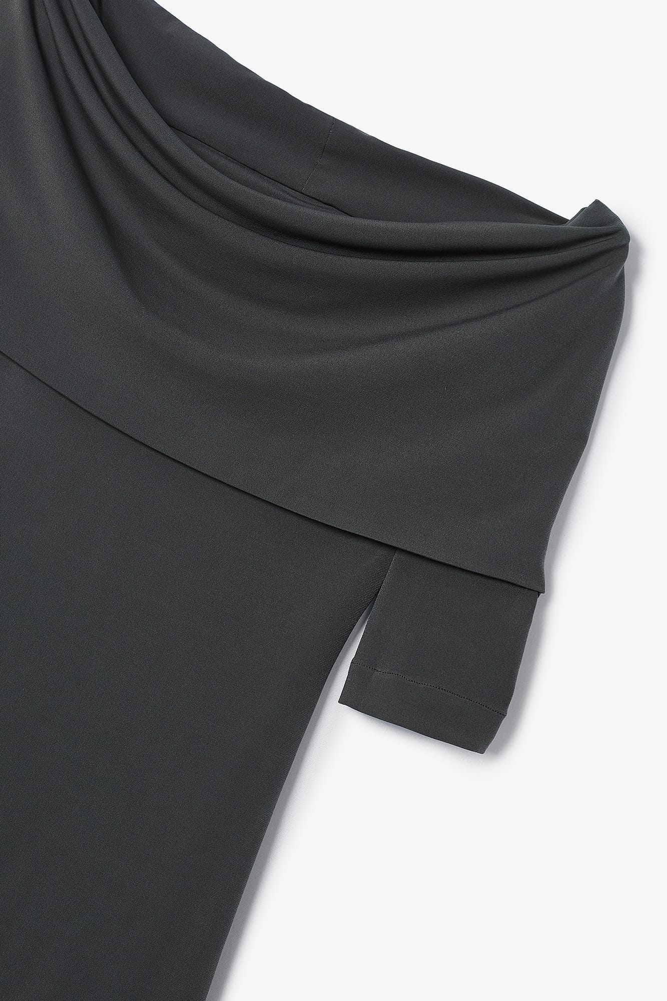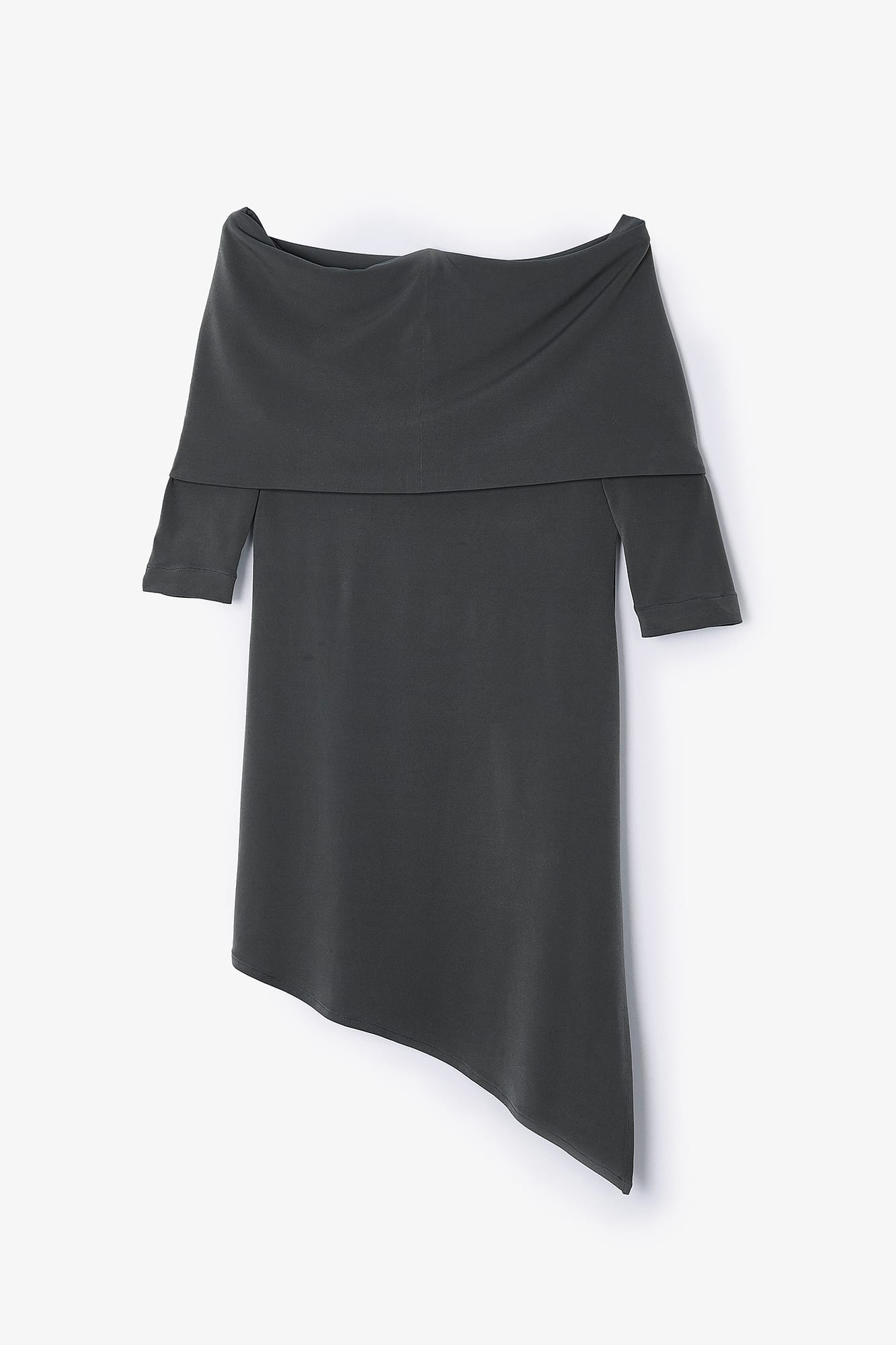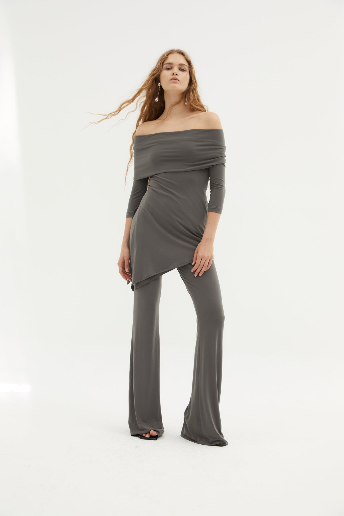 Total Look Giorgia color plomo, compuesto por una túnica confeccionada en un tejido liso de punto. Escote palabra de honor con posibles posiciones y manga 3/4 ajustada. Caída asimétrica y fluida. Caída asimétrica y fluida. Y pantalón de tiro alto confeccionado en punto con bajos acampanados.