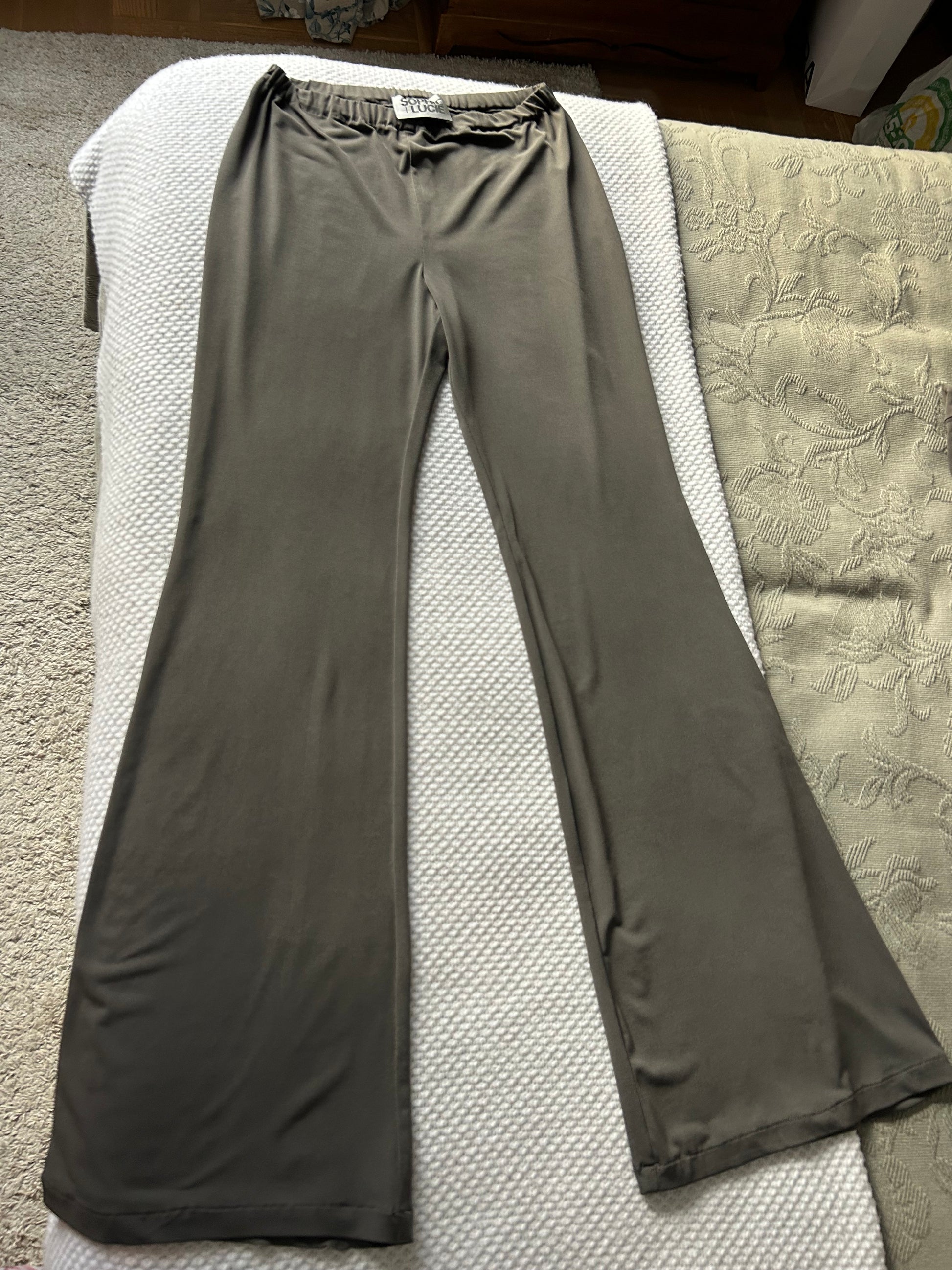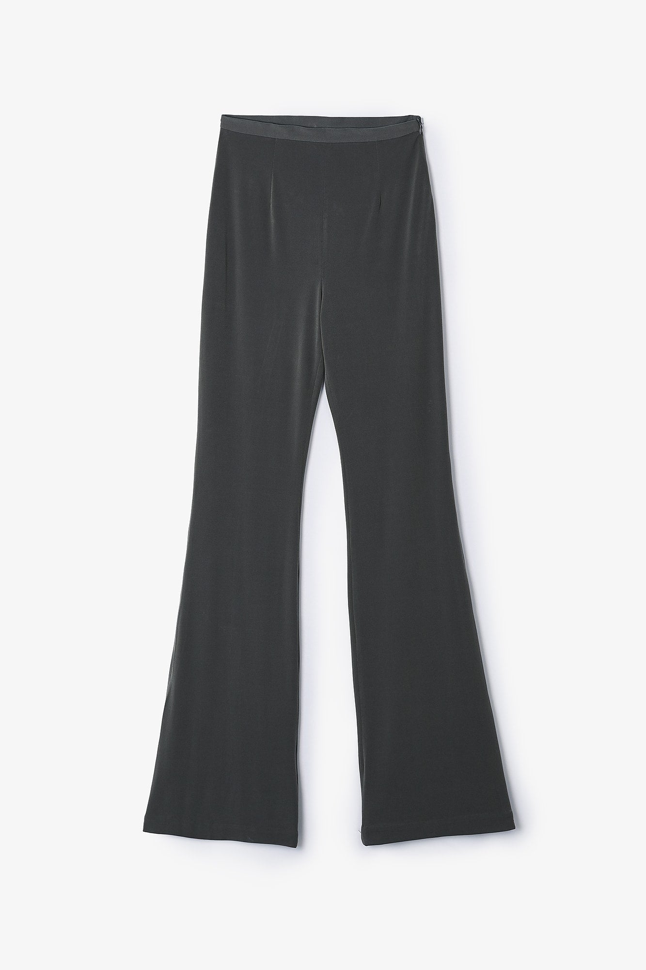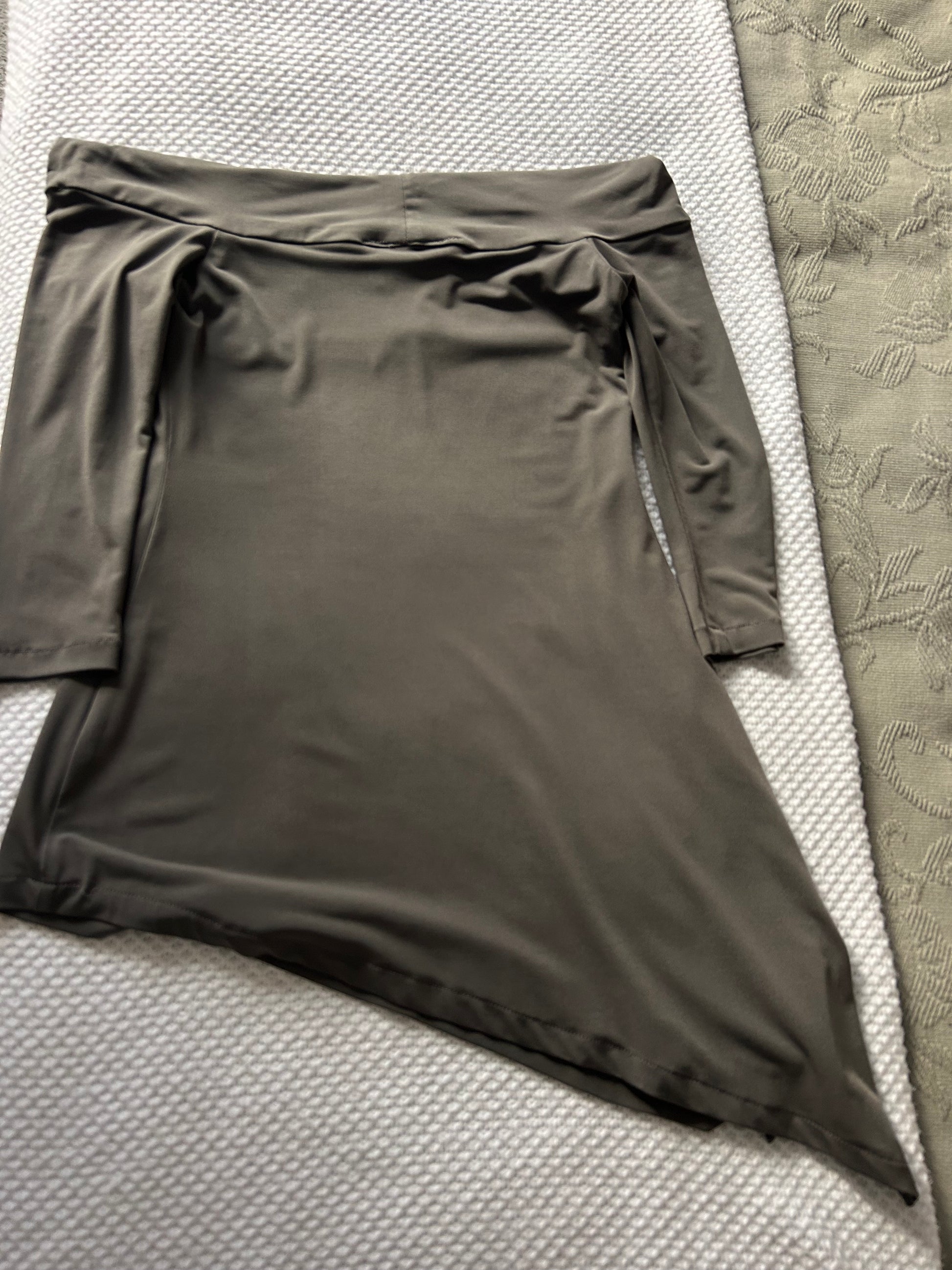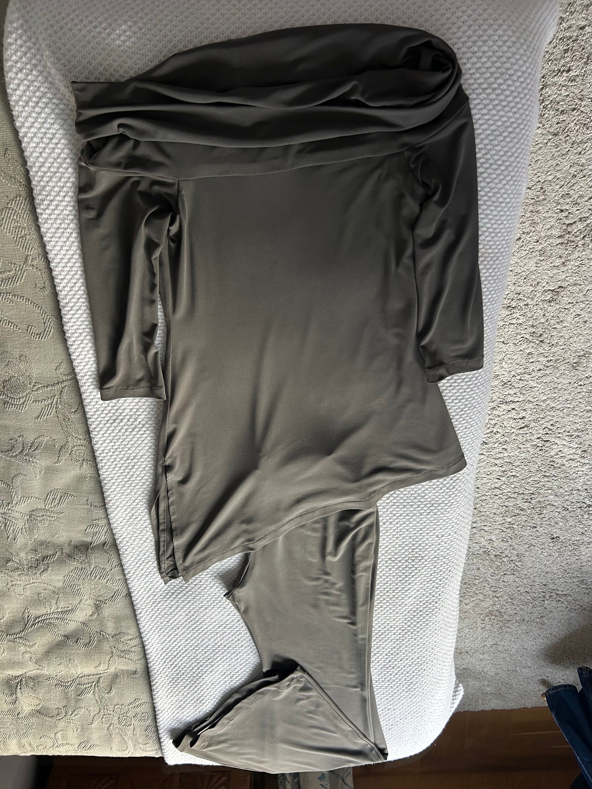 Total Look Giorgia color plomo, compuesto por una túnica confeccionada en un tejido liso de punto. Escote palabra de honor con posibles posiciones y manga 3/4 ajustada. Caída asimétrica y fluida. Caída asimétrica y fluida. Y pantalón de tiro alto confeccionado en punto con bajos acampanados.