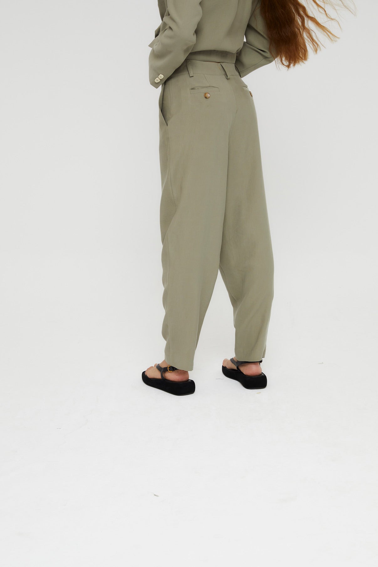 Total Look compuesto por una blazer y un pantalón en color verde kaki; Blazer crop cruzada cuello solapa, hombro marcado y manga larga terminada con dos botones. Bolsillos delanteros con solapa y cierre mediante doble botonadura frontal; y pantalón recto oversize. Cintura con trabillas. Bolsillos en los laterales y detalle de bolsillos simulados con botones en la parte trasera. Cierre con botón y cremallera en la parte frontal.